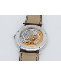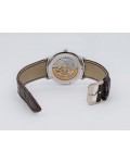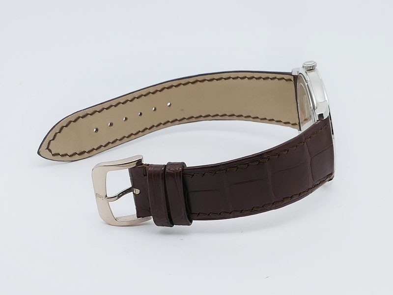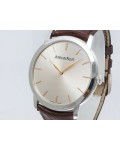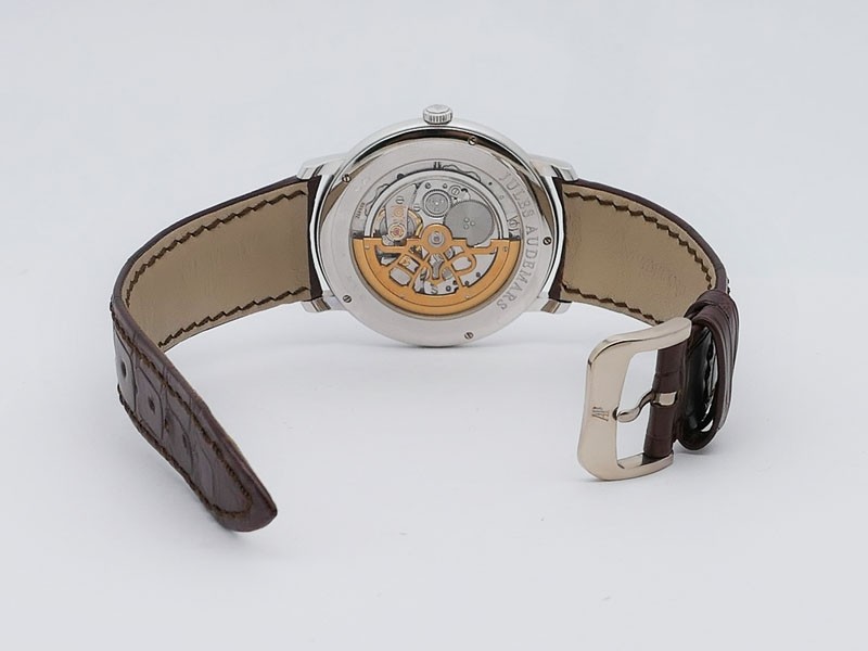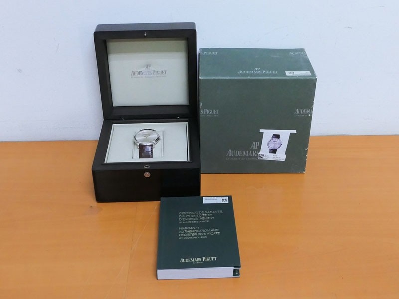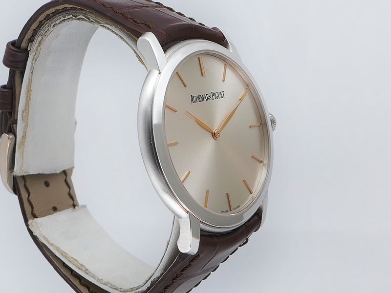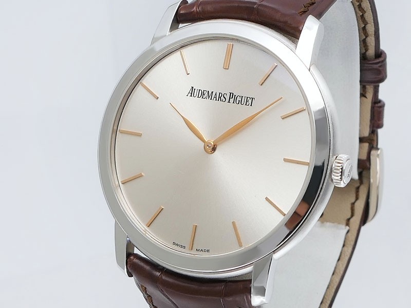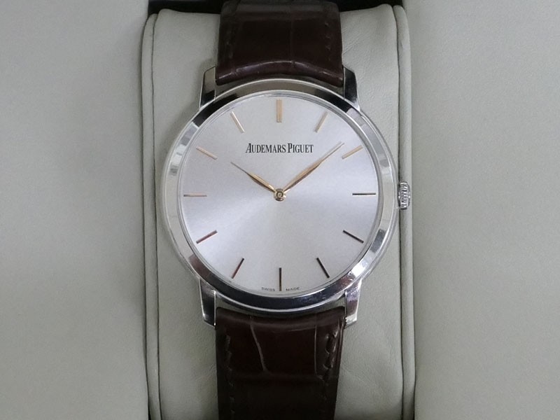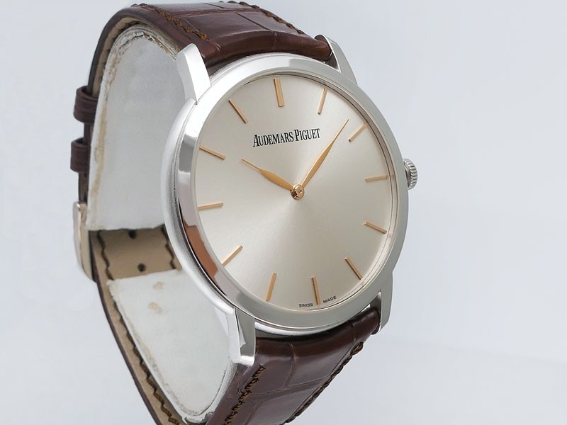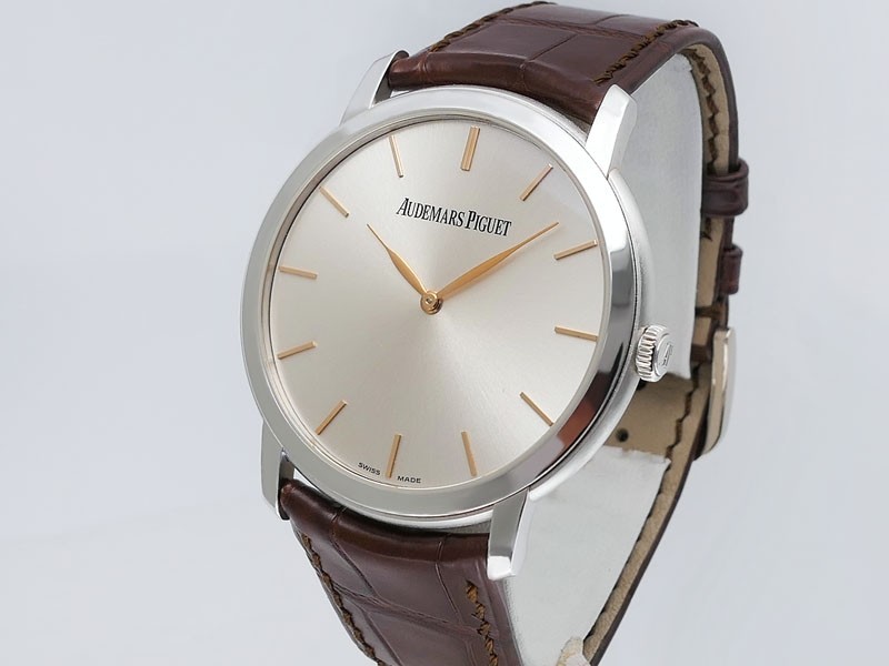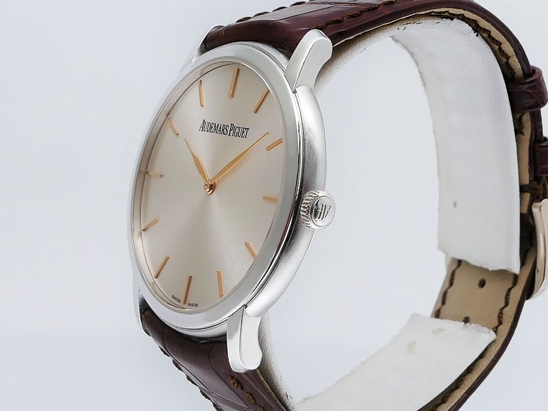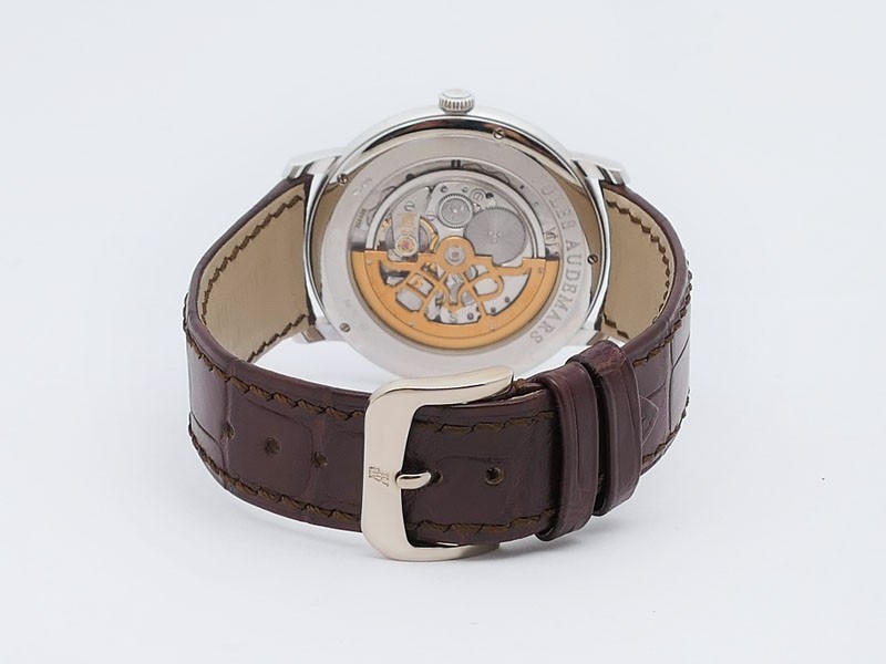 Swiss made Jules Audemars Ultra-Thin polished/brushed 18k White Gold round shaped case, power reserve to ± 40h.Time only Silver metallic sunburst dial. Hand-stitched brown alligator leather strap/18k White Gold tang buckle.| Brand | Audemars Piguet |
