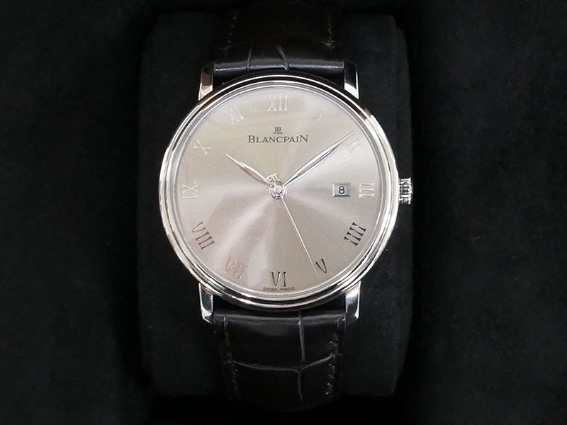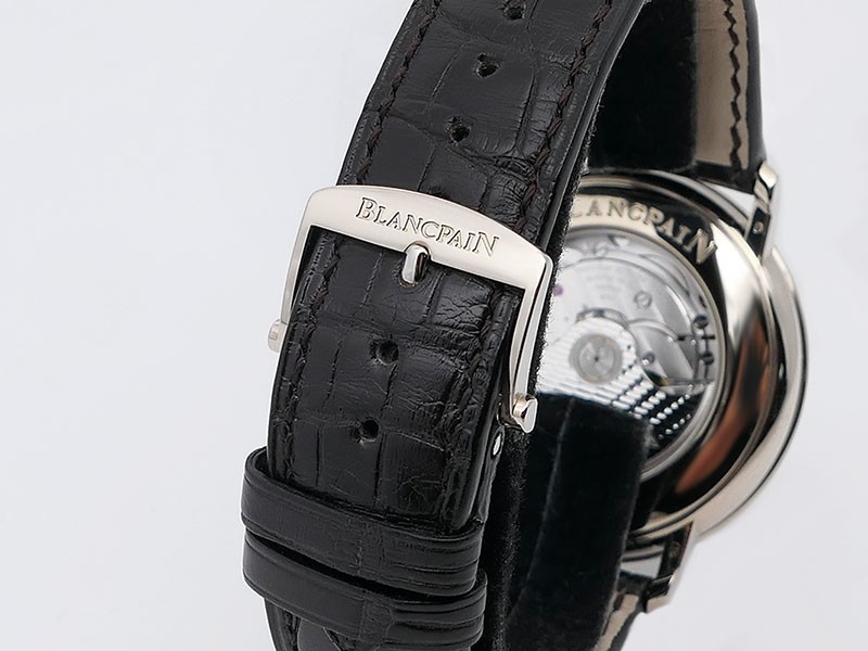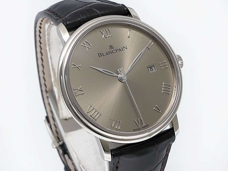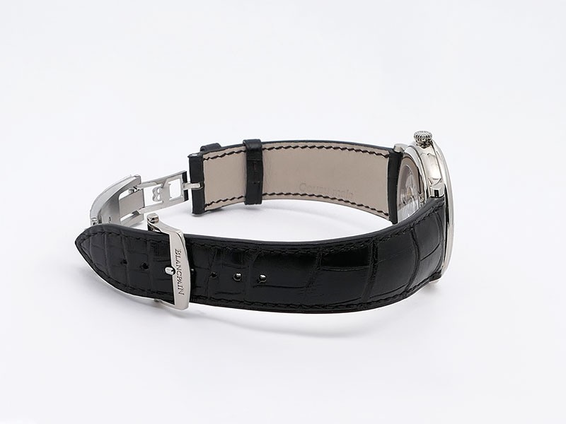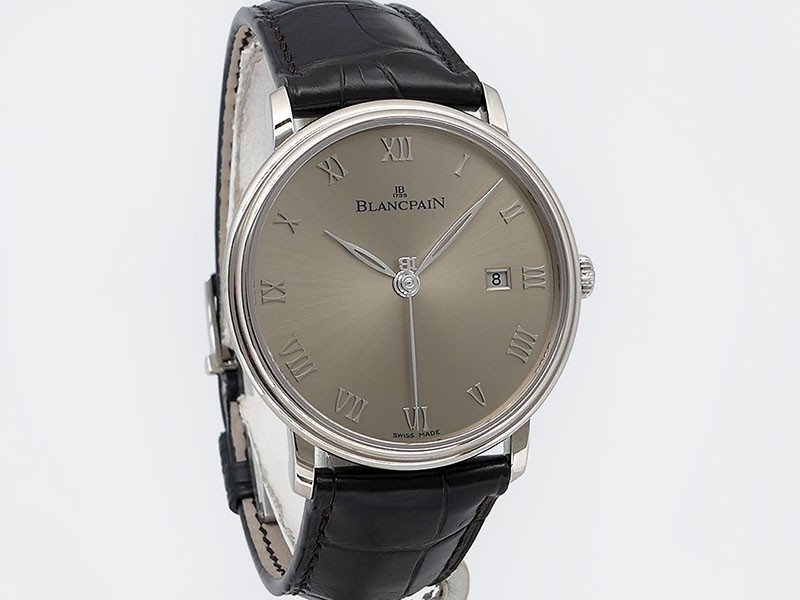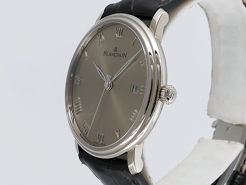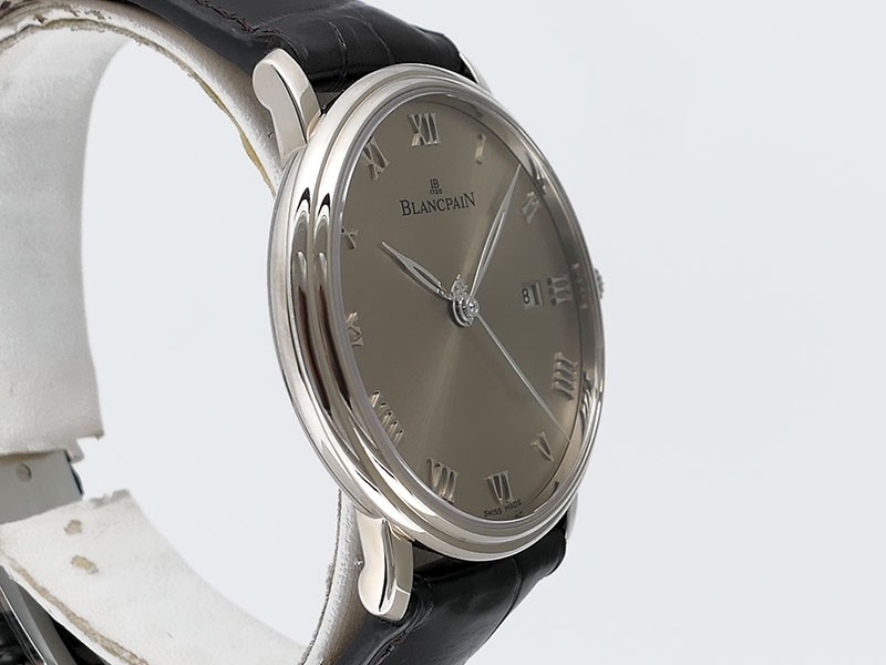 Swiss made Villeret Ultra Slim 18k White Gold round shaped case, power reserve up to ± 100h Light Grey very fine brushed sunburst finish dial, Date. Black leather strap/Blancpain 18k White gold Deployment Buckle.| Brand | Blancpain |