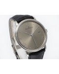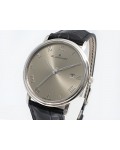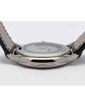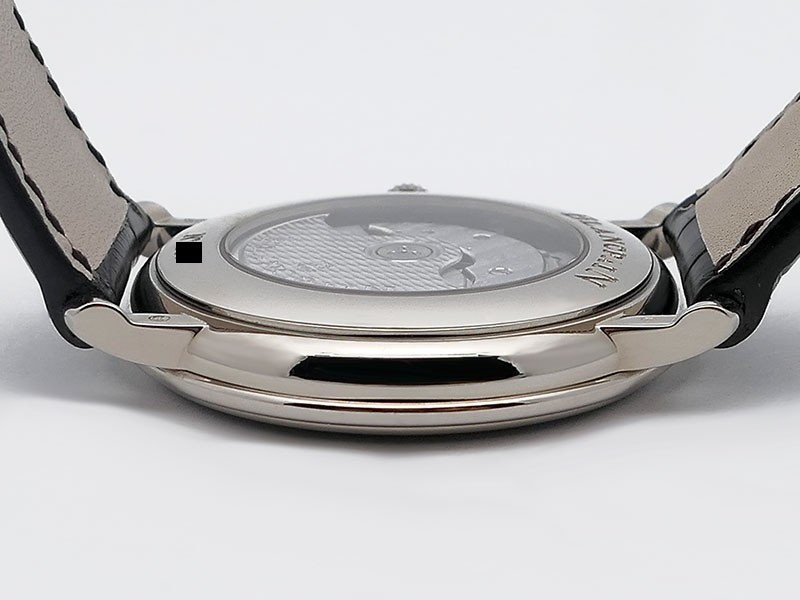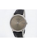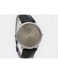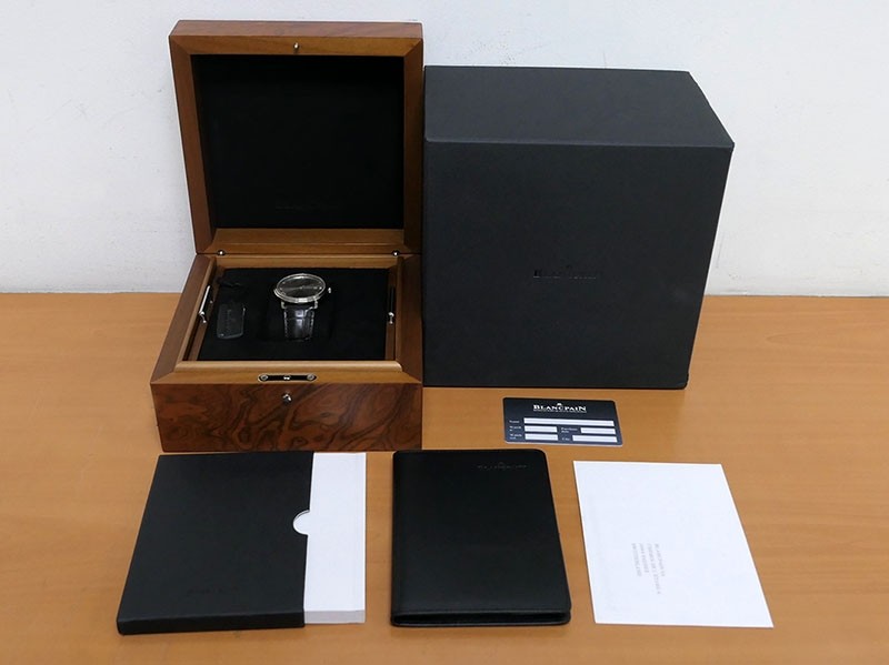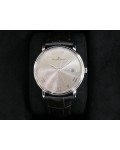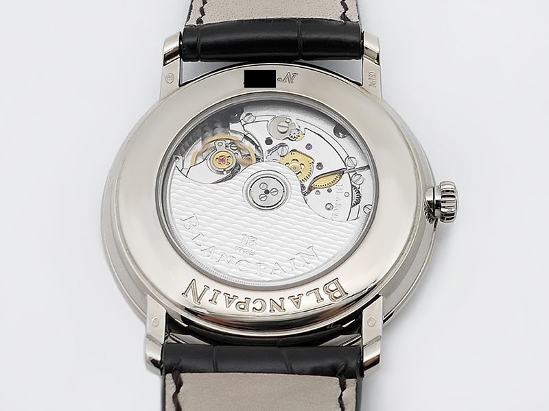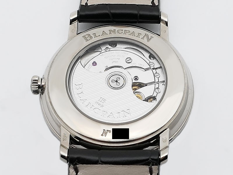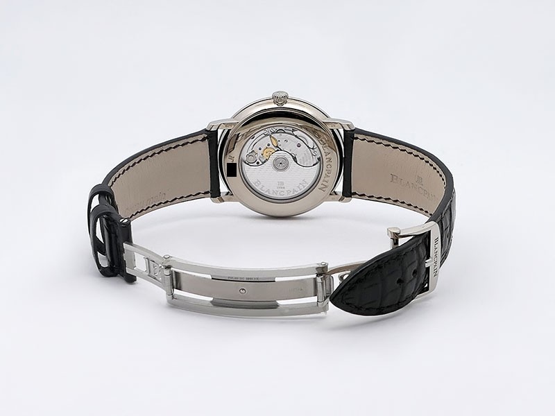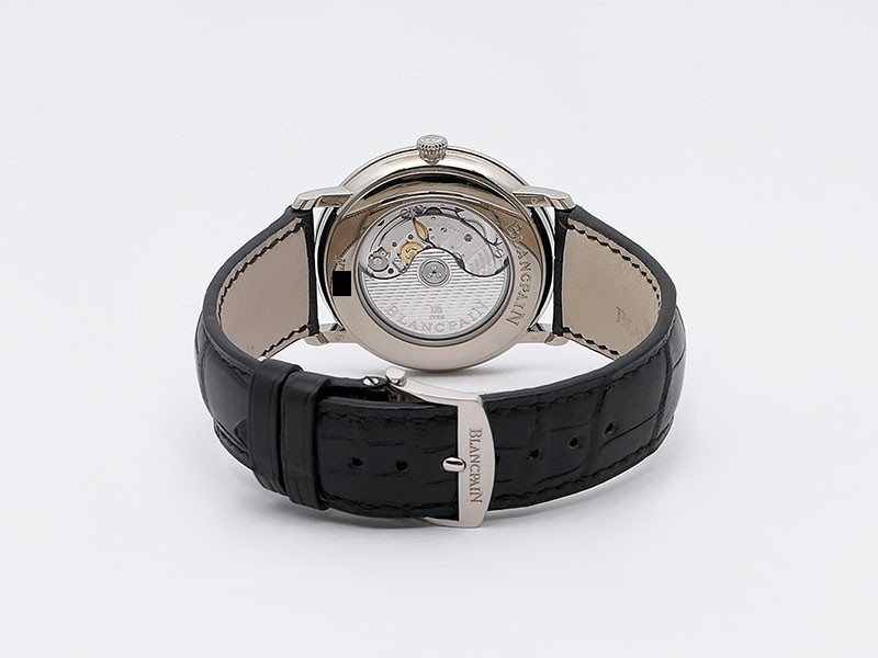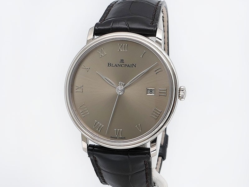 Swiss made Villeret Ultra Slim 18k White Gold round shaped case, power reserve up to ± 100h Light Grey very fine brushed sunburst finish dial, Date. Black leather strap/Blancpain 18k White gold Deployment Buckle.| Brand | Blancpain |