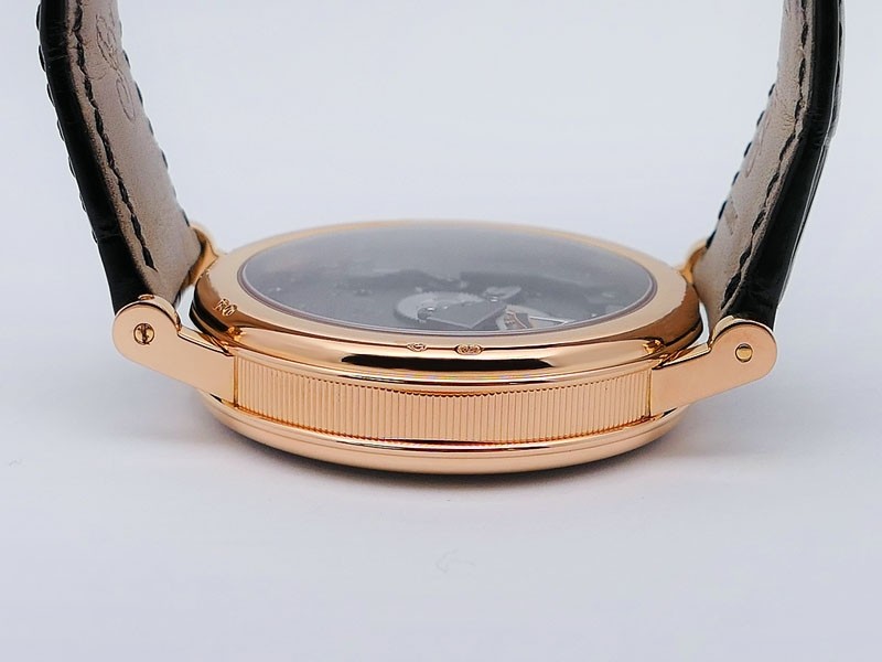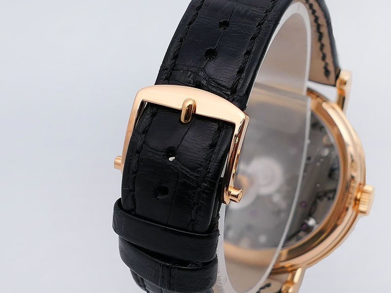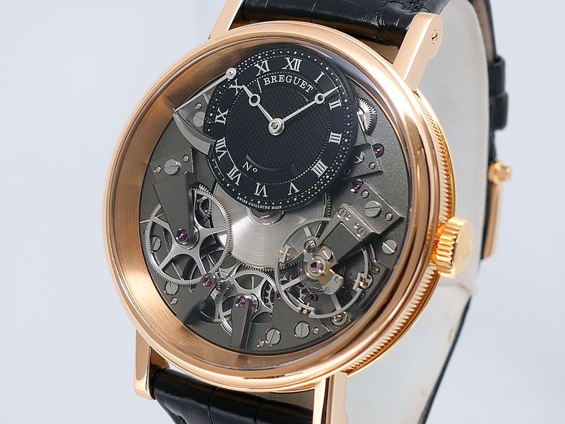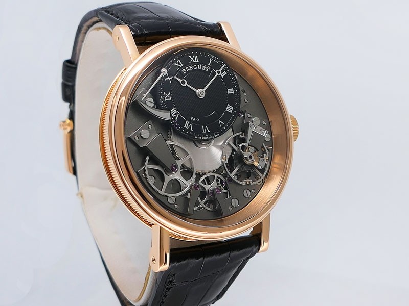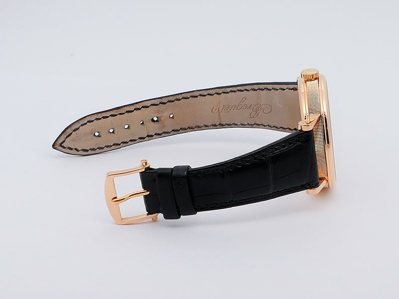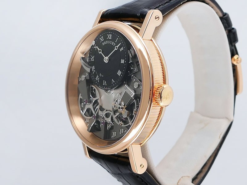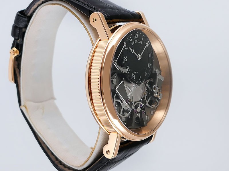 Swiss made Tradition Power Reserve18k Rose Gold solid three-body round shaped case/knurl edge fluted coin band, reserve to ± 50h. Displays an open dial/ displays movement, retrograde power reserve. Black leather strap with Rose Gold Tang Buckle.| Brand | Breguet |
