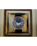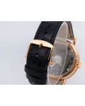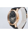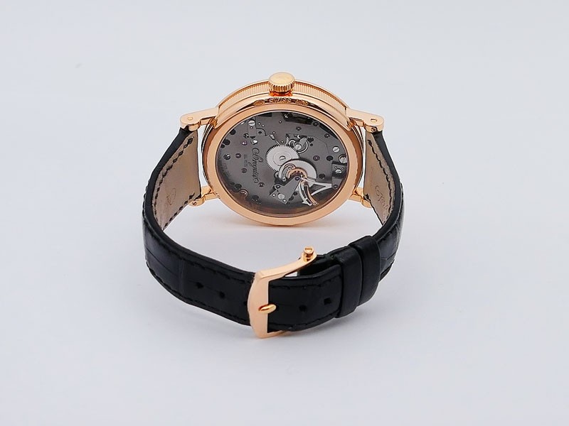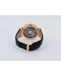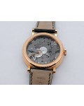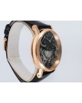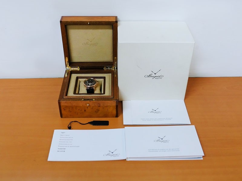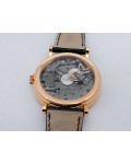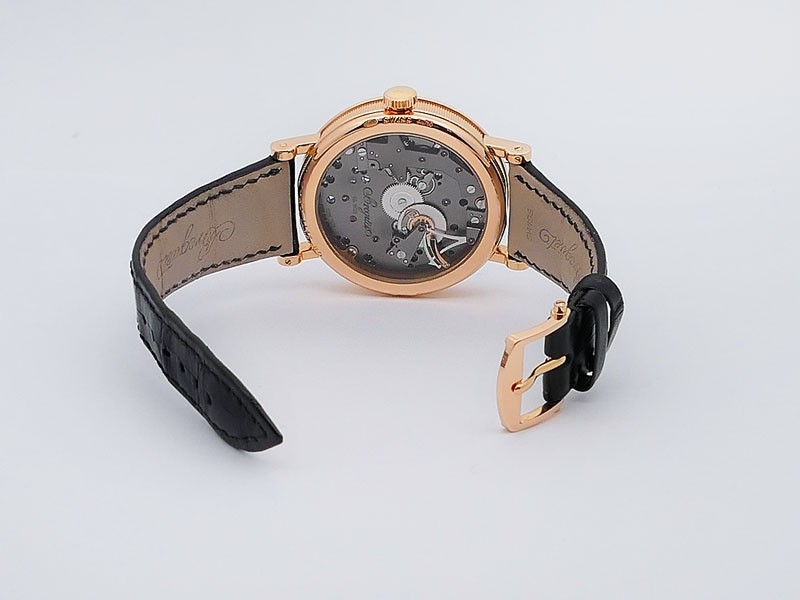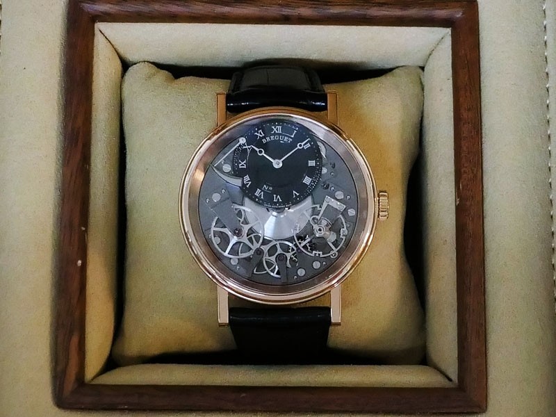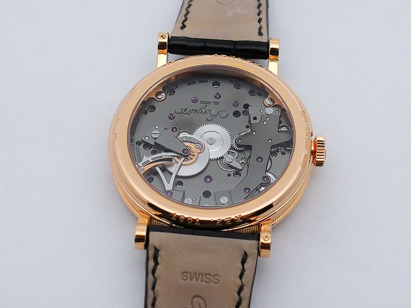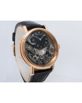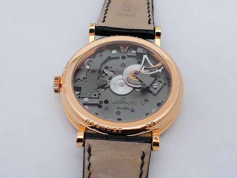 Swiss made Tradition Power Reserve18k Rose Gold solid three-body round shaped case/knurl edge fluted coin band, reserve to ± 50h. Displays an open dial/ displays movement, retrograde power reserve. Black leather strap with Rose Gold Tang Buckle.| Brand | Breguet |