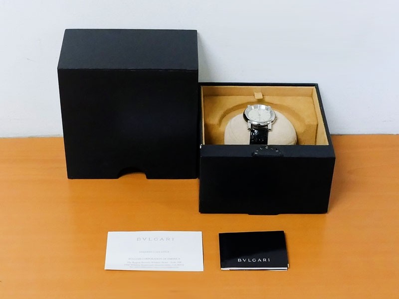 Swiss made 1990s Anfiteatro AT 35 PL AUT in two parts Platinum round shape case, Inner ring engraved/Bvlgari. Bvlgari. reserve to 40h. Silver dial w/ Applied Roman & hour batons. Black Bvlgari Alligator Strap with Platinum Tang buckle..| Brand | Bulgari |