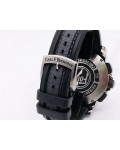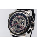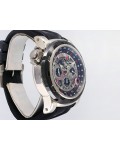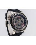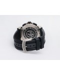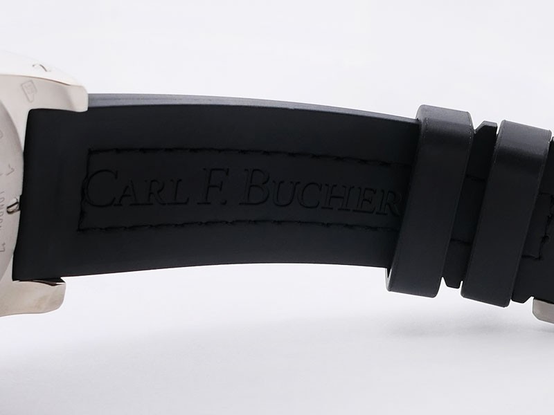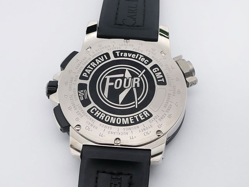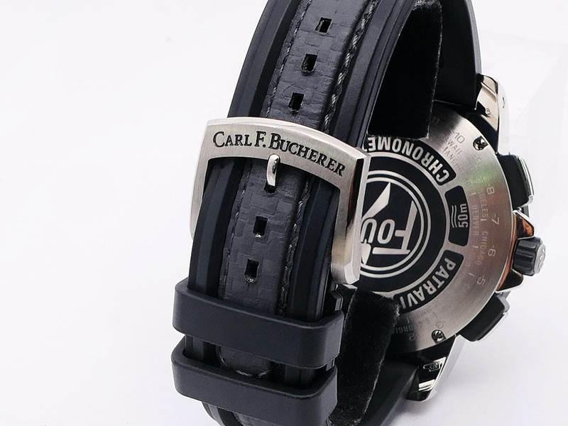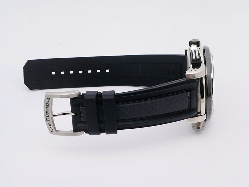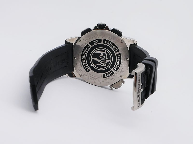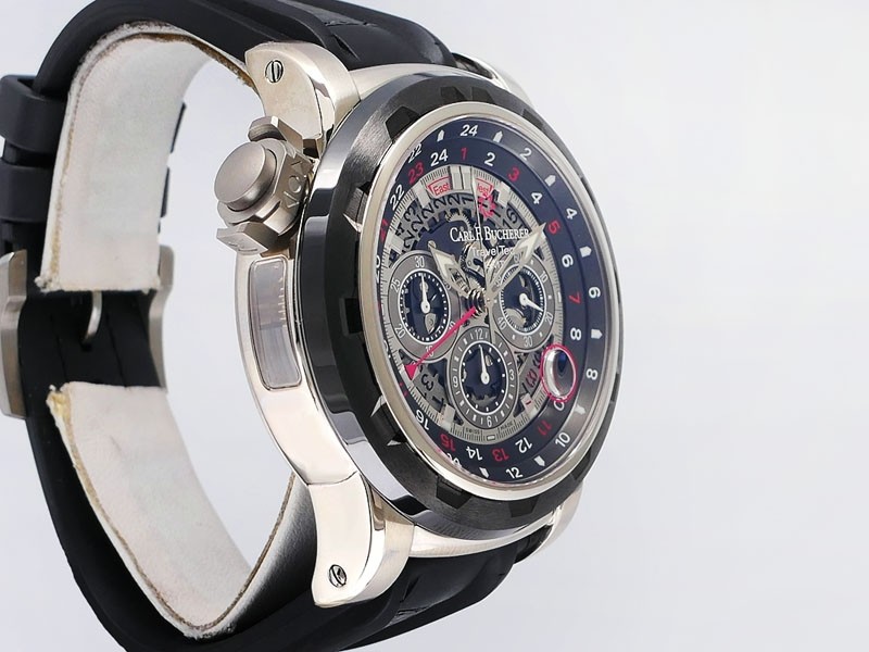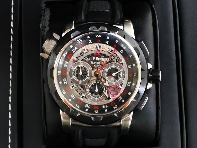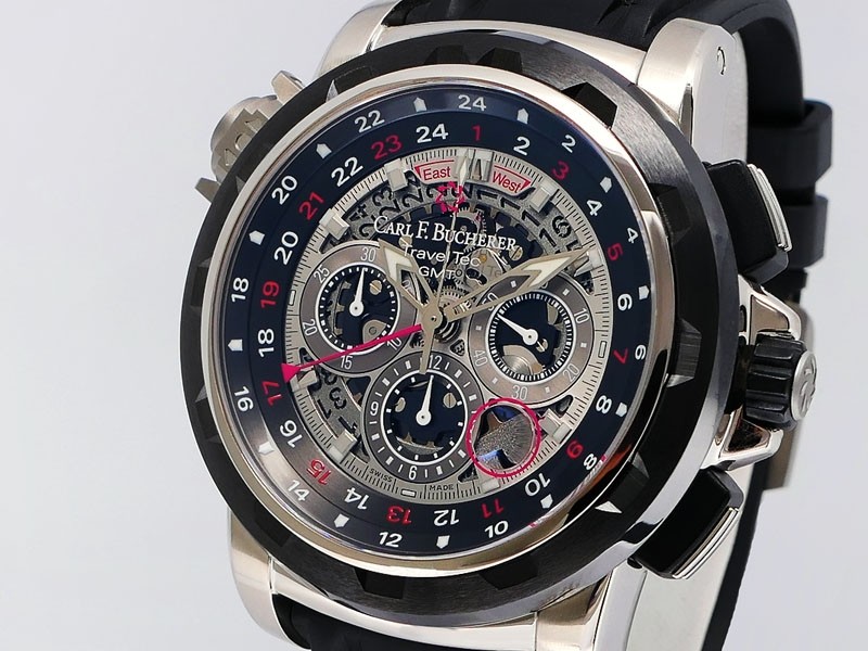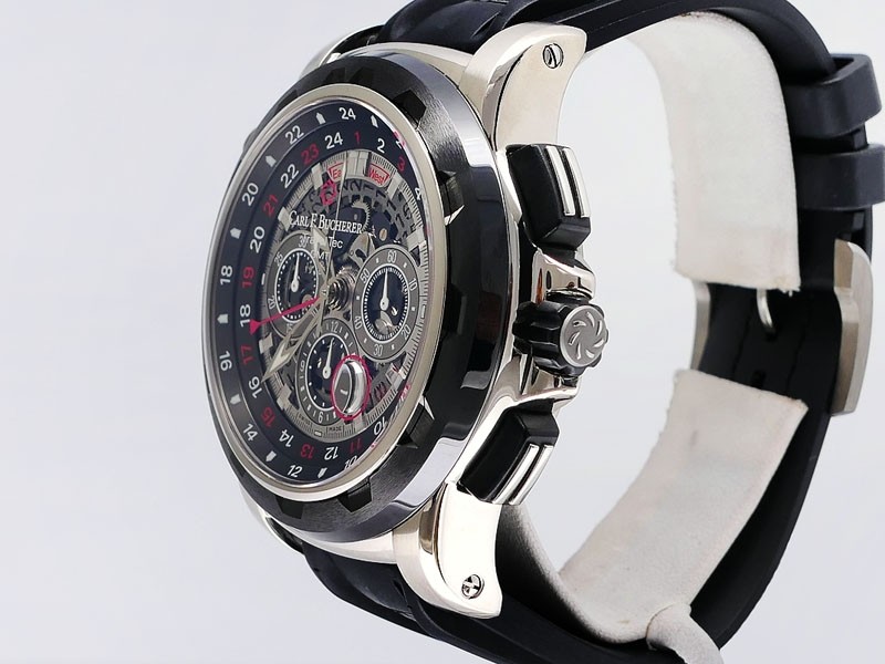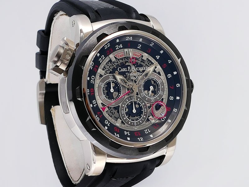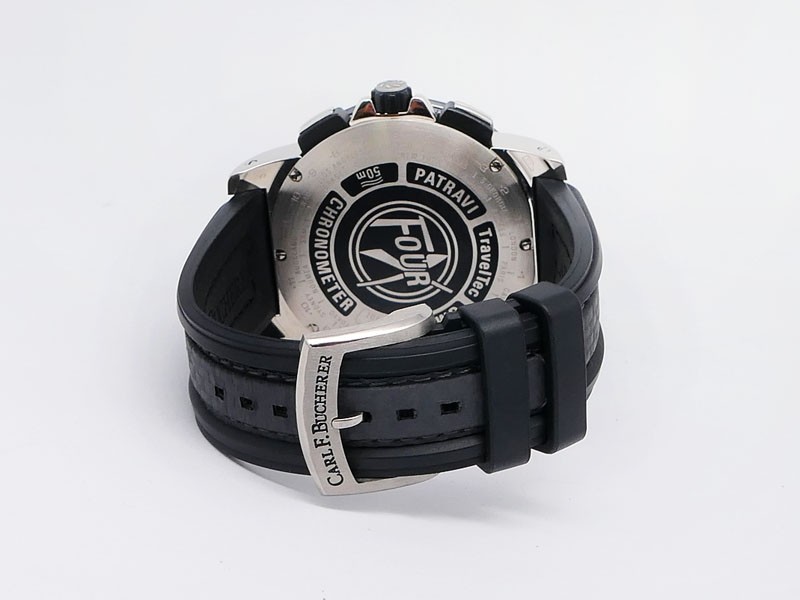 Swiss made Patravi TravelTec FourX Chronograph Automatic Chronometer silver-tone 950 Palladium round shaped case, reserve to ± 42h. Black /Grey Skeletonized with a tri-compax layout on dial, GMT,date, Rubber Strap with Tang Buckle.| Brand | Carl F. Bucherer |