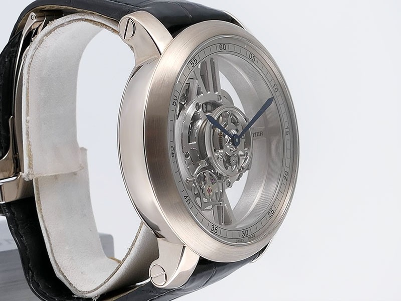 Swiss made Rotonde De Cartier Astrotourbillon Skeleton 18k White Gold round shaped case, reserve to ± 49h. Skeleton dial/Sword-shaped blued steel,hands, Arabic minute track. .Beaded set sapphire cabochon crown. Black alligator-skin strap, 18k WG...| Brand | Cartier |