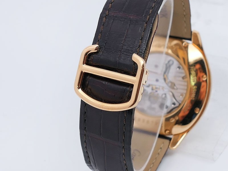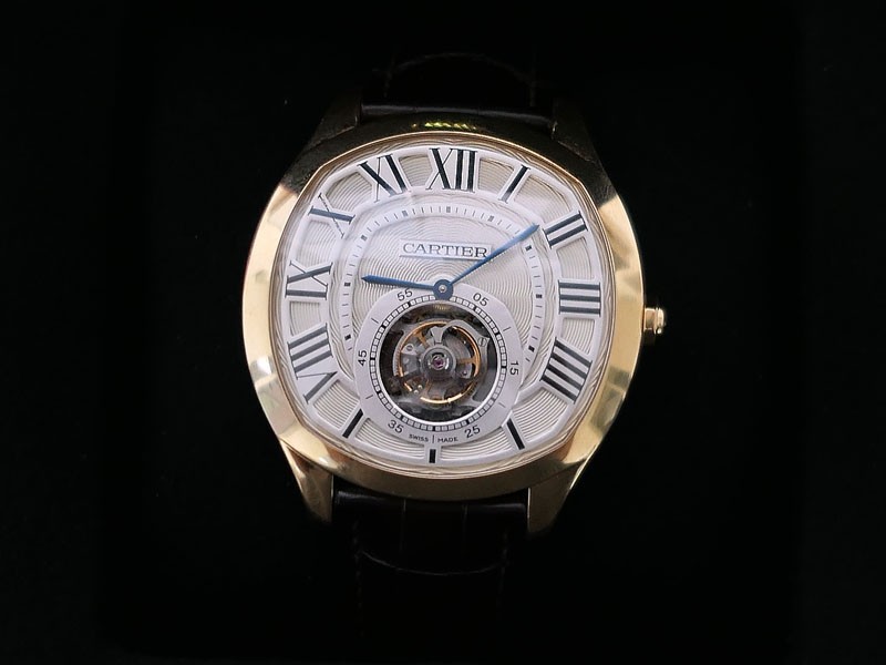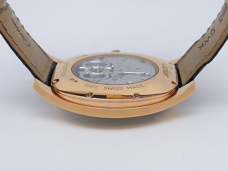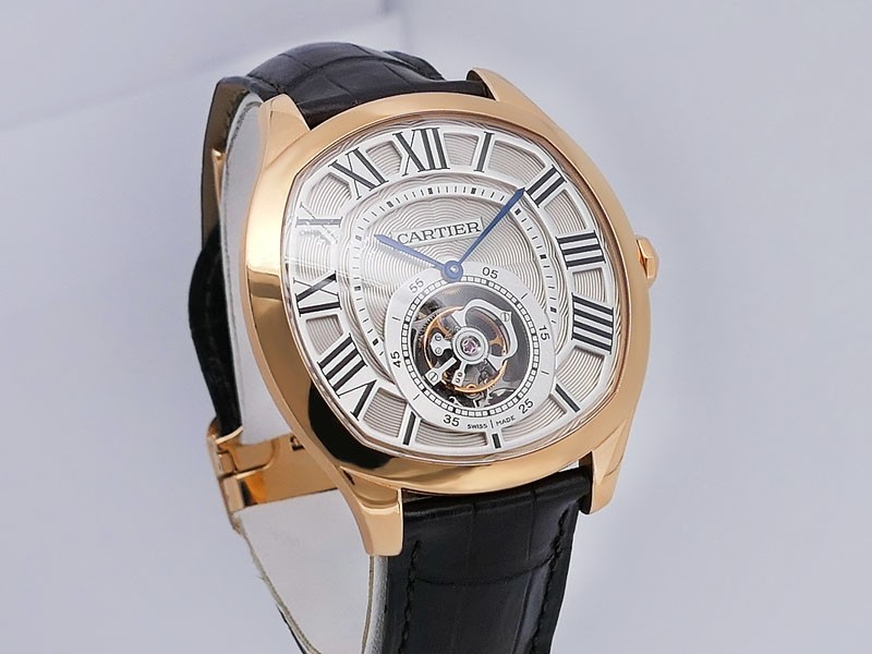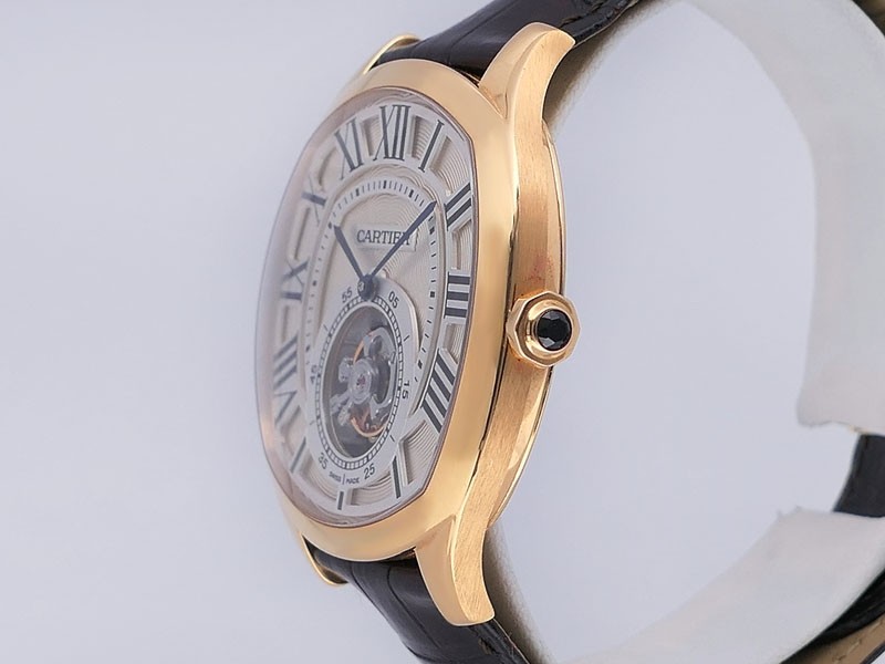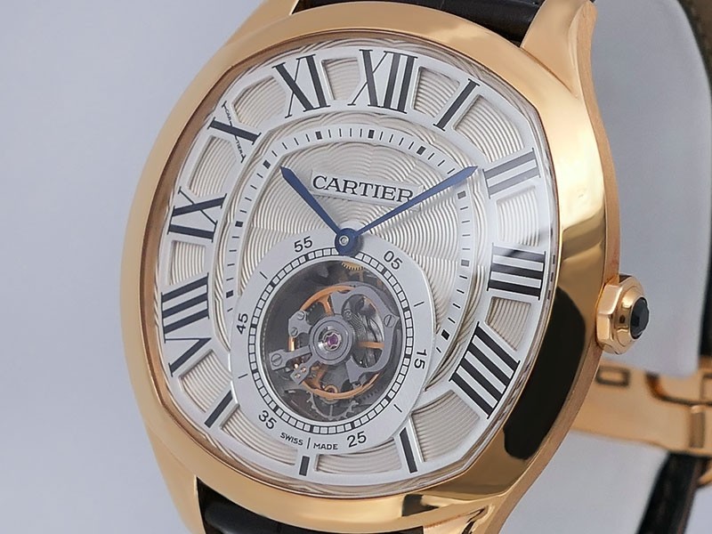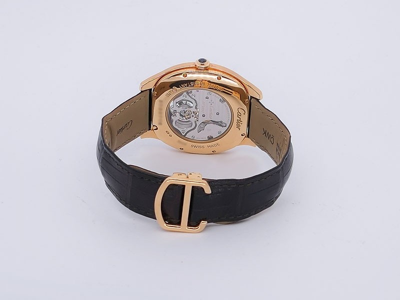 Swiss made Drive De Cartier Flying Tourbillon crafted polished finished 18k Rose Gold Cushion shaped case, reserve up to ± 50 hours Silver galvanized guilloche dial, Flying tourbillon Brown alligator-skin strap/ 18K Rose Gold folding Deploymen...| Brand | Cartier |