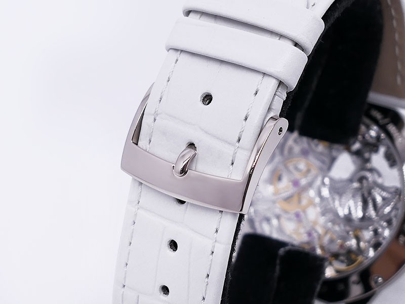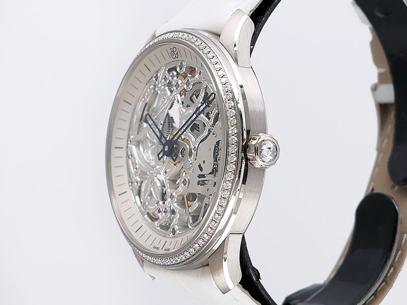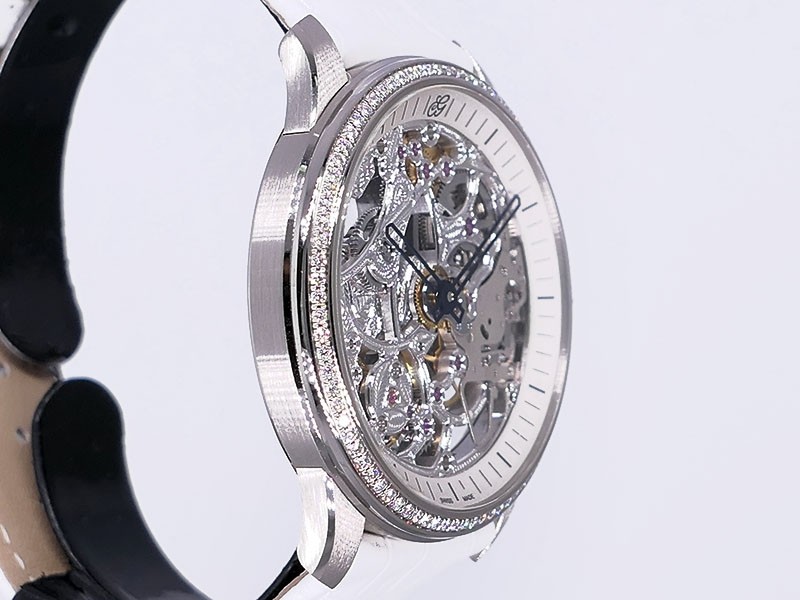 Swiss made Skeleton Diamonds UNISEX polished Palladium Gold round shaped case, “The watch features 85 vvs diamonds, 0.70 cts”. reserve to ± 48h. Skeleton hand-engraved dial,diamond set crown. White leather strap with Tang Buckle.| Brand | Charles Girardier |