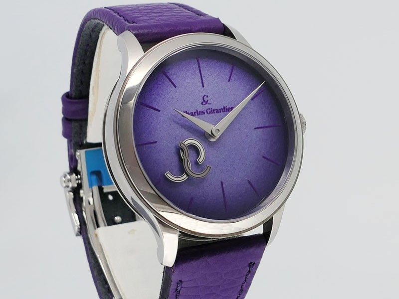 Swiss made Magic 8 Majestic Purple polished Grade 5 titanium round shaped case, reserve to ± 44h. Purple (Grand feu enamel with colour gradient, en camaïeu technique) dial w/ animation figure 8. Purple leather/hand stitching / CG monogram Deploy...| Brand | Charles Girardier |