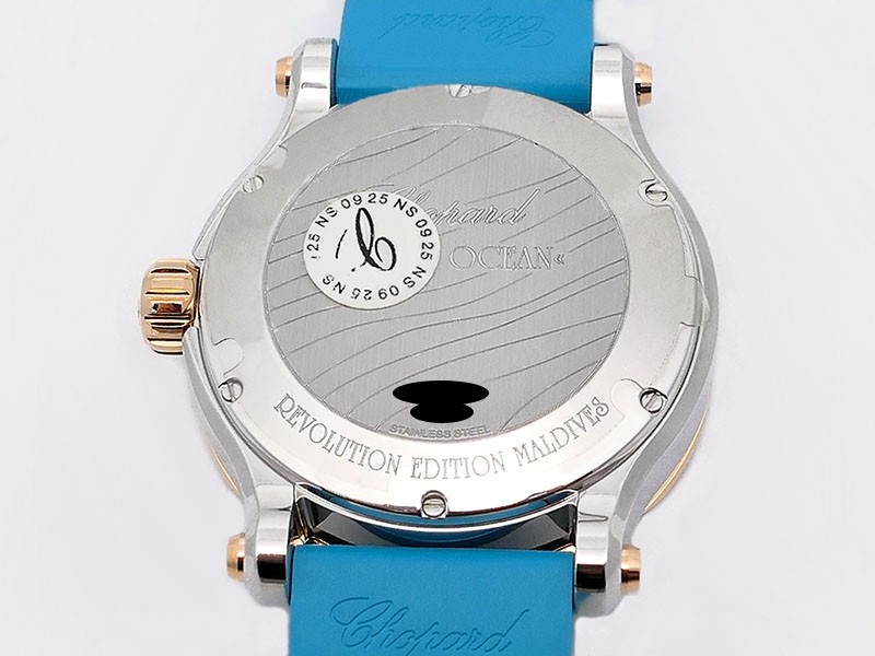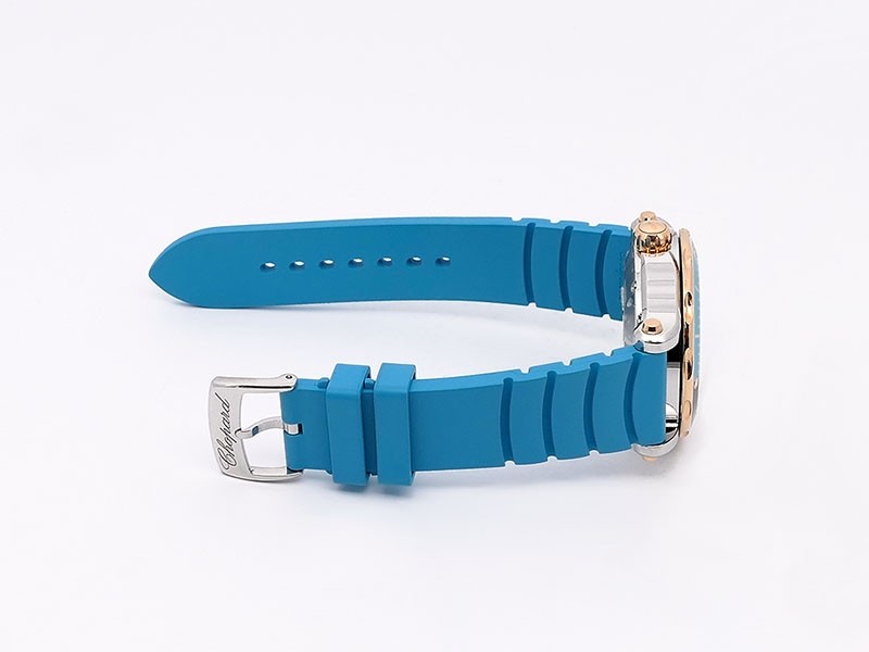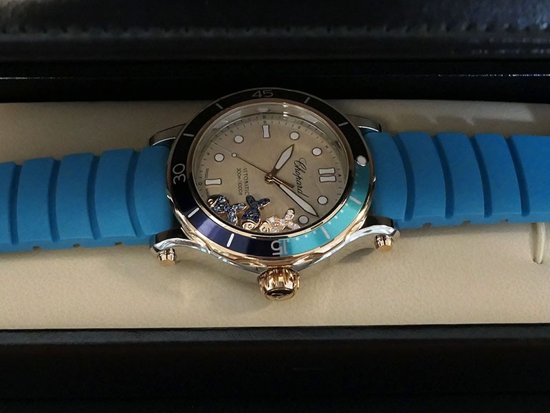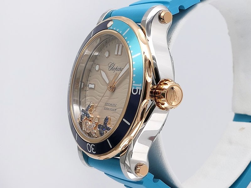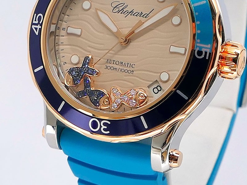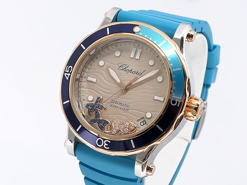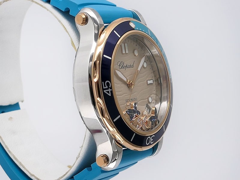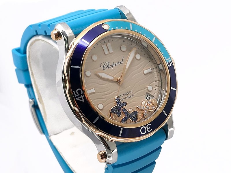 Swiss made Happy Ocean Maldives Revolution 2Tone Stainless Steel/18k Rose Gold round shaped case, Rose Gold/anodized aluminum insert bezel, reserve to ± 60h. Beige wave dial/Date.3 floating gold gem stone fish. Blue leather & Rubber straps/stee...| Brand | Chopard |