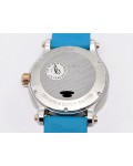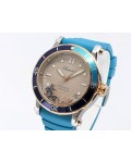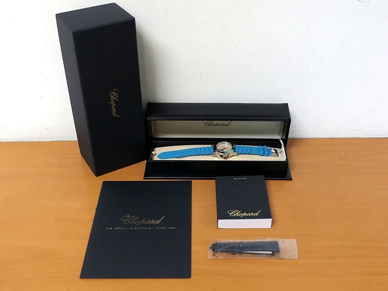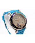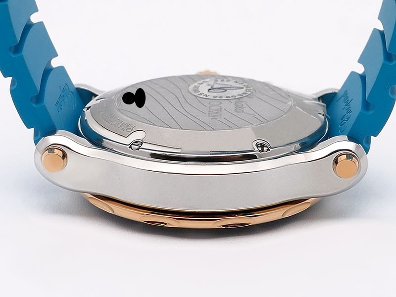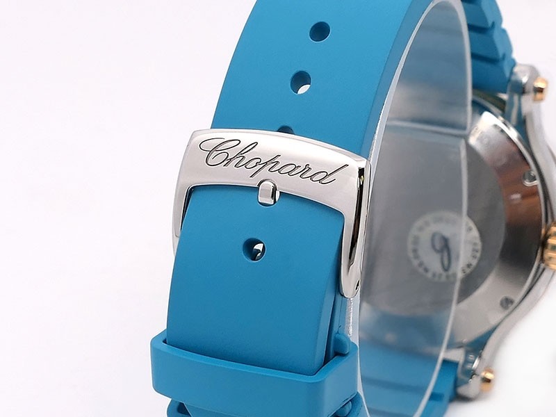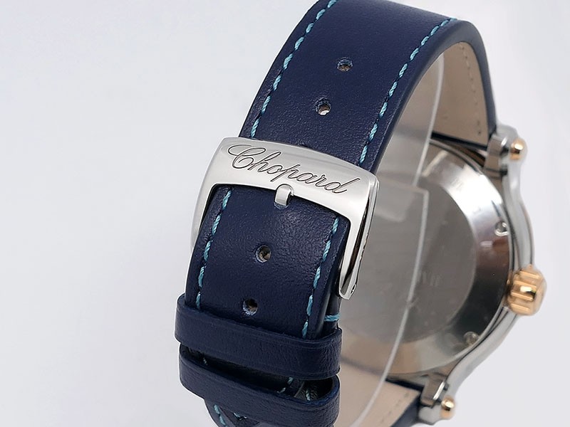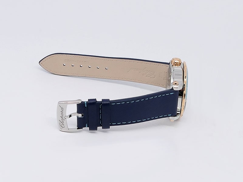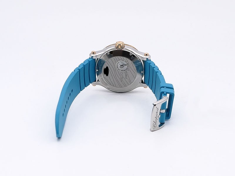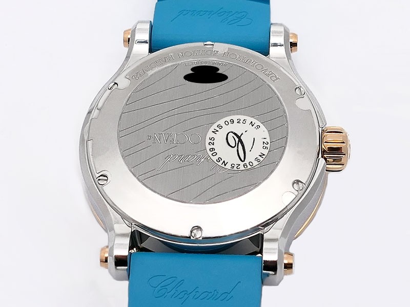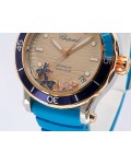 Swiss made Happy Ocean Maldives Revolution 2Tone Stainless Steel/18k Rose Gold round shaped case, Rose Gold/anodized aluminum insert bezel, reserve to ± 60h. Beige wave dial/Date.3 floating gold gem stone fish. Blue leather & Rubber straps/stee...| Brand | Chopard |
