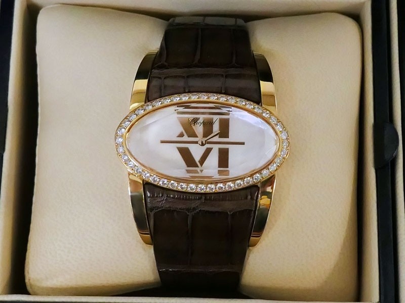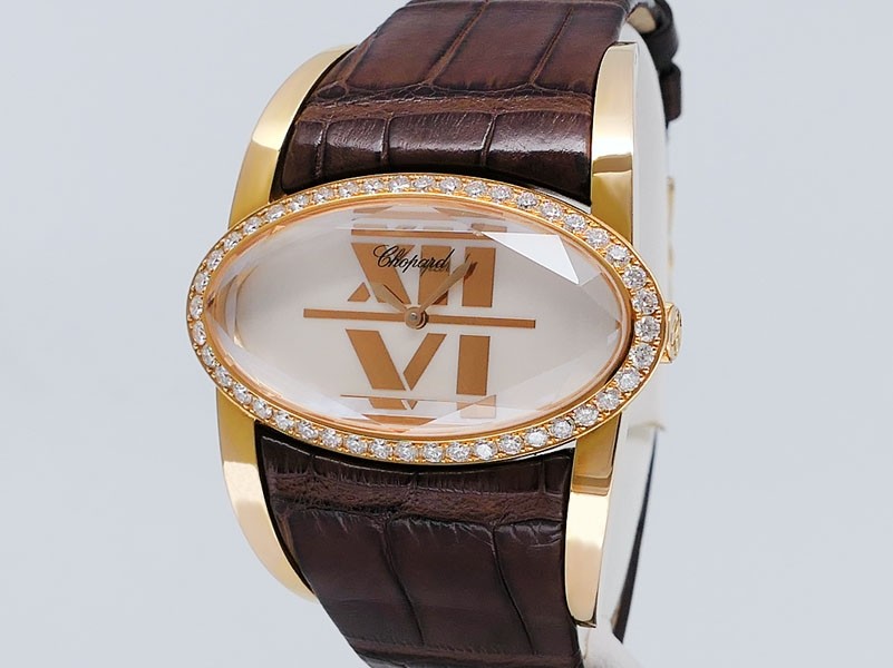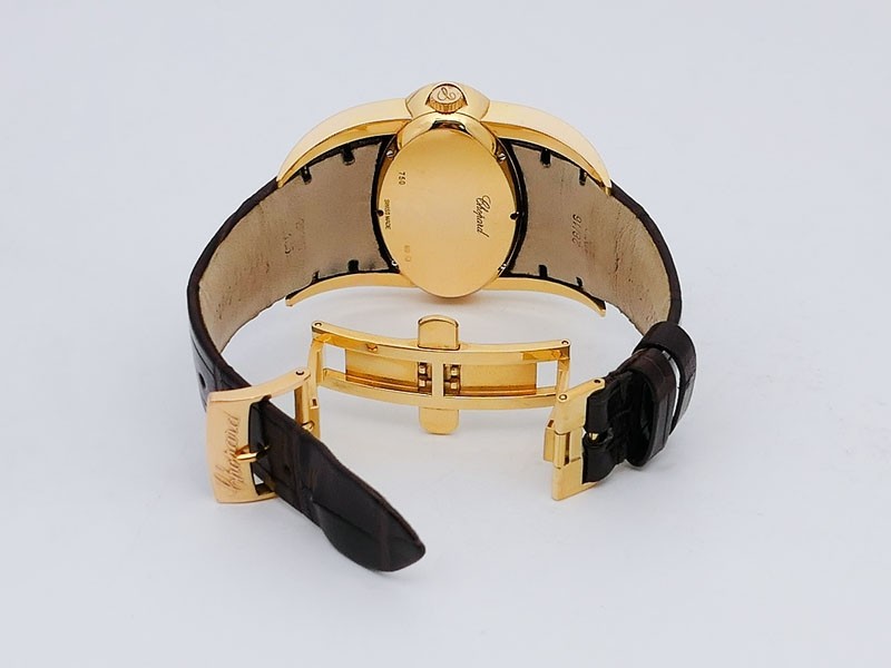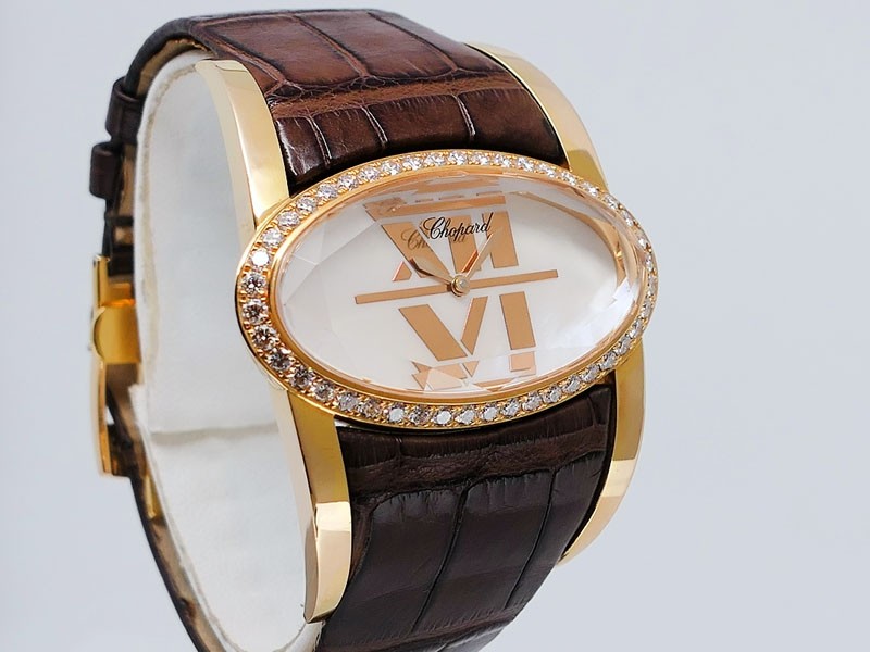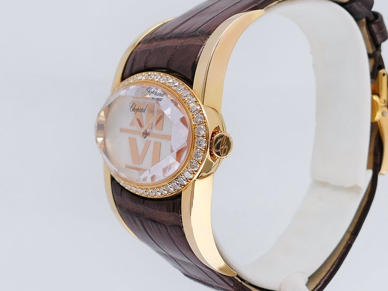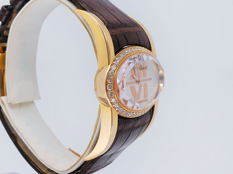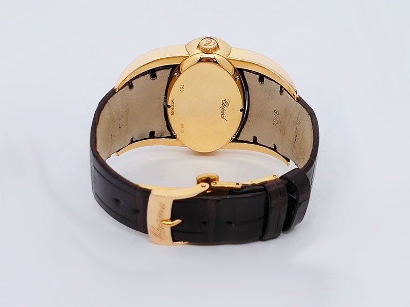Swiss made Classic Lady’s Happy Oval Diamond, 18k Honey Gold oval shaped case, Gold diamond bezel, Quartz movement. Mother of Pearl dial, applied Roman numerals 12/6. Cut faceted diamond shaped Sapphire crystal. Brown leather strap, Gold Deploym...| Brand | Chopard |