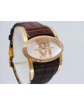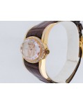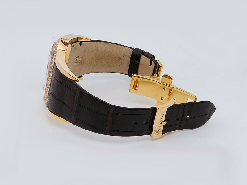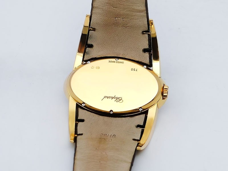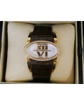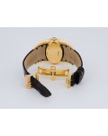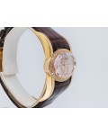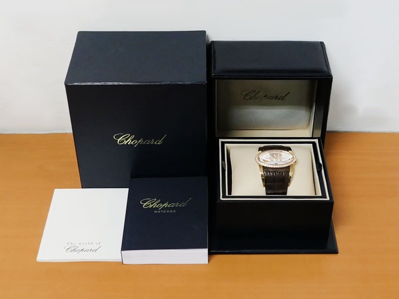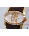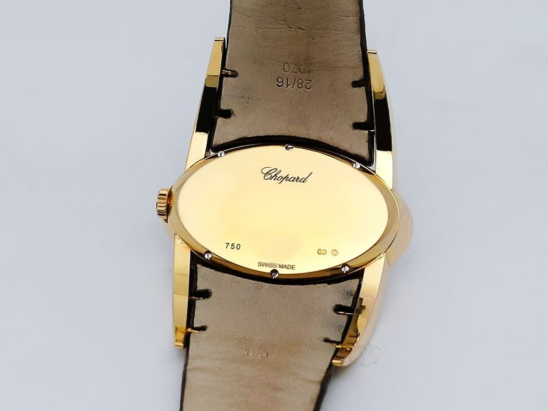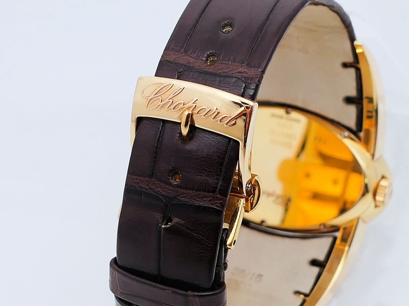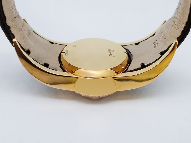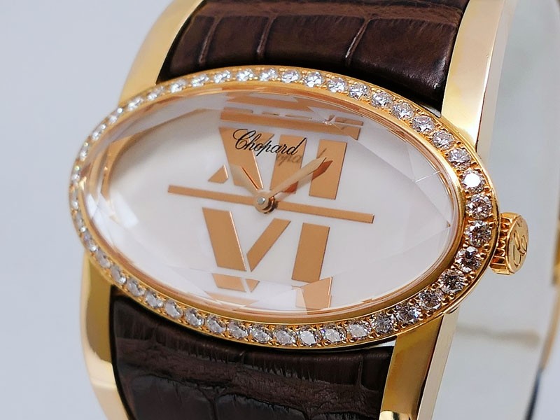 Swiss made Classic Lady’s Happy Oval Diamond, 18k Honey Gold oval shaped case, Gold diamond bezel, Quartz movement. Mother of Pearl dial, applied Roman numerals 12/6. Cut faceted diamond shaped Sapphire crystal. Brown leather strap, Gold Deploym...| Brand | Chopard |