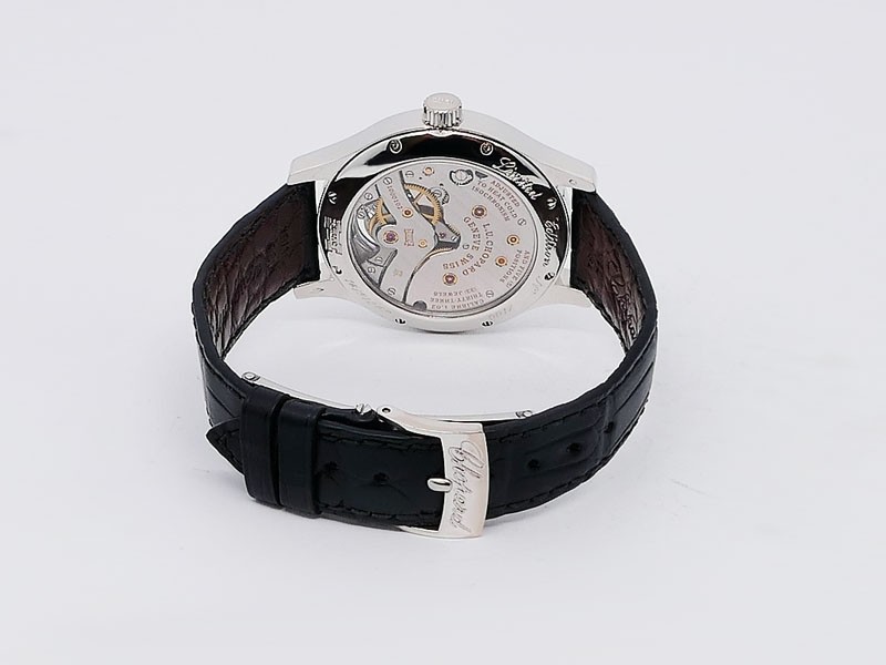 Swiss made L.U.C Quattro Tourbillon 8 Day Power Reserve three body, Platinum round shaped case, reserve to ±192h. Silver central sunray guilloche design on dial, Black alligator with maroon on the reverse strap with Chopard 18k White Gold Deplo...| Brand | Chopard |