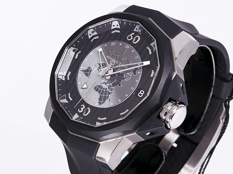 Swiss made Admiral’s Cup Challenger 48 GMT grade 5 Titanium dodecahedron shaped case, reserve to ± 46 hours. Gray dial with a globe motif, . Date, GMT, Two Time Zones, AM/PM Indicator. Black Rubber strap with large Corum Titanium Tang Buc...| Brand | Corum |
