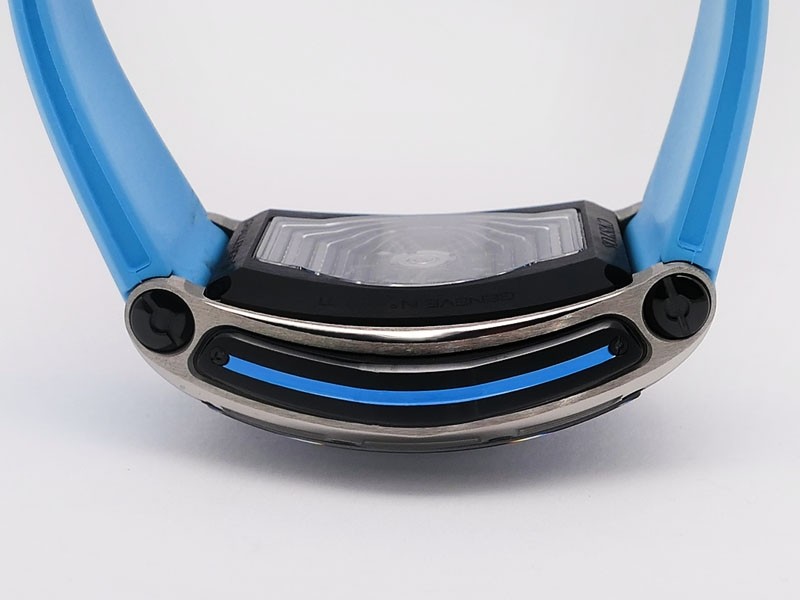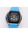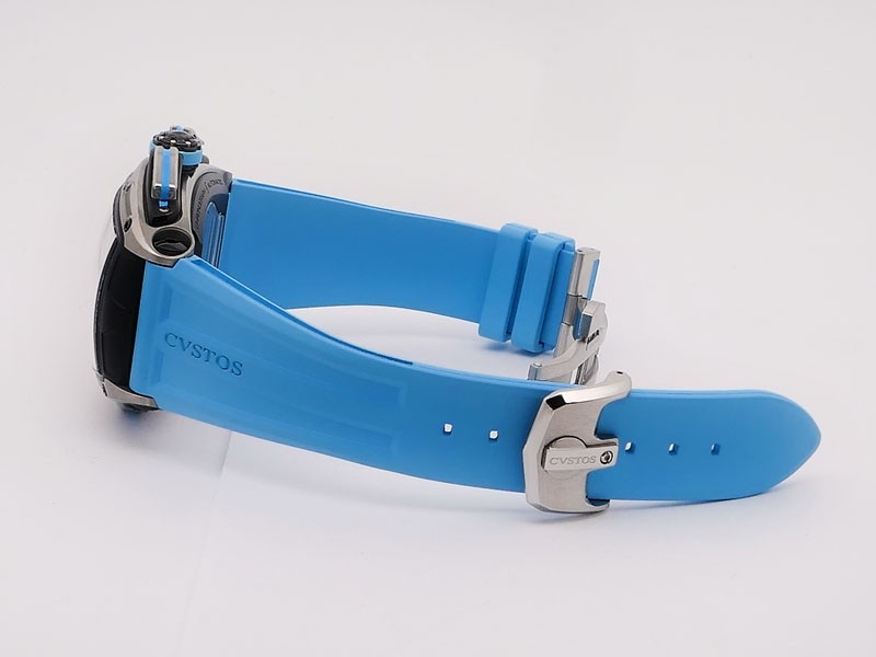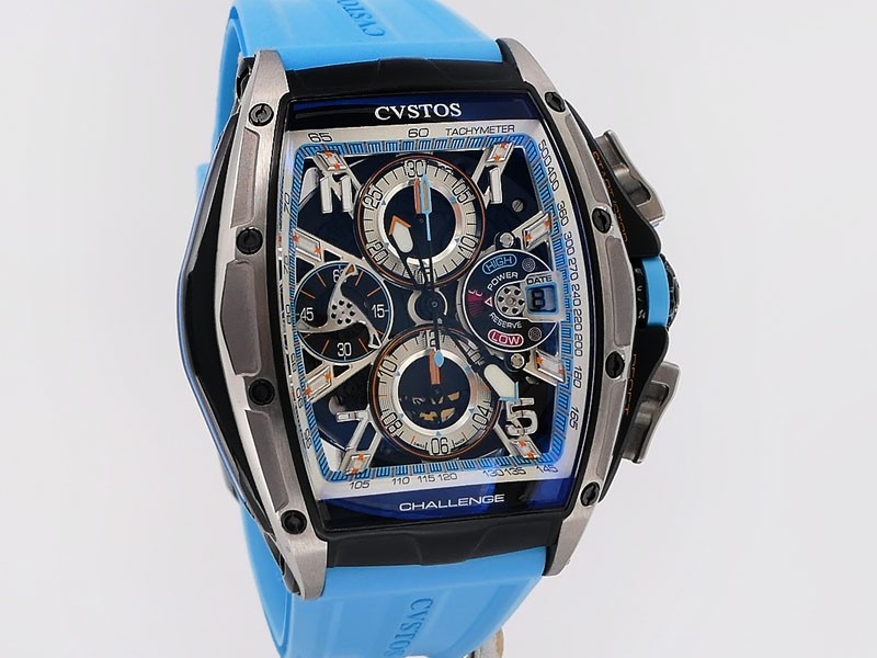 Swiss made Challenge III Chronograph-S Brancard Grade 5 titanium tonneau-shaped case, tachymeter, reserve up to ± 42h. Skeletonized dial/ matte black PVD finish. Light blue rubber strap and titanium deployment Buckle.| Brand | Cvstos |