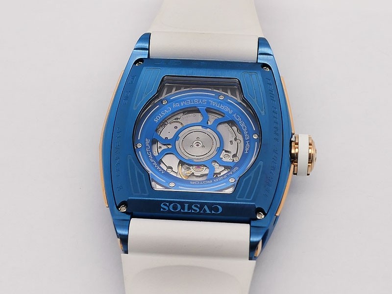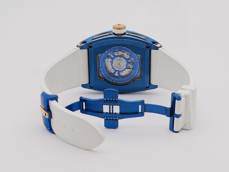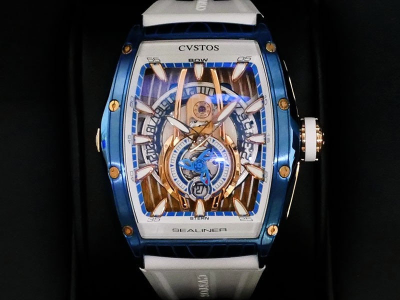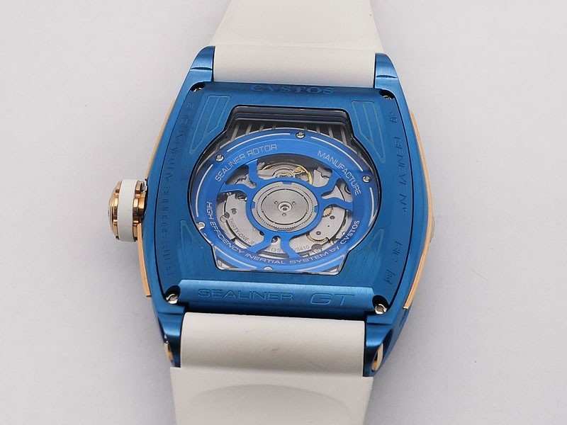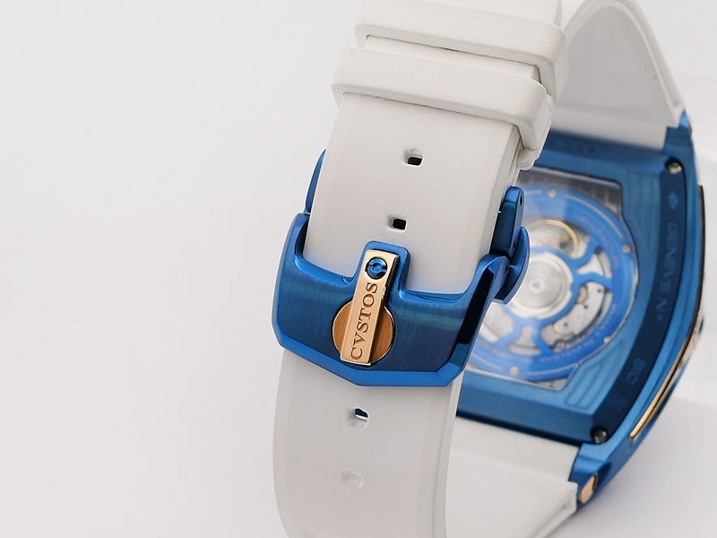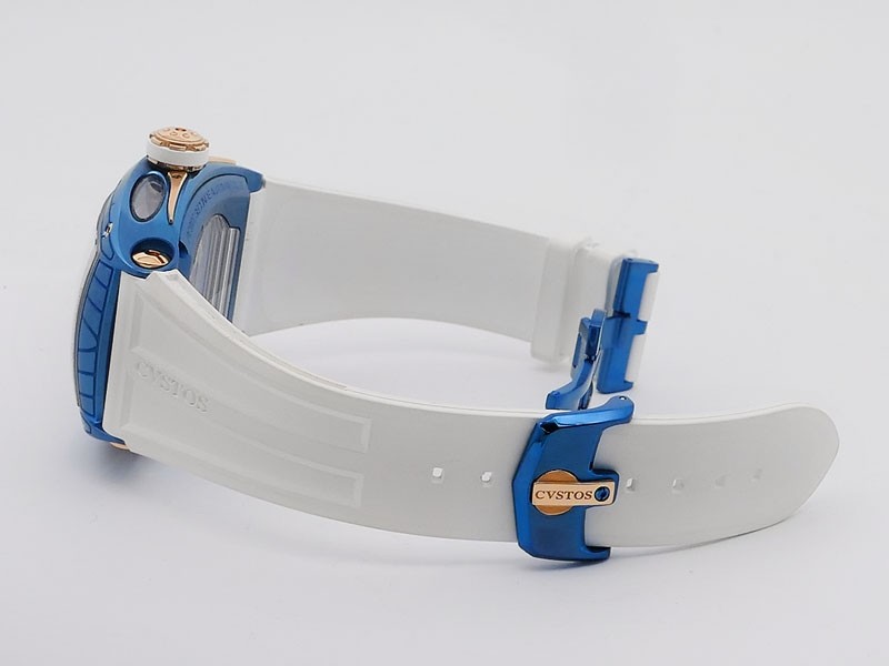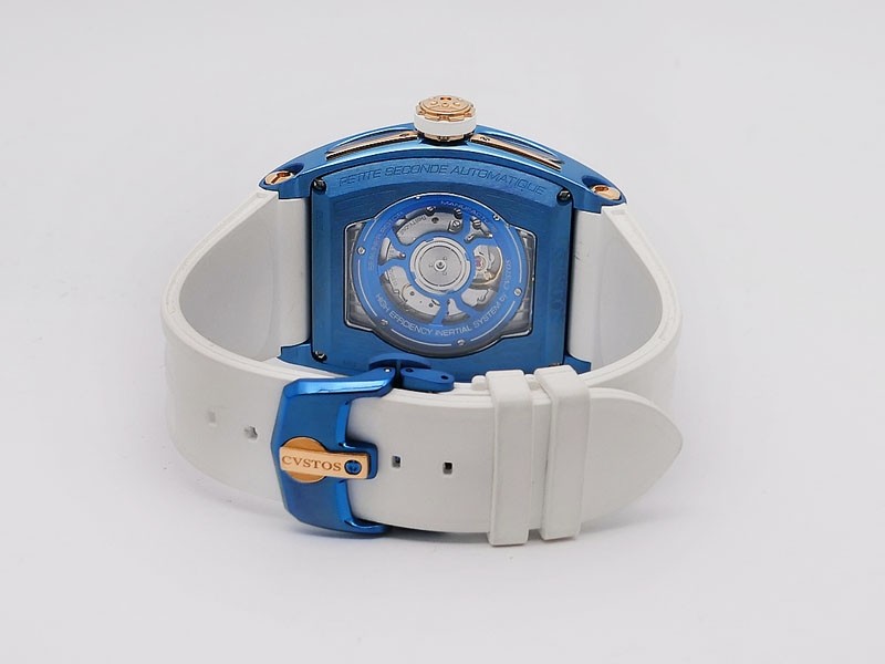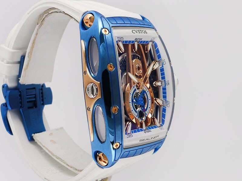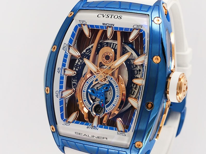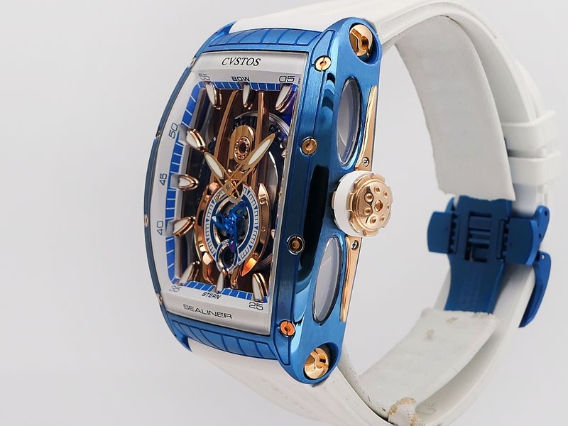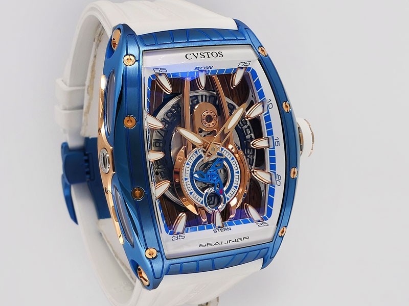 Swiss made Sealiner PS GT Skyblue PVD-coated steel /Rose Gold tonneau shaped case, reserve to ± 42h. Skeletonized dial, three-dimensional design/ Date, White Rubber strap/Sky-blue PVD-coated SS/ Rose Gold 5N engraved /CVSTOS insignia Deployment ...| Brand | Cvstos |