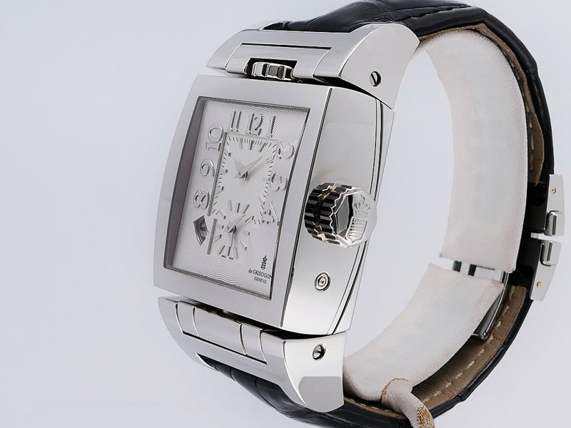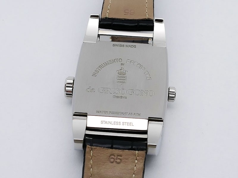 "INSTRUMENTO DOPPIO in a new creation. It has a three time zone display, two on one dial and one on the other face. Mechanical ingenuity. All these displays work with a single movement, a single barrel. Two dials One Silver Guilloche Second Grey ...| Brand | De Grisogono |