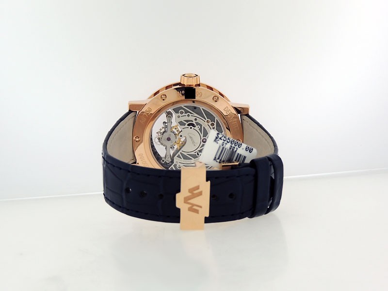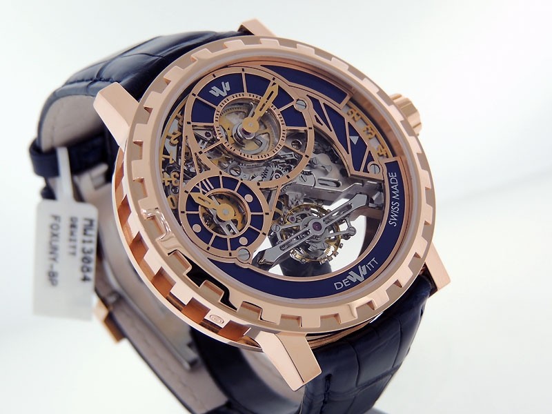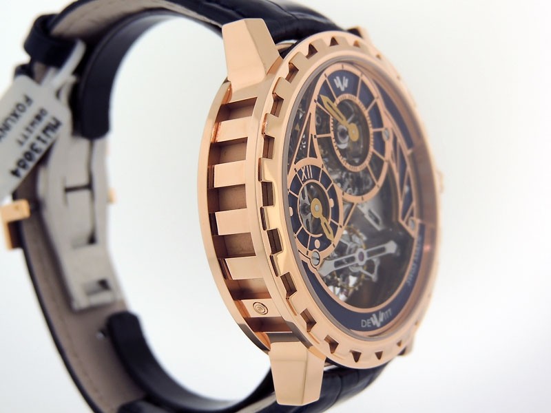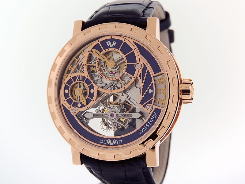Swiss made Academia Grand Tourbillon crafted in a 18k Rose Gold case with Imperial Columns, reserve to ± 65 hours. Anthracite Grey / Rose Gold & Blue Openwork dial, Tourbillon, Date, day/night indicator. Blue Alligator strap with 18k Rose Gold Dep...| Brand | De Witt |