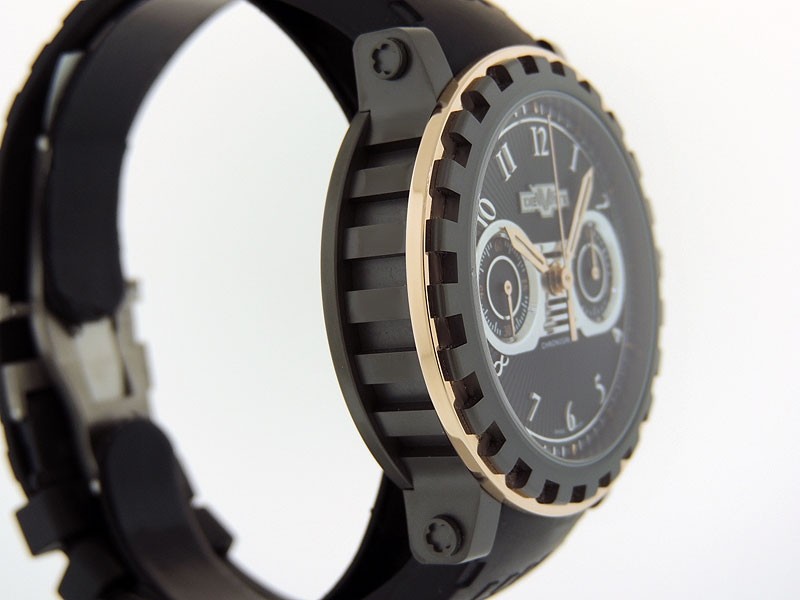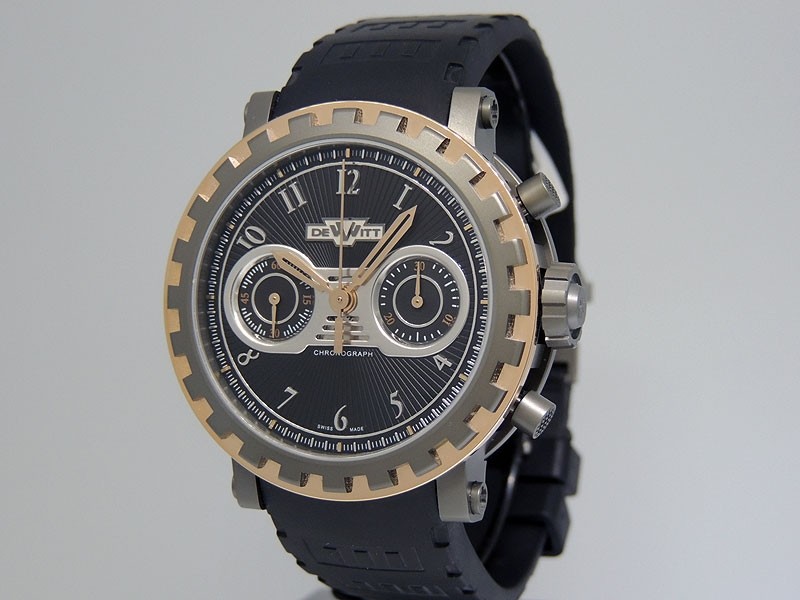 Swiss made DeWitt Academia Chronographe in 2 Tone AC.6005.53A.MO090 in three-body 18k Rose Gold/Titanium round shape case, reserve up to ± 48 hours. Guilloche, Silvered and Rose Gold Elements dial, Black Rubber strap with “W” double deployant Buckle.| Brand | De Witt |
