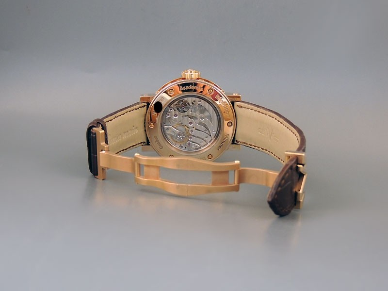Swiss made Academia Minute Repeater 18k Rose Gold round shaped case, reserve up to ± 48hours.Multi-layered lower skeletonized Caviar Burgundy colored dial, Dewitt Brown crocodile strap with 18K RG Deployant buckle.| Brand | De Witt |