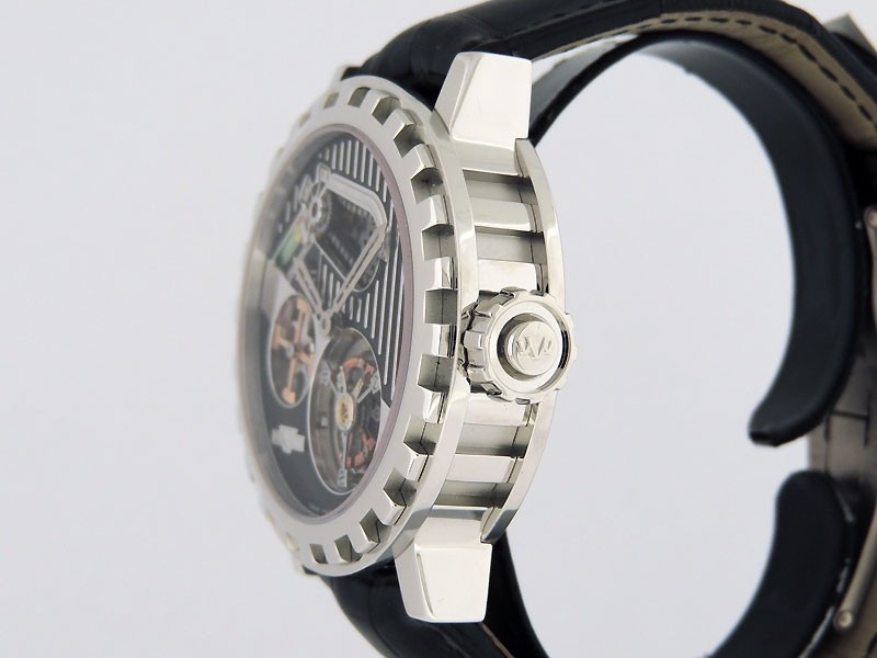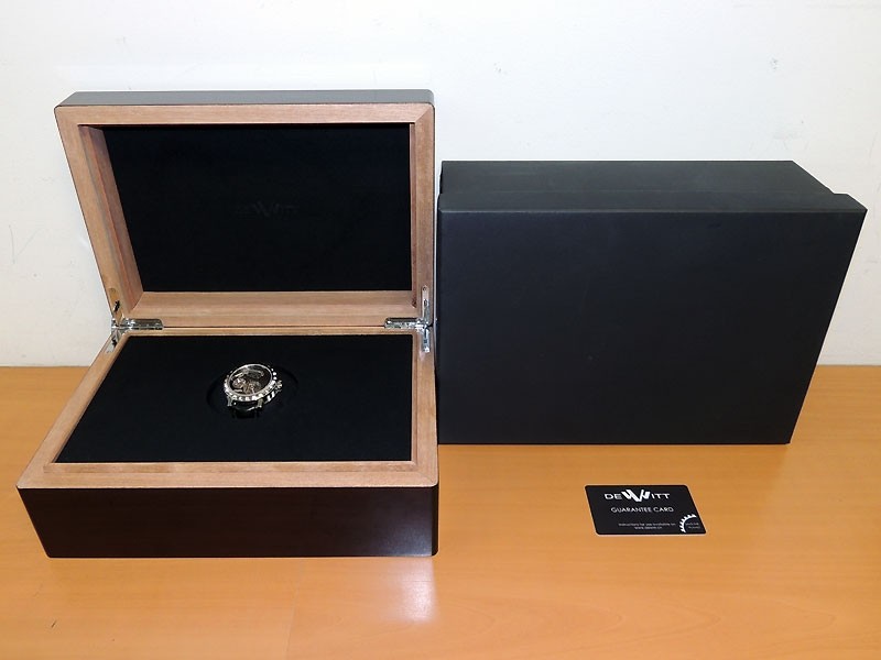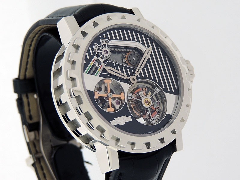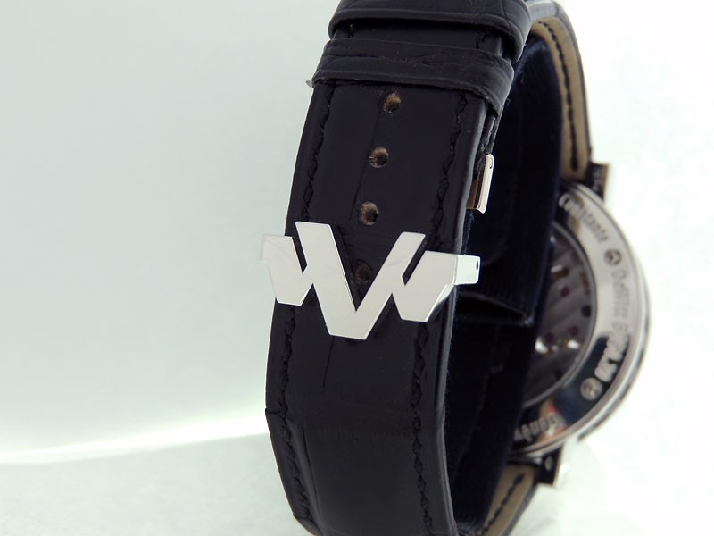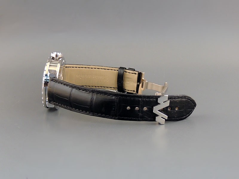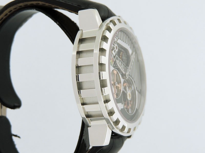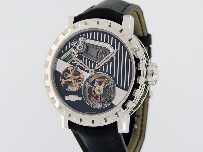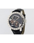 Swiss made Tourbillon Force Constante Chain Drive crafted 950 Platinum round shaped case, with imperial columns pattern, reserve to ± 72hours. Black emblematic semi skeleton open work dial, Power Reserve, small seconds. Black Crocodile leather ...| Brand | De Witt |