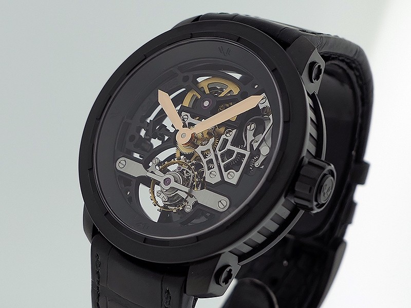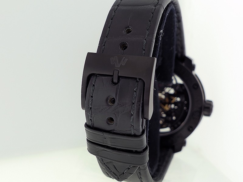 Swiss made Twenty-8-Eight Skeleton Tourbillon ultra light Grade 5 titanium DLC coated round shaped case. with iconic DeWitt imperial columns reserve up to ± 72 hours. Black Skeleton, Black leather strap with Grade 5 titanium “W” pin Buckle.| Brand | De Witt |