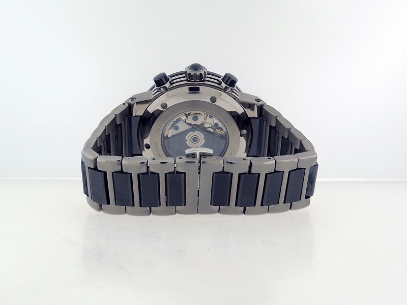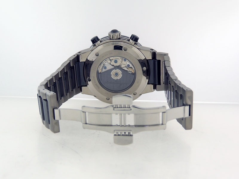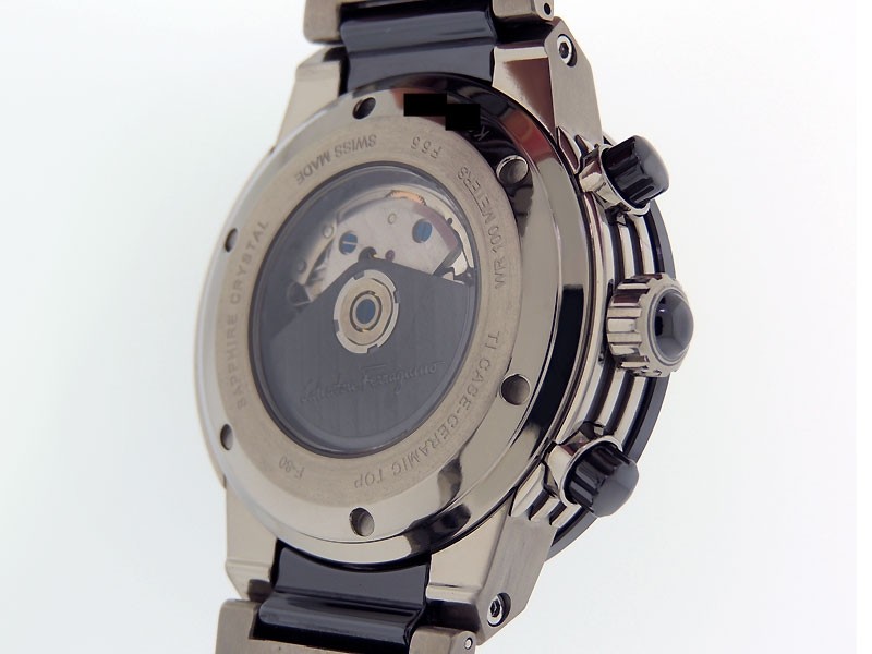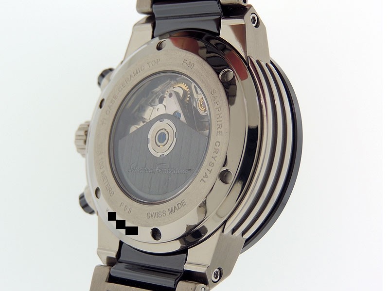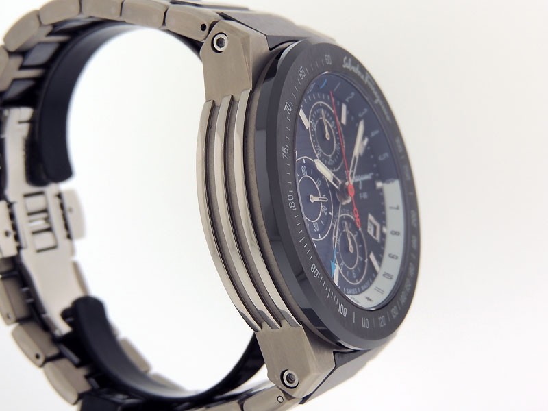 Swiss made F-80 GMT Chronograph, light weight brushed Titanium/Ceramic round shaped case, reserve to ± 42 hours. Horizontally textured Black dial,GMT/ AM&PM indications, Date, Titanium/Ceramic links bracelet w/ Ferragamo push-button clasp/ Depl...| Brand | Ferragamo |