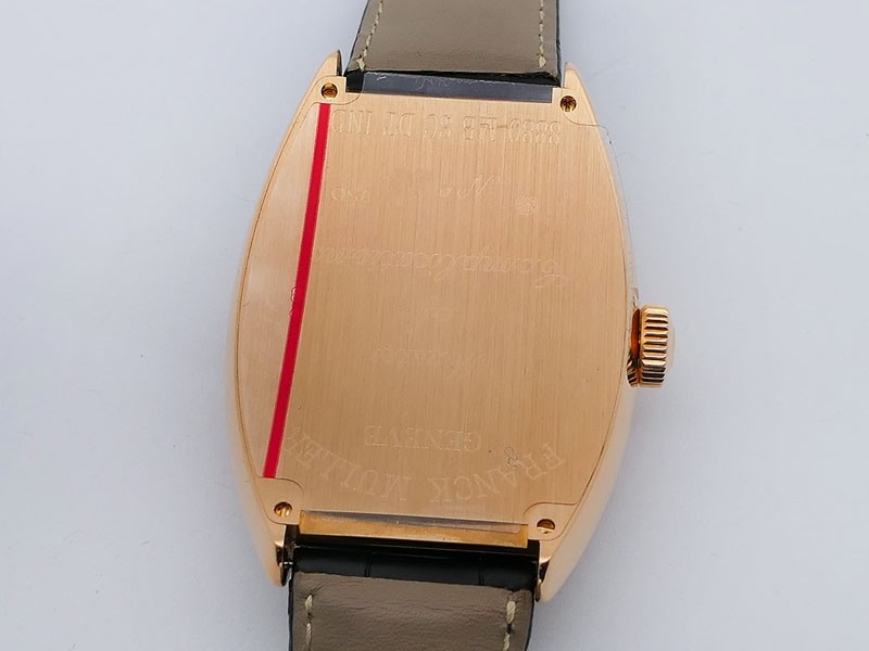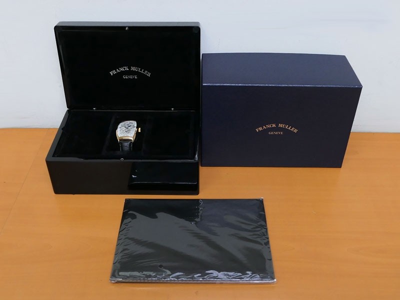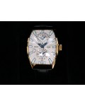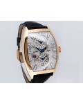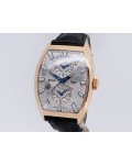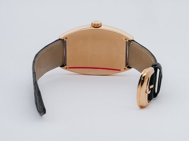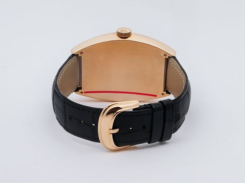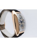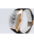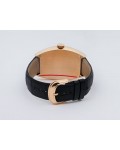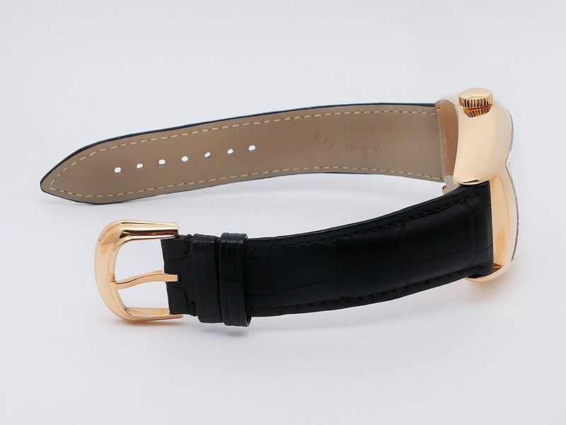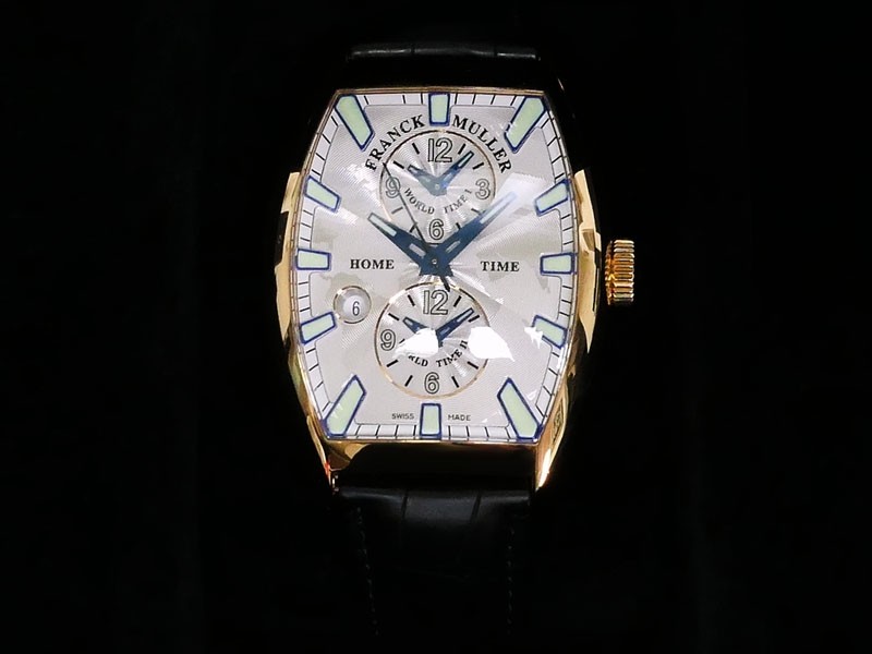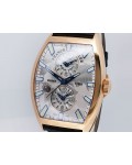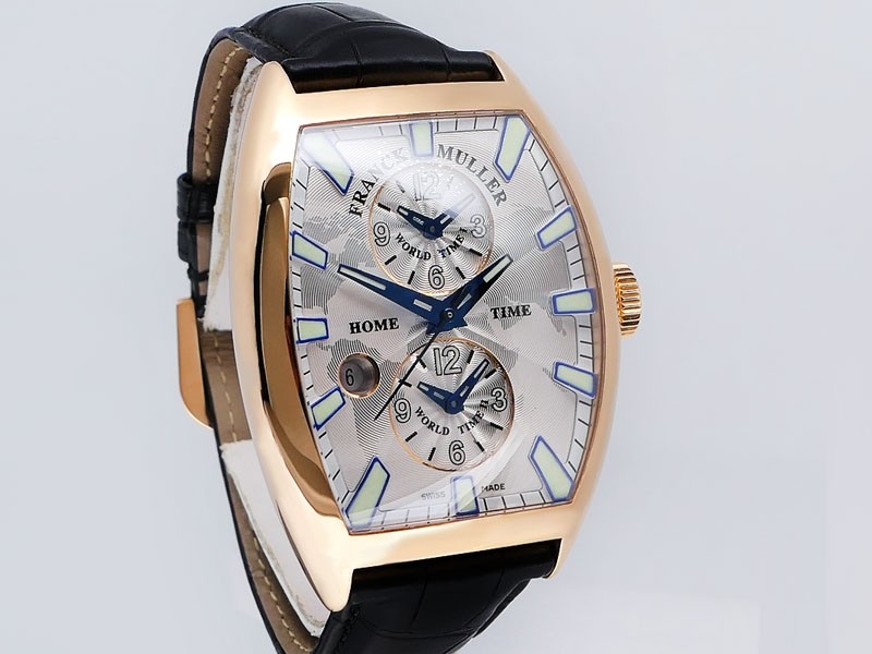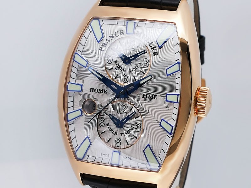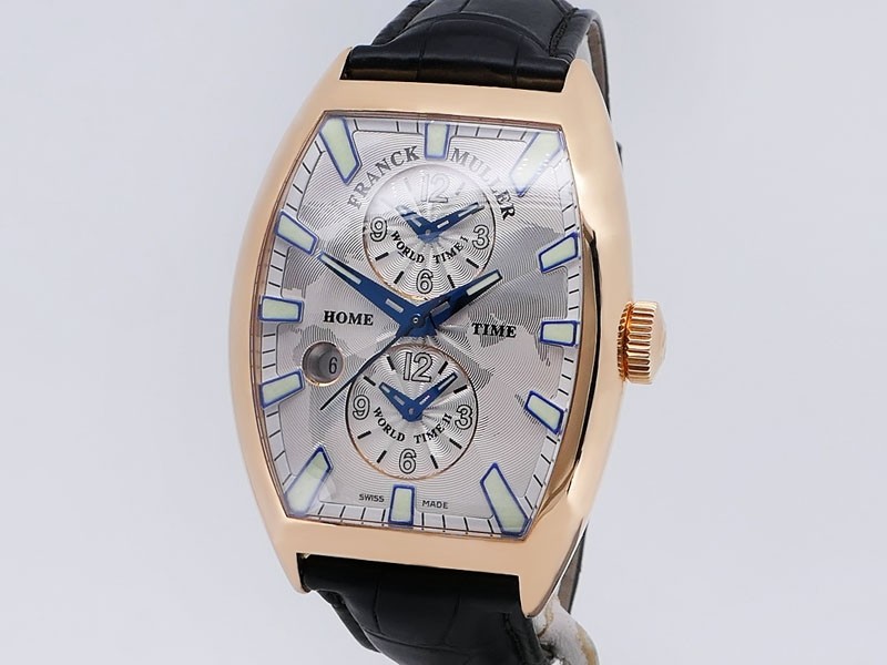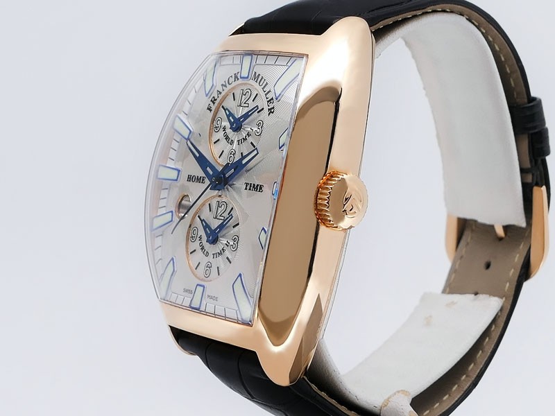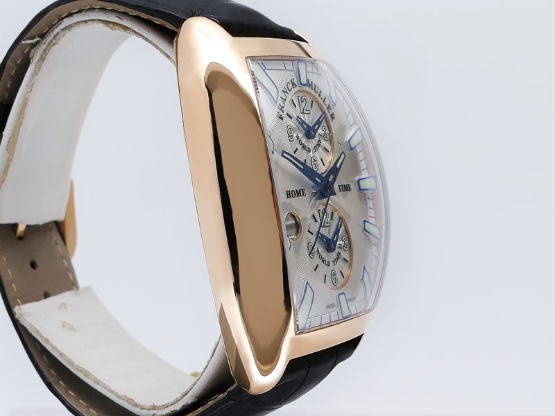 Swiss made Master Banker World Timer 18k Rose Gold Tonneau shape case, reserve to ± 42h. Silvered guilloche sunburst texture w/world map. Date, triple time zones: single crown, two independent time-zones Dual sub-dials. Black leather strap, with ...| Brand | Franck Muller |