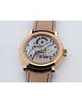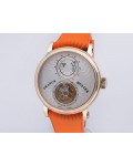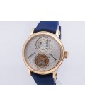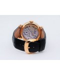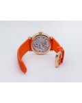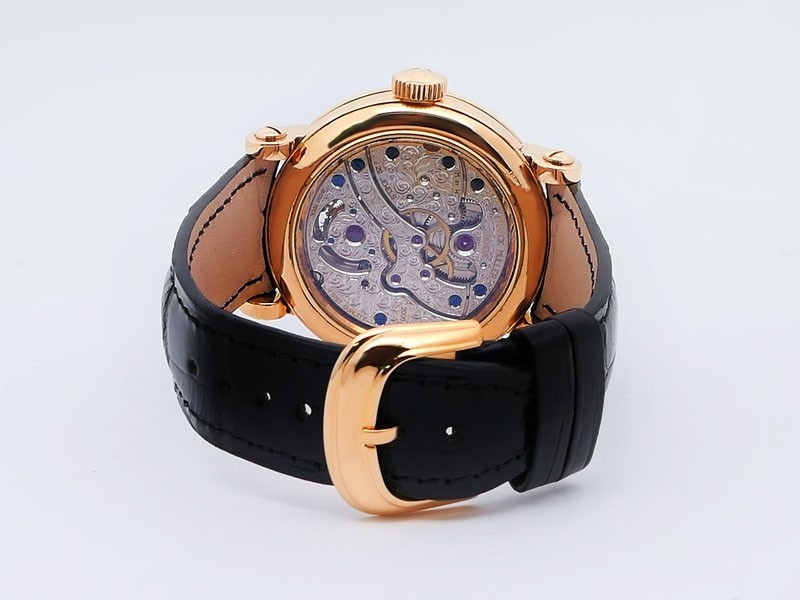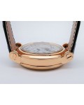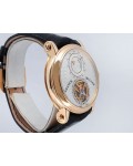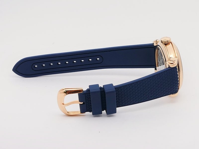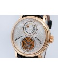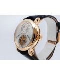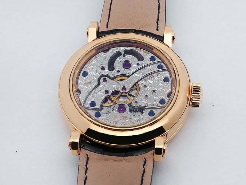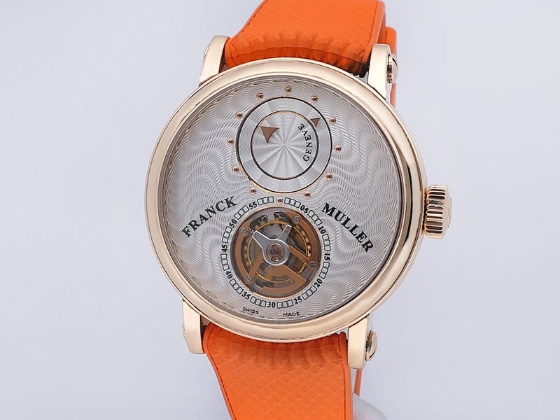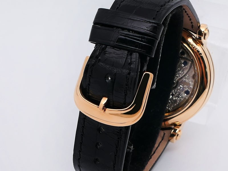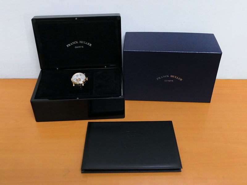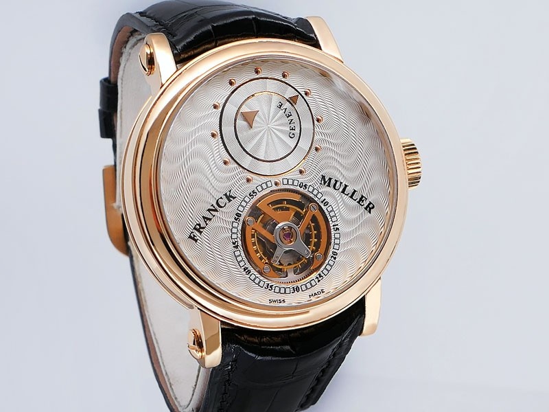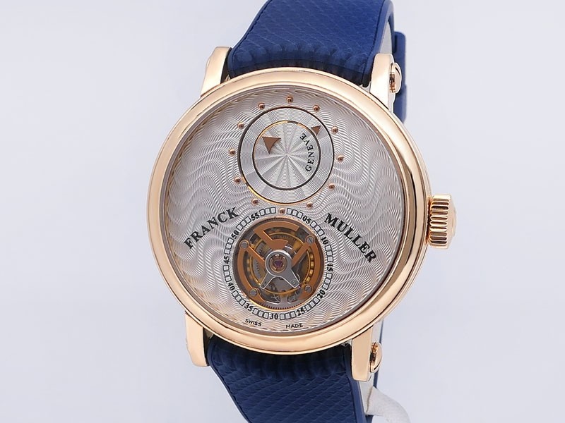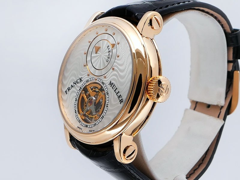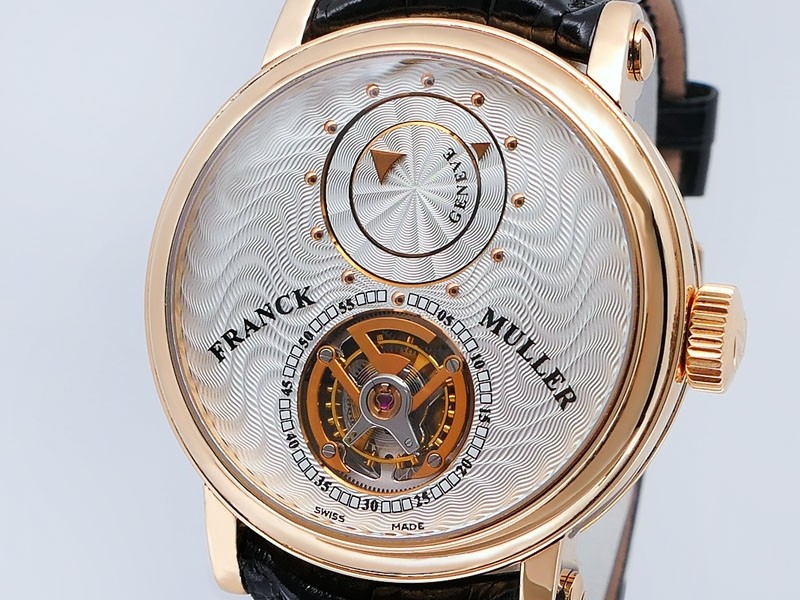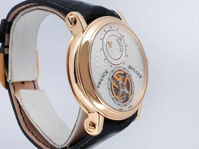 Swiss made Double Mystery Tourbillon 18k Rose Gold round shaped case, reserve to ± 60h. Silver wave pattern dial with - Double Mystery two rotating time discs. Black Alligator leather strap, + 2 Rubber straps Rose Gold Tang buckle.| Brand | Franck Muller |
