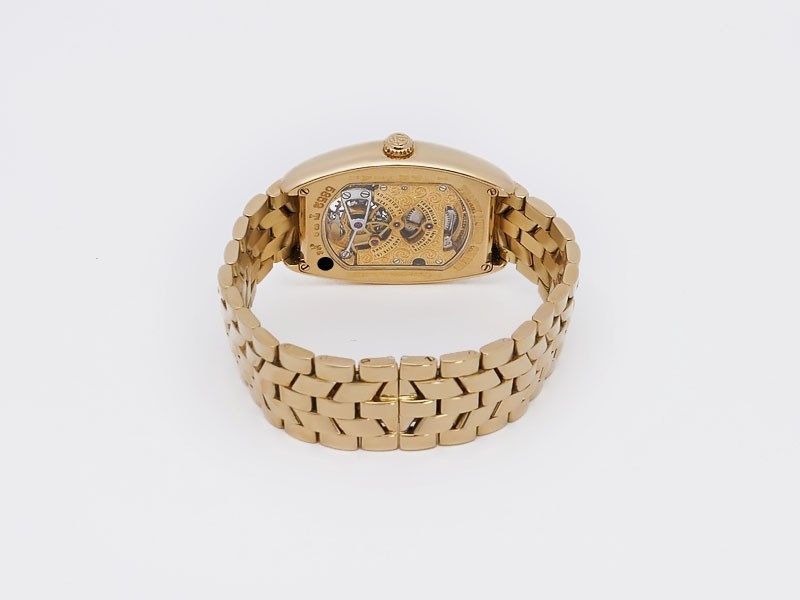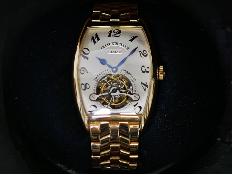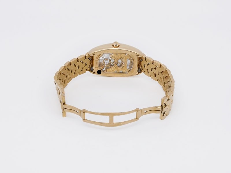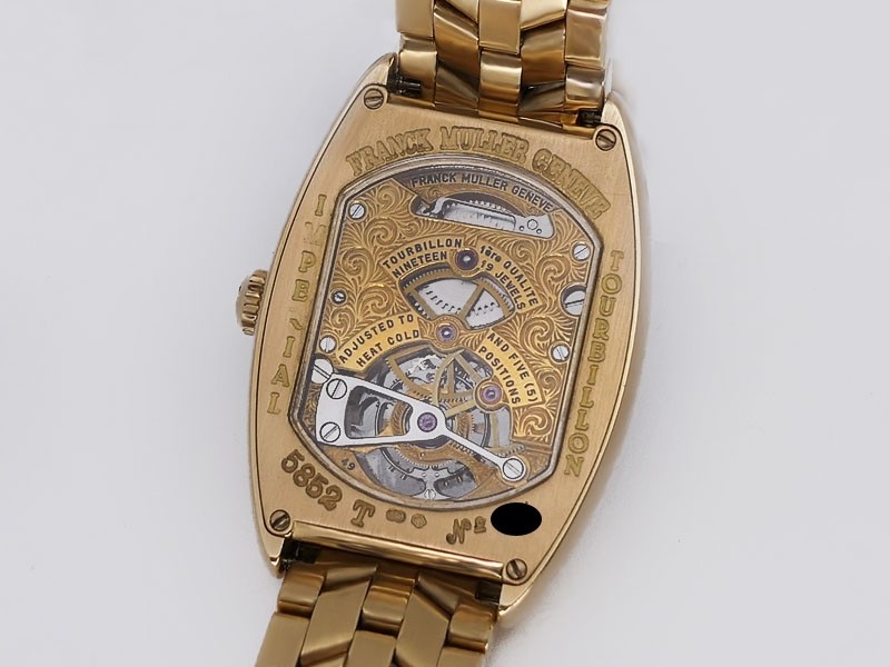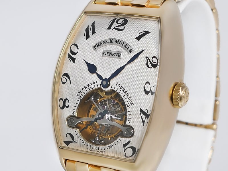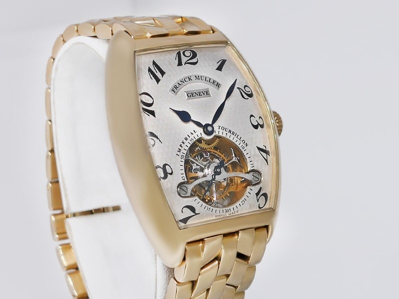 Swiss made Imperial Tourbillon crafted two body, solid, polished & brushed 18k Yellow Gold tonneau shaped case, reserve to ± 40h . Silver guilloche dial, tourbillon regulator, 18k Yellow Gold Franck Muller link bracelet/concealed double deplo...| Brand | Franck Muller |