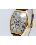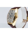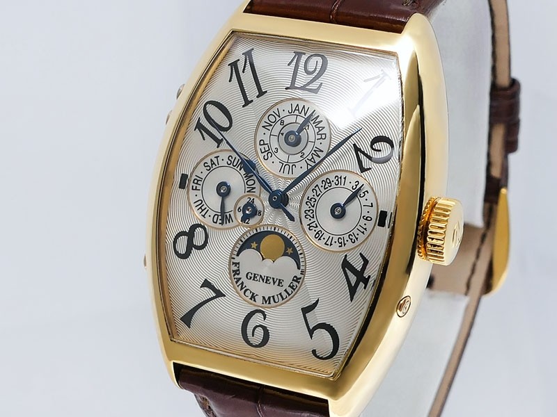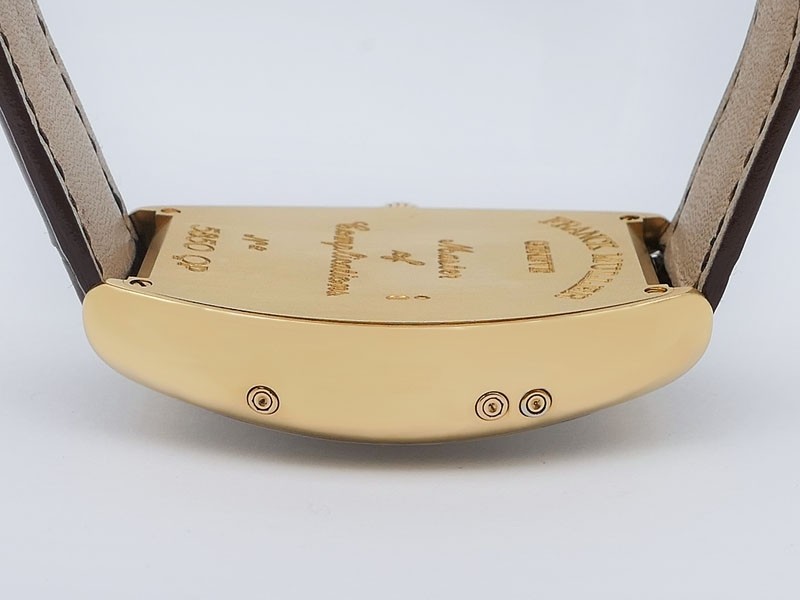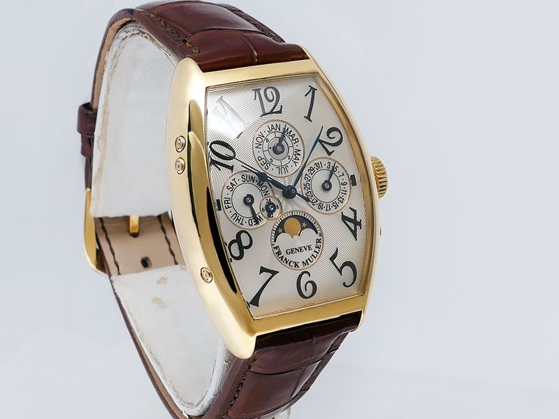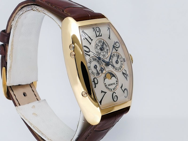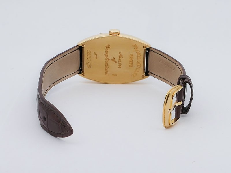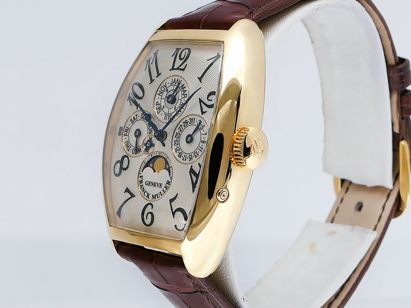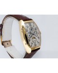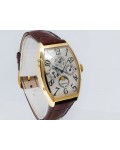 Swiss made Perpetual Luna Calendar 5850 QP crafted two body 18k Rose Gold curved tonneau shape case, reserve up to ± 42h. Silvered wave pattern Guilloché dial, calendar, 24-hour, leap year, moonphase indicators. Brown leather strap, 18k Gold Tang...| Brand | Franck Muller |