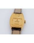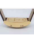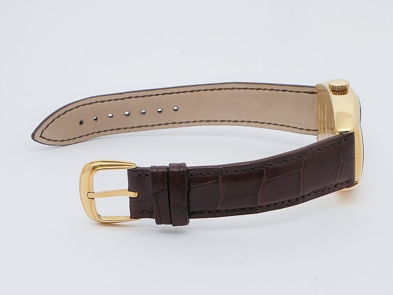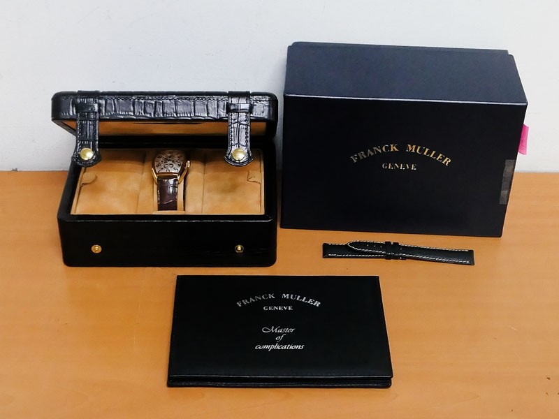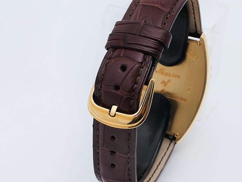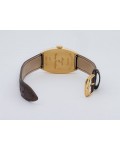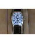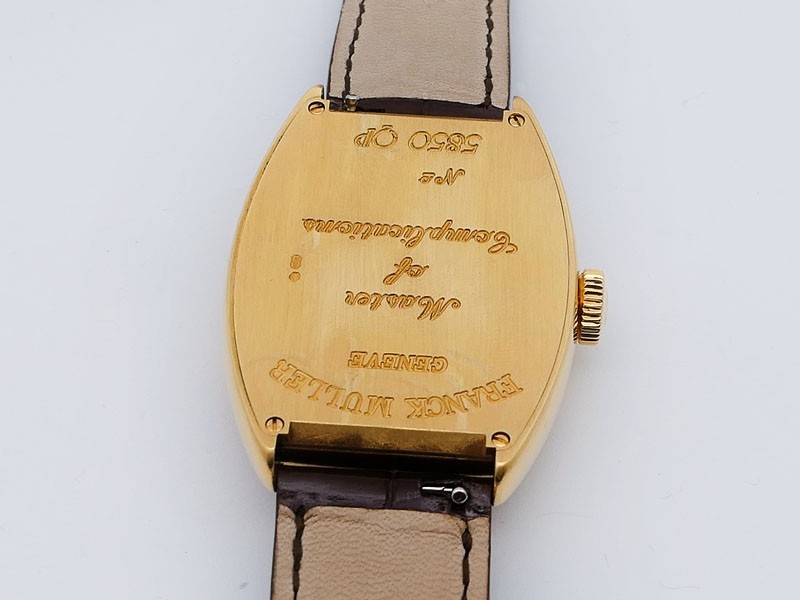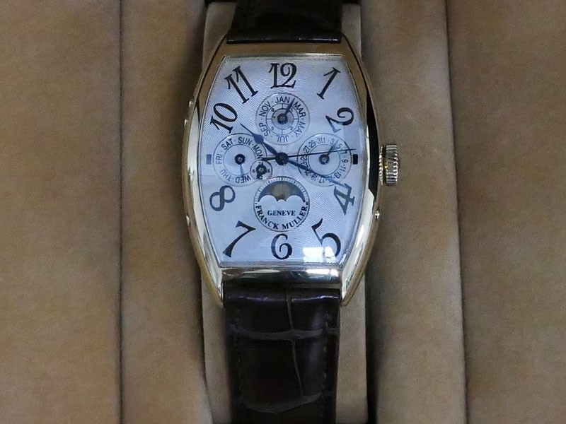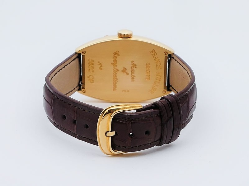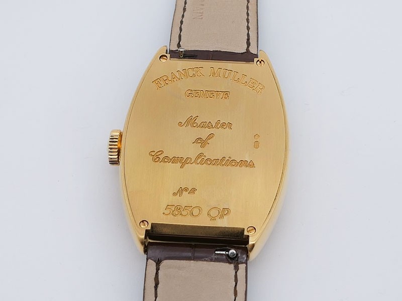 Swiss made Perpetual Luna Calendar 5850 QP crafted two body 18k Rose Gold curved tonneau shape case, reserve up to ± 42h. Silvered wave pattern Guilloché dial, calendar, 24-hour, leap year, moonphase indicators. Brown leather strap, 18k Gold Tang...| Brand | Franck Muller |