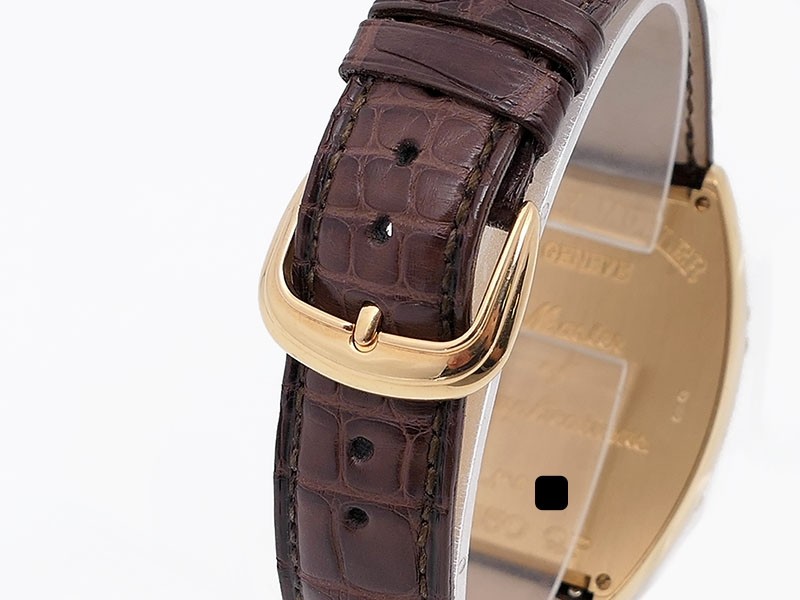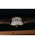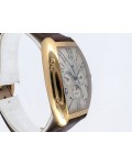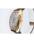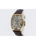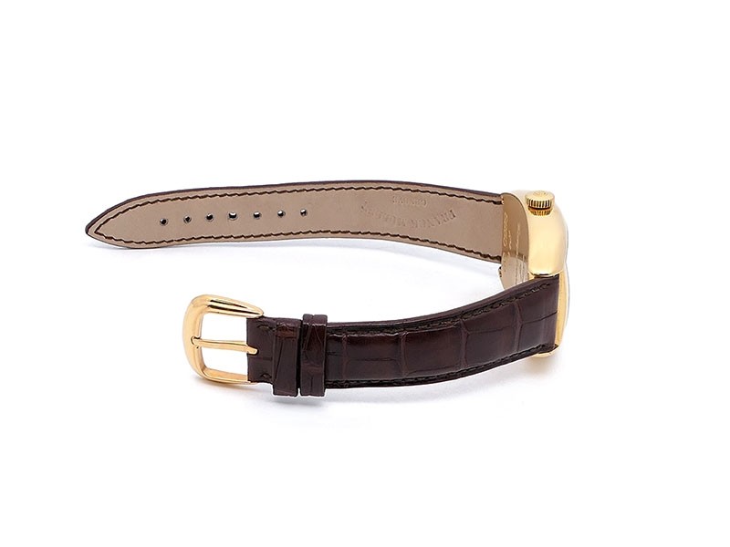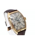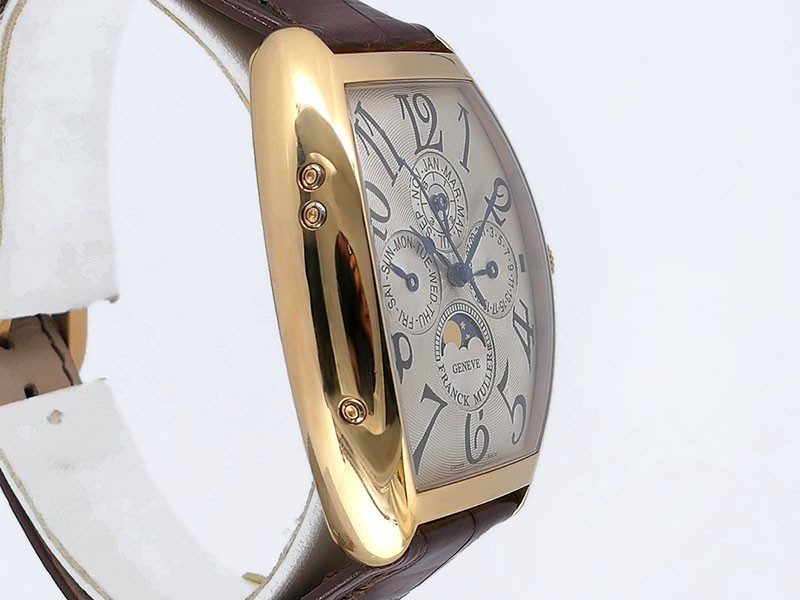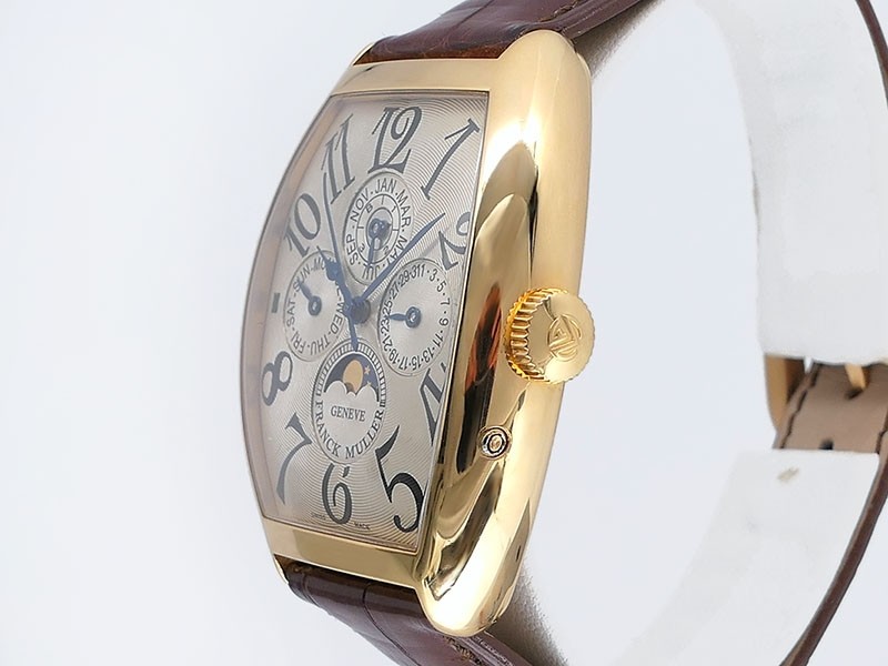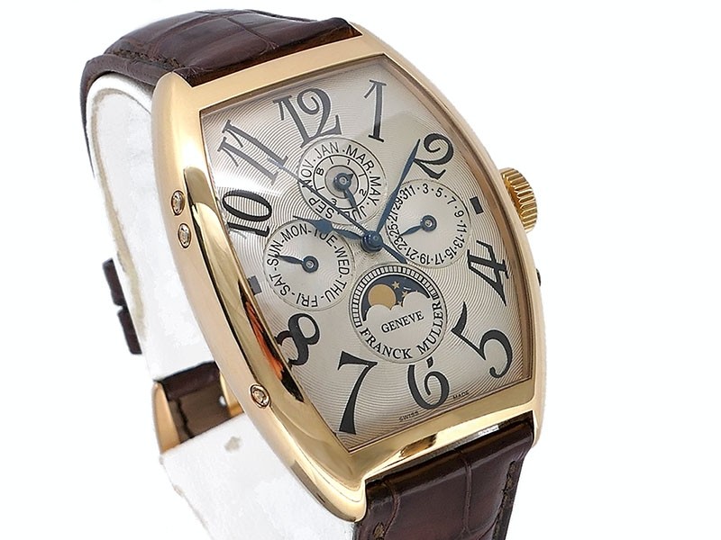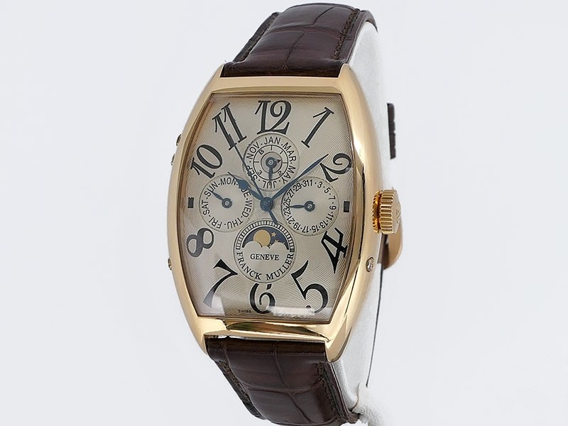 Swiss made CasaBlanca Perpetual Calendar crafted two body 18k Rose Gold curved tonneau shape case, reserve up to ± 42h.Silvered wave pattern Guilloché dial with, calendar day date mouth leap year, moon, Brown leather strap/ Gold Tang Buckle.| Brand | Franck Muller |