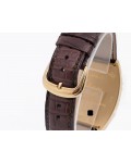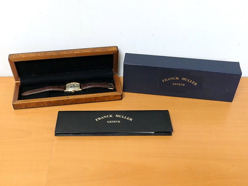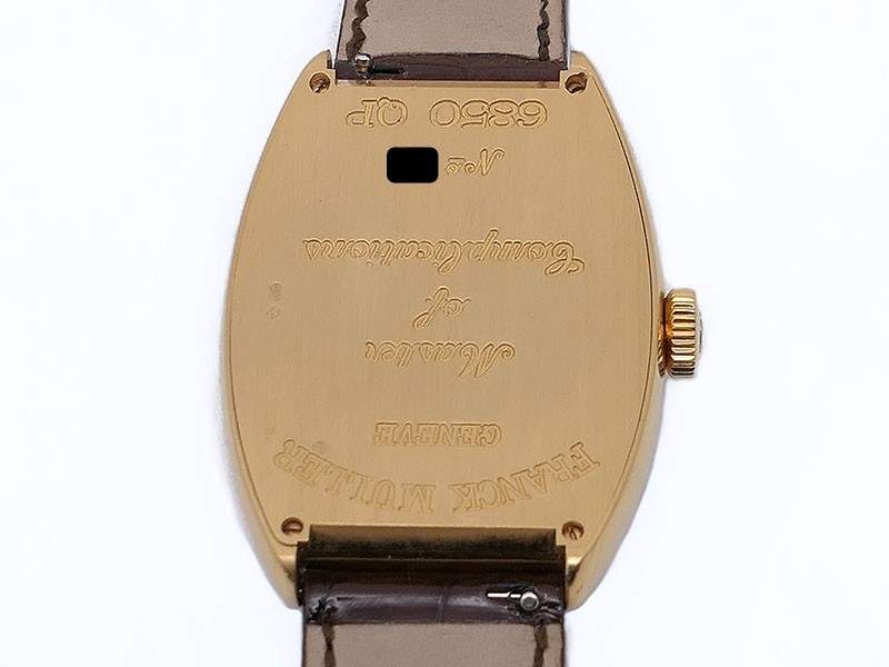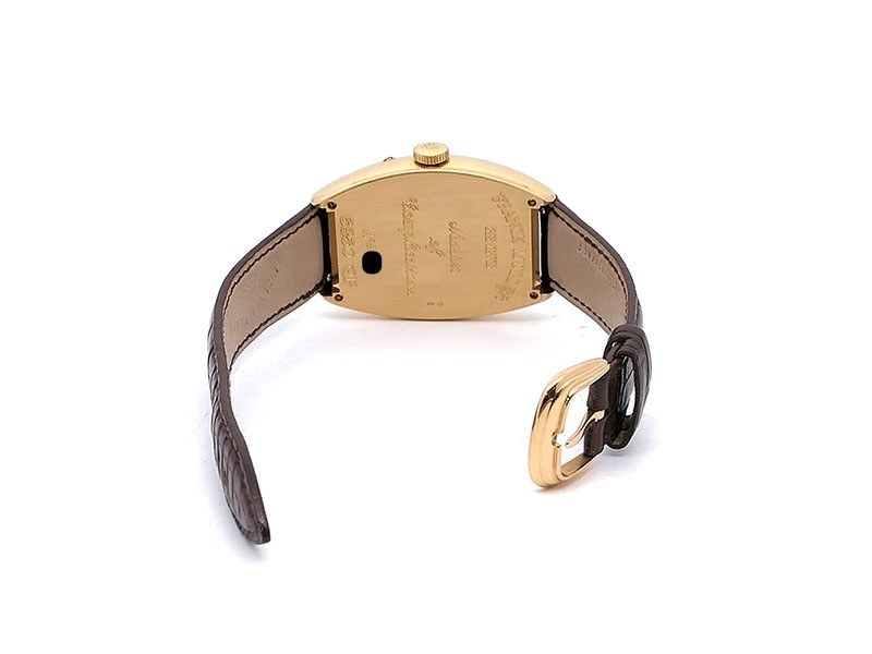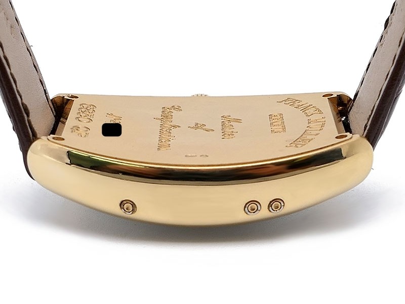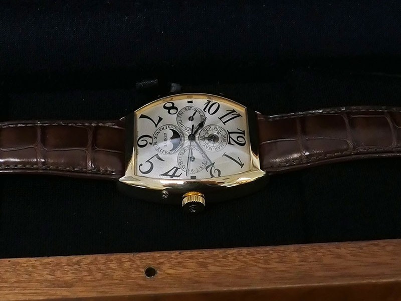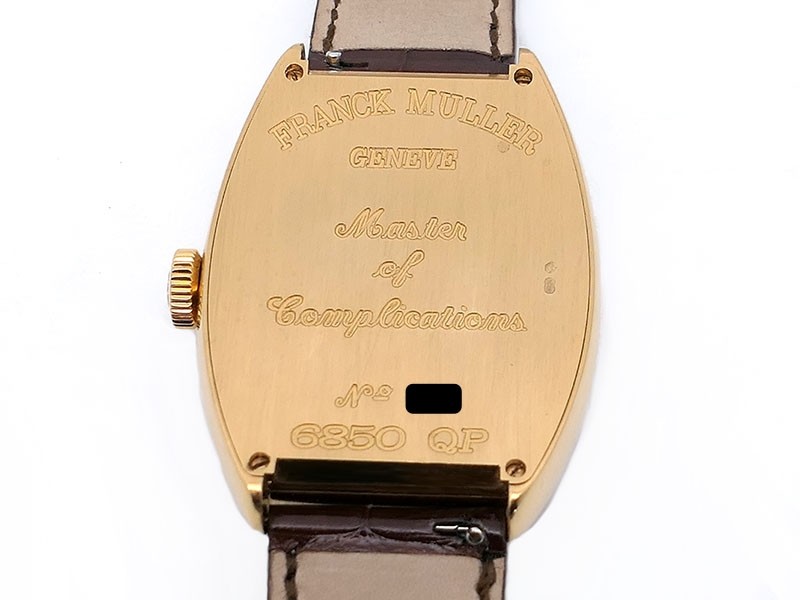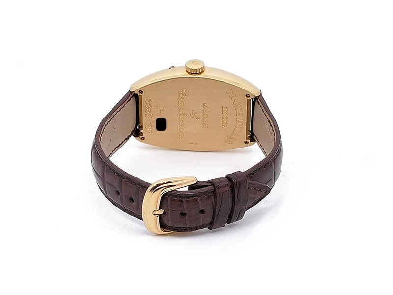 Swiss made CasaBlanca Perpetual Calendar crafted two body 18k Rose Gold curved tonneau shape case, reserve up to ± 42h.Silvered wave pattern Guilloché dial with, calendar day date mouth leap year, moon, Brown leather strap/ Gold Tang Buckle.| Brand | Franck Muller |