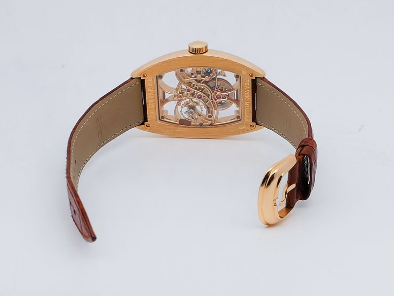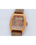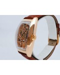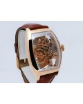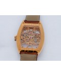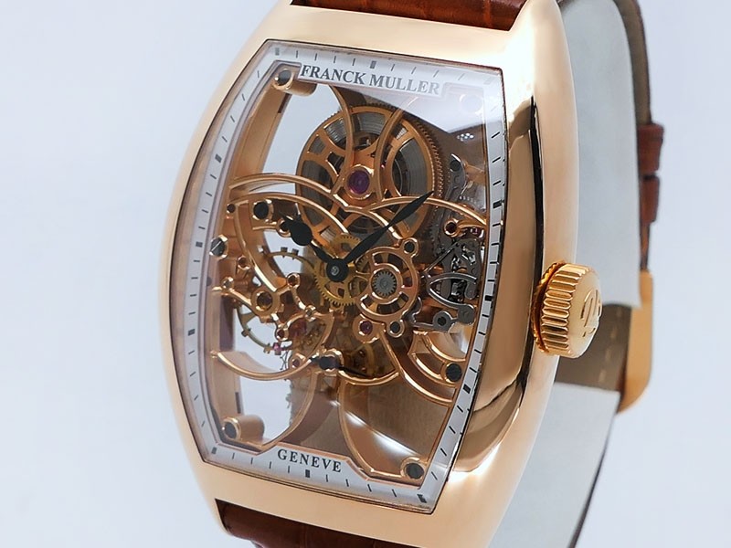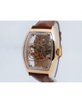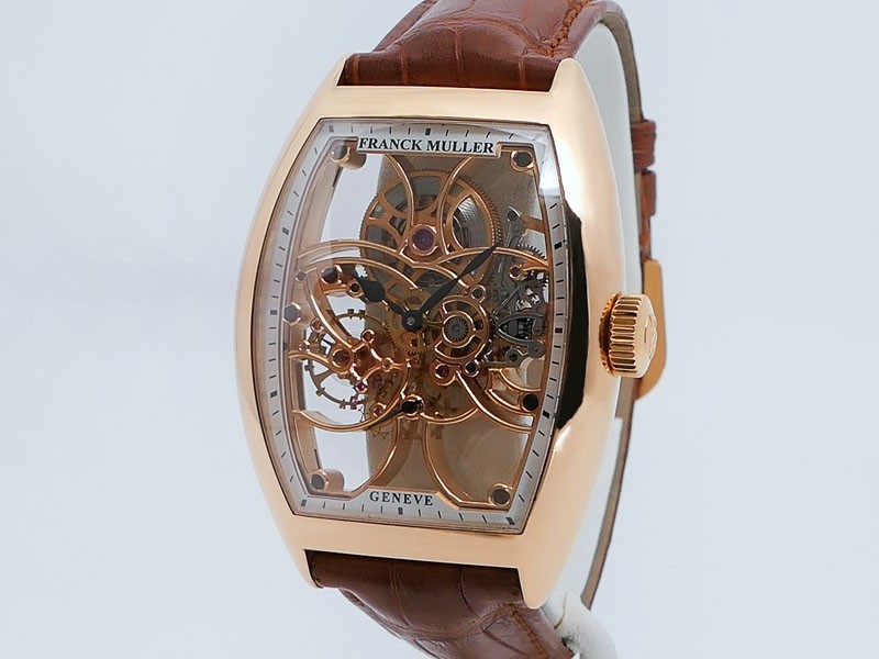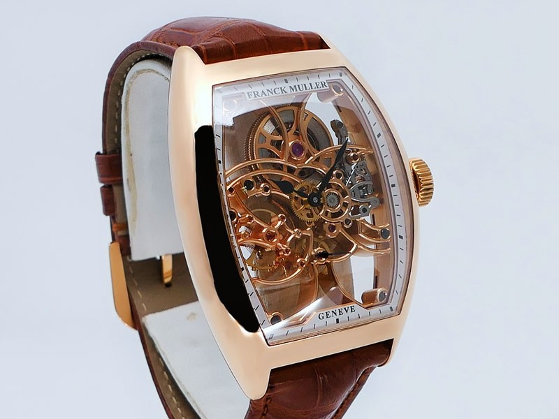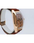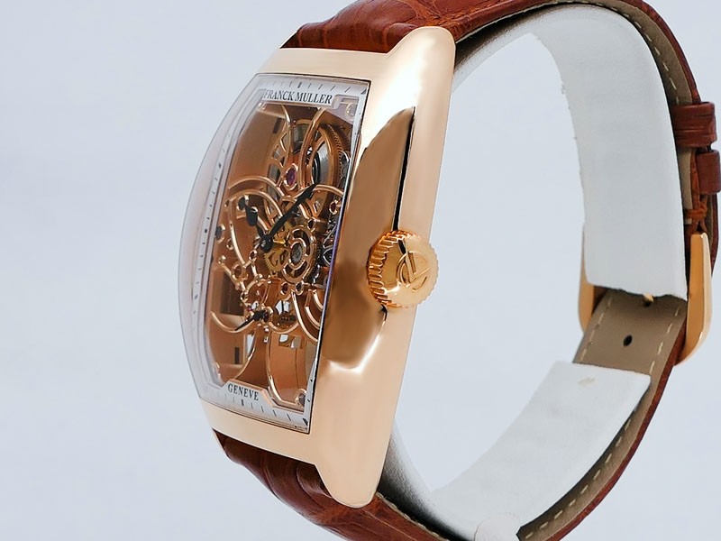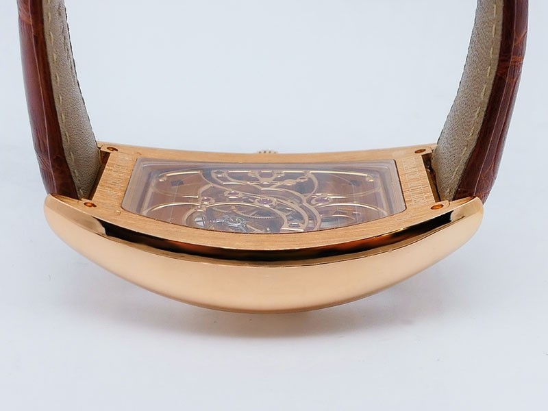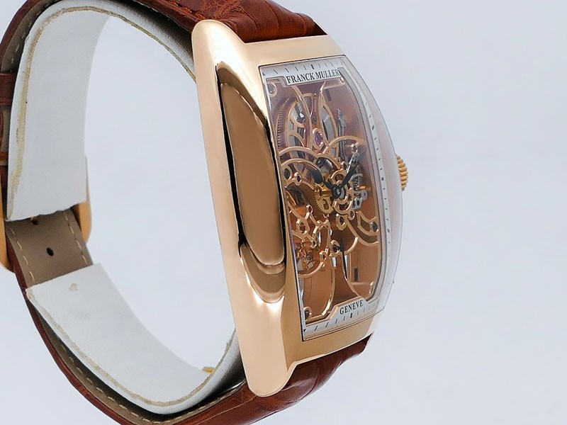 Swiss made Cintree Curvex Skeleton hand polished 18k Rose Gold Tonneau /barrel shaped case, power reserve to ± 168h/7Day. Rose Gold Skeleton Dial/ White enameled minute track. Brown hand-sewn alligator leather strap/ polished 18k Rose Gold Tang ...| Brand | Franck Muller |