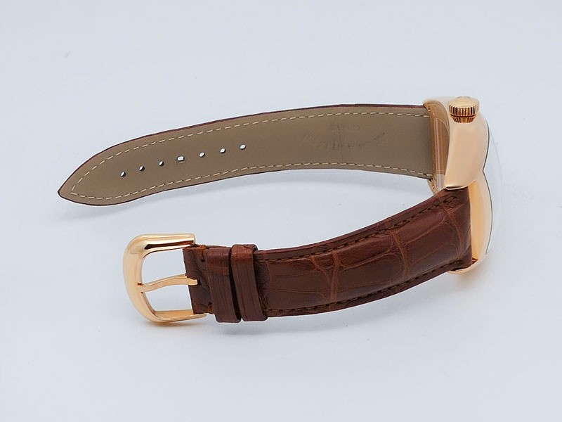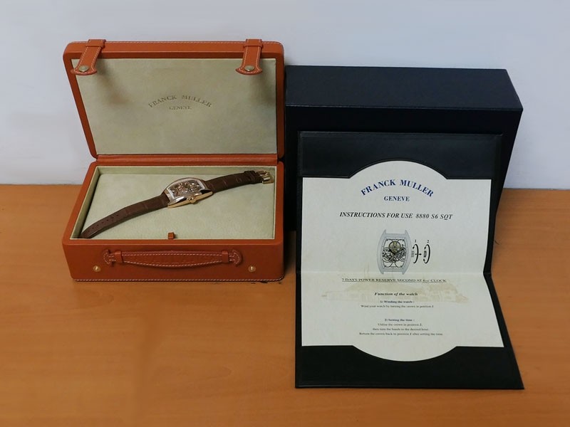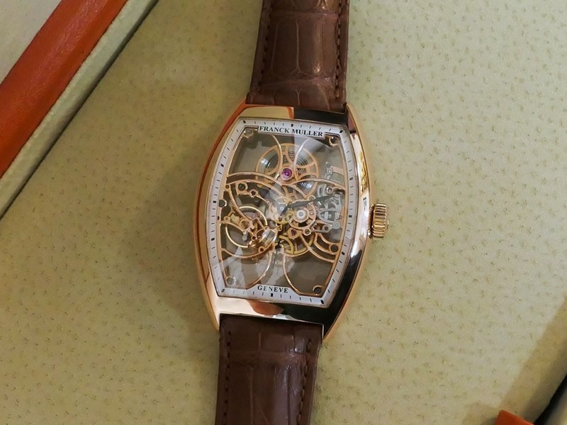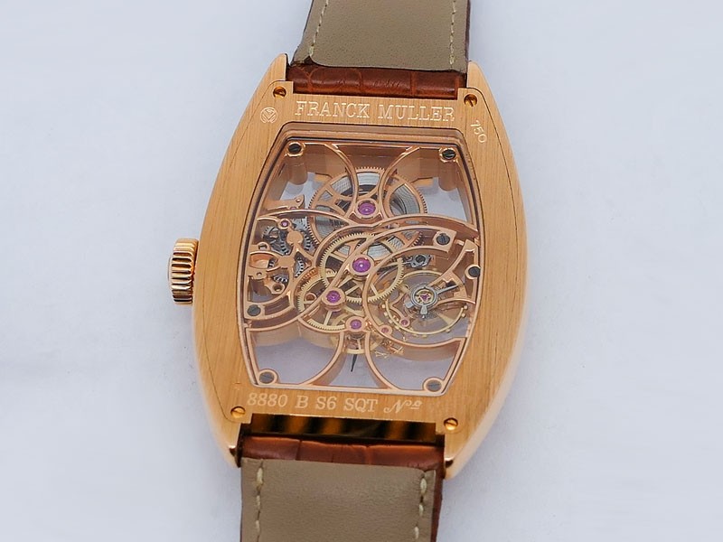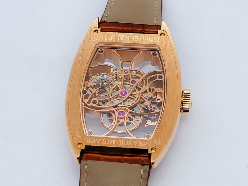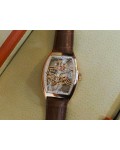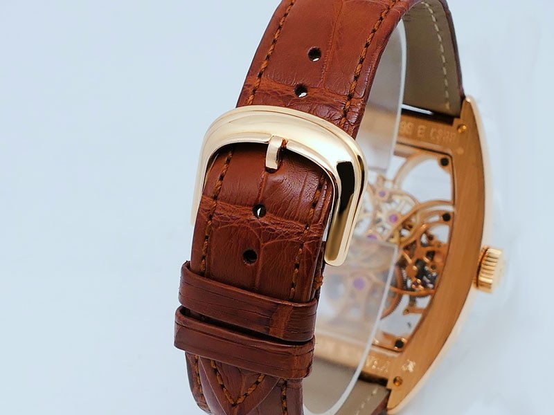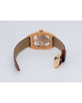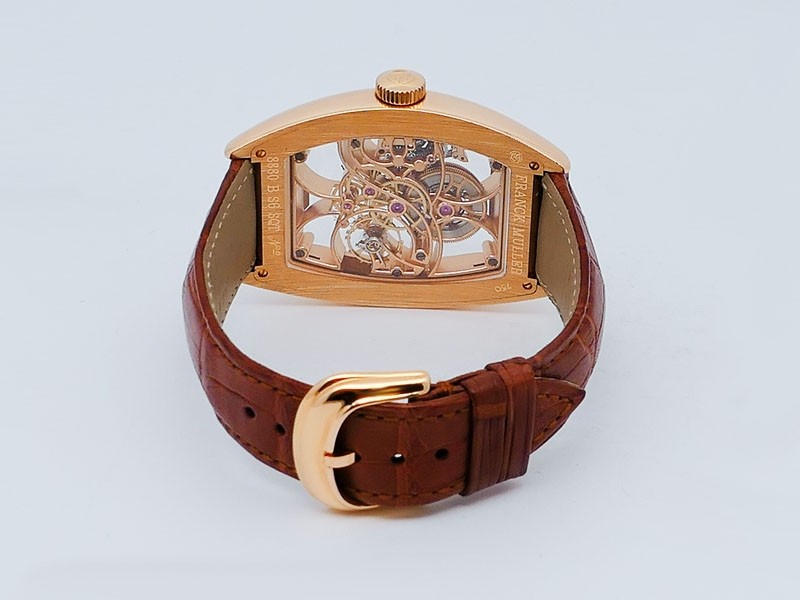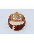 Swiss made Cintree Curvex Skeleton hand polished 18k Rose Gold Tonneau /barrel shaped case, power reserve to ± 168h/7Day. Rose Gold Skeleton Dial/ White enameled minute track. Brown hand-sewn alligator leather strap/ polished 18k Rose Gold Tang ...| Brand | Franck Muller |