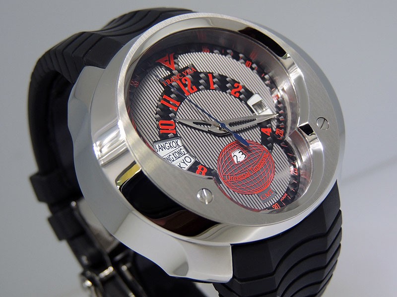 Swiss made Franc Vila FVa5 Universal Timezone GMT SS Elliptical circular shape case,Auto/MVT, PR. Grey vertical pattern dial, DateTimezone GMT 24 time zones.Black Rubber "cut" strap with a matching "FV" butterfly Deployment Buckle.