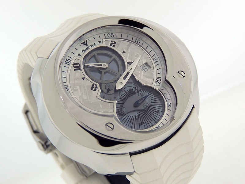 Swiss made Column Regulator "Esprit Unique” Meteorite/white dial, middle in three sub-dial parts, Date, Titanium/DieHard Steel elliptic shaped case, reserve up to ± 42 hours.Tire tread White Rubber & Tire Tread Black straps with FV Deployment Bu...| Brand | Franc Vila |