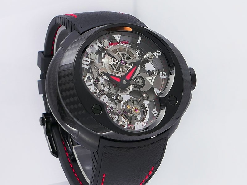 Swiss made Cobra Suspended Skeleton Carbon Fiber, Titanium, "DLC Die Hard Extreme Steel" Black elliptical/circular shaped case reserve to ± 45h Displays a Time only Black, silver Skeleton dial with Black Rubber /red stitching , "cut" strap with...| Brand | Franc Vila |