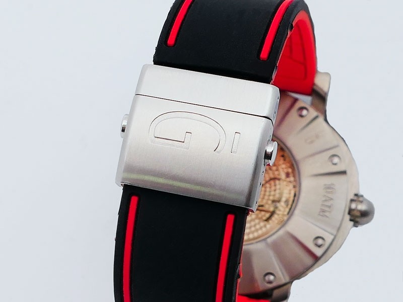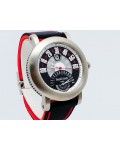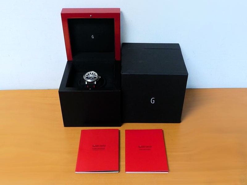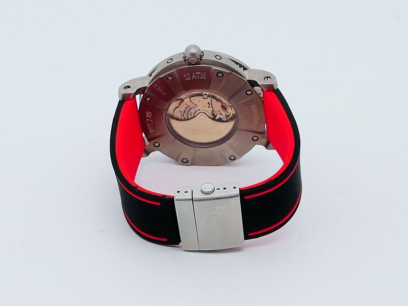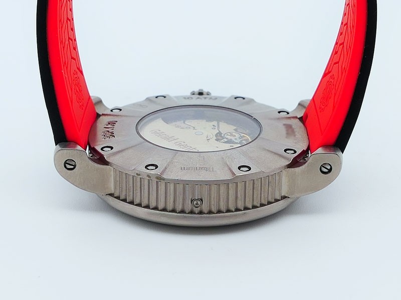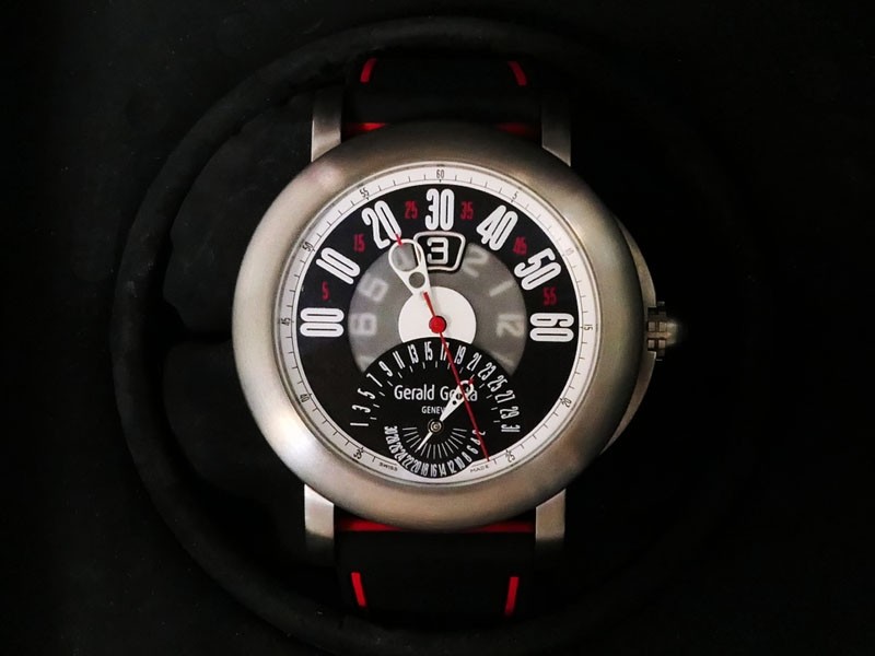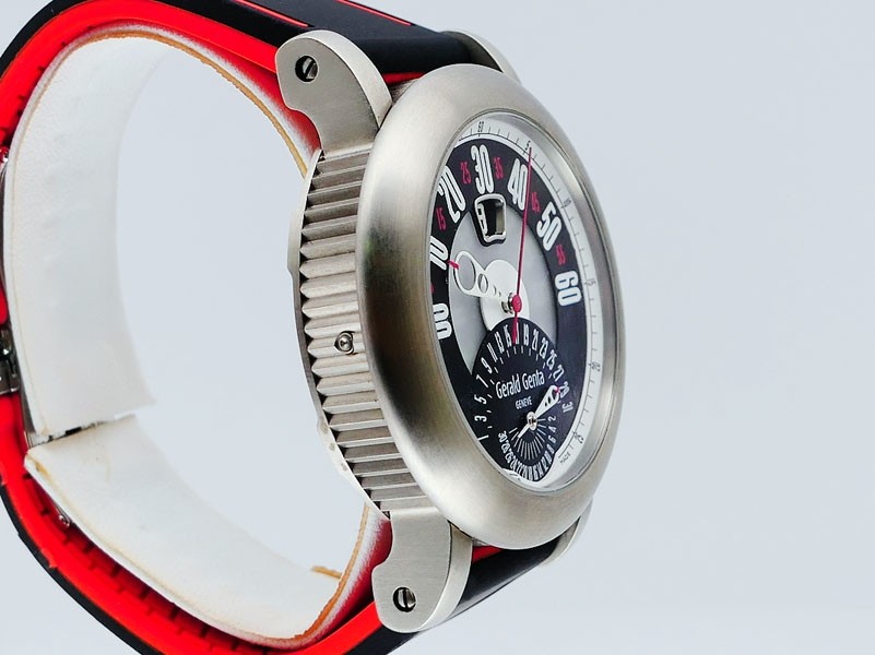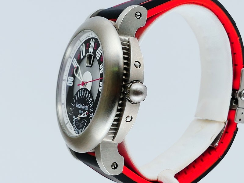 Swiss made Gérald Genta Arena Bi-Retro Sport in brushed Titanium round shape case, , PR to ± 40 hours. Black/Grey/White dial, Jump Hours with Retrograde Minutes, Retrograde Date Indicator. Black Rubber strap with GG Double Folding Deployment B...| Brand | Gerald Genta |