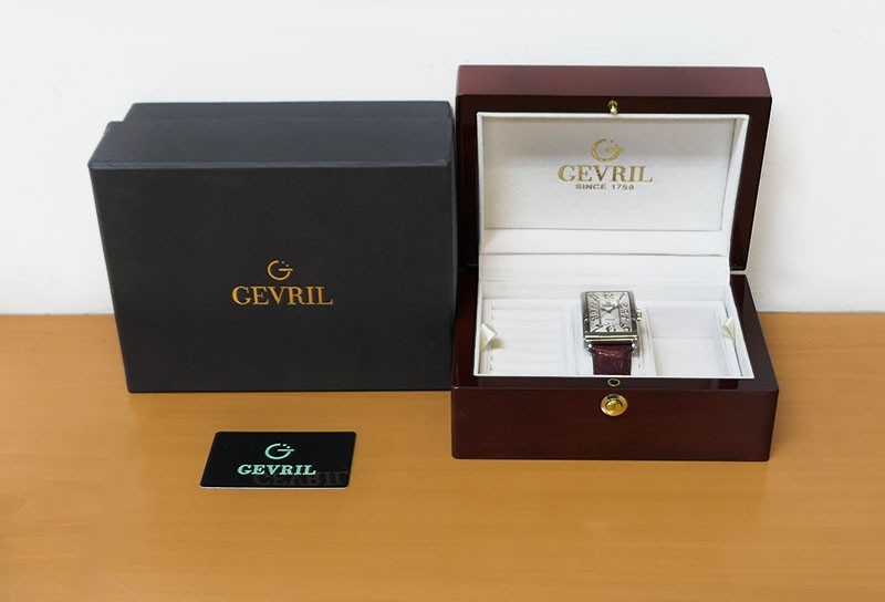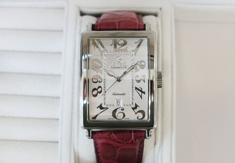 Swiss Handcrafted Avenue of Americas Automatic Date polished finished Stainless Steel rectangular shaped case, reserve up to ± 42 hours. White gorgeous guilloche design dial with Date, . Red crocodile leather strap with Gevril Tang Pin Buckle...| Brand | Gevril |