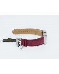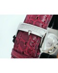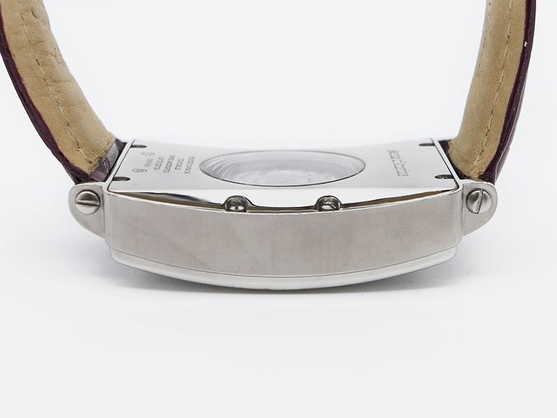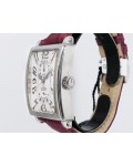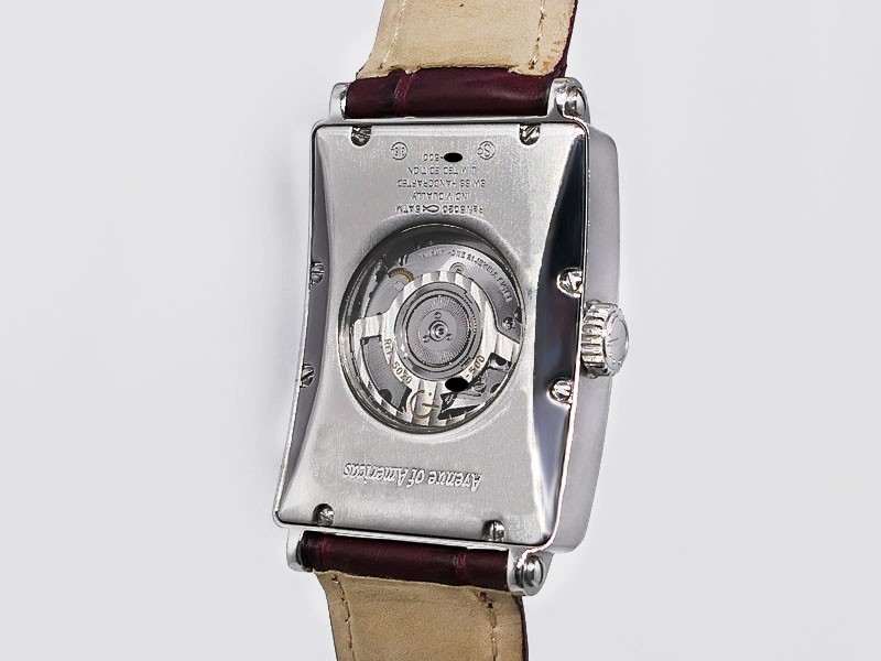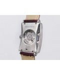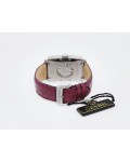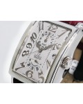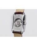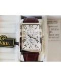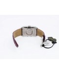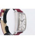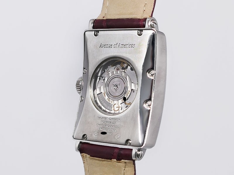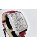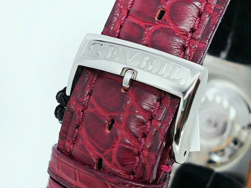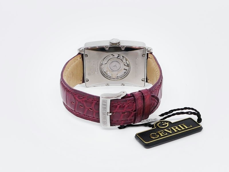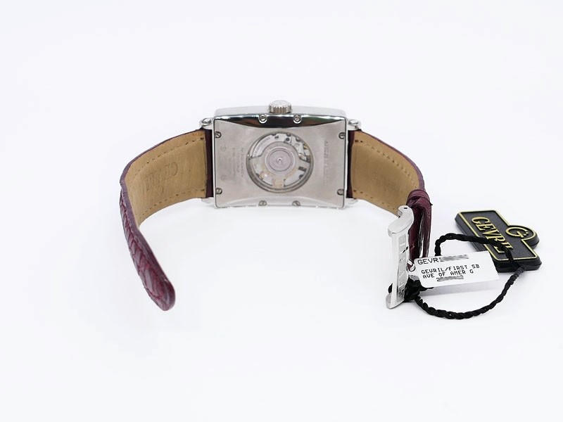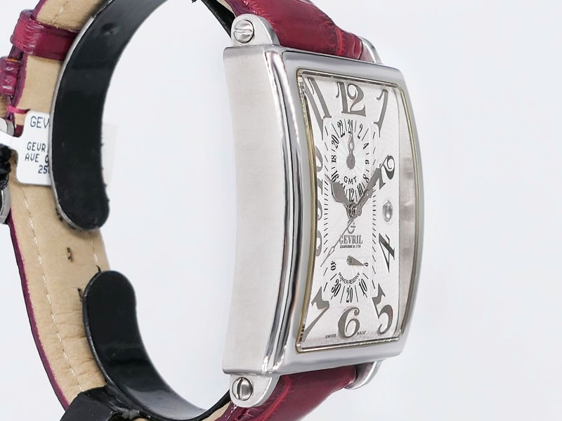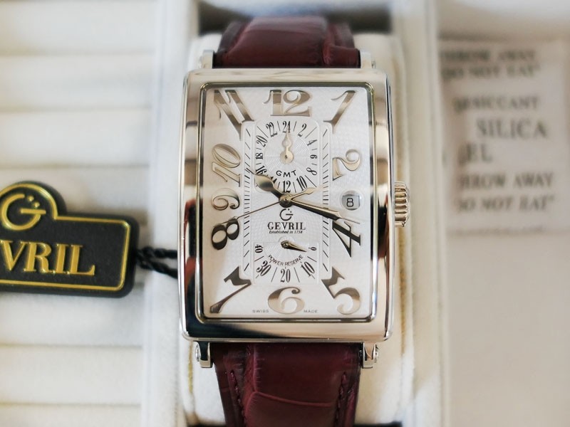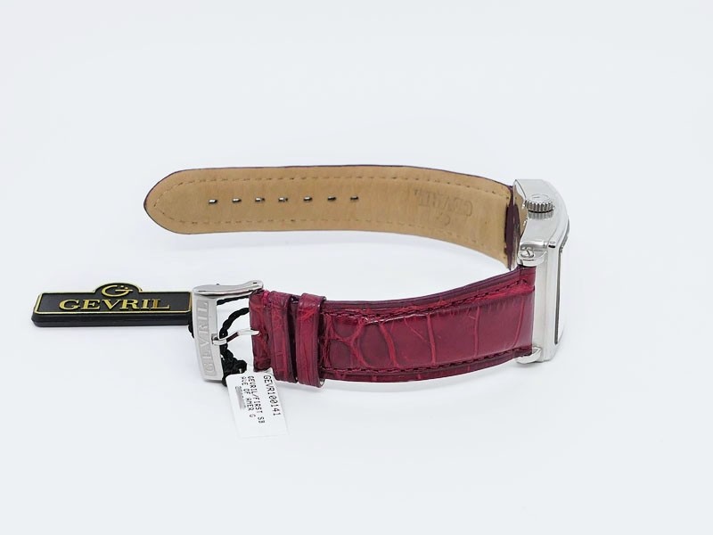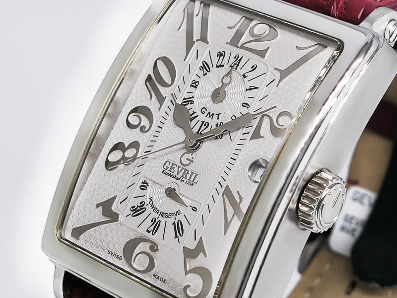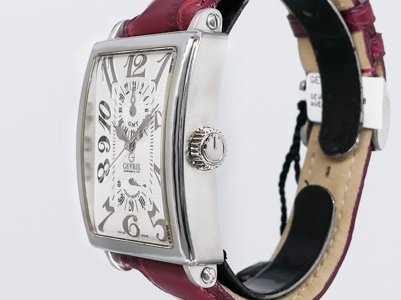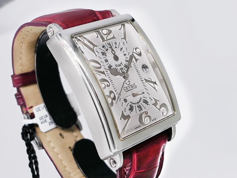Swiss made GMT Power Reserve Date 5020 LTD tall rectangle Stainless Steel case, reserve up to 40h/. White illustrated patterned Guilloche Dial with applied bold scripted Arabic numeral, Red Crocodile leather strap with Gevril Tang Buckle.