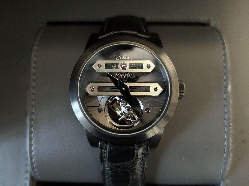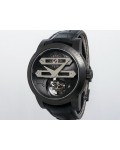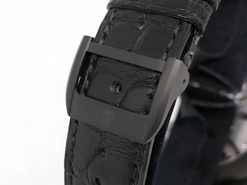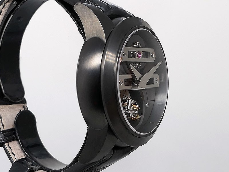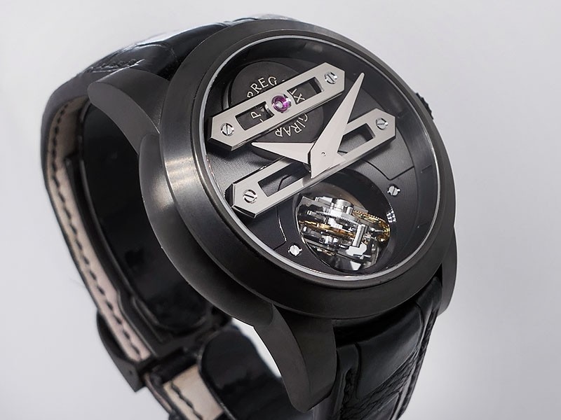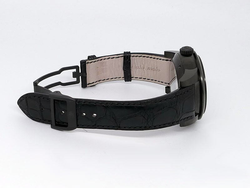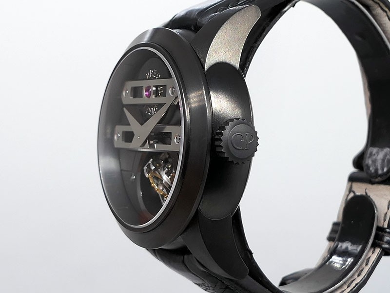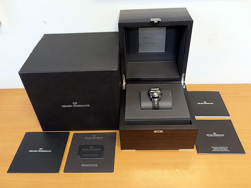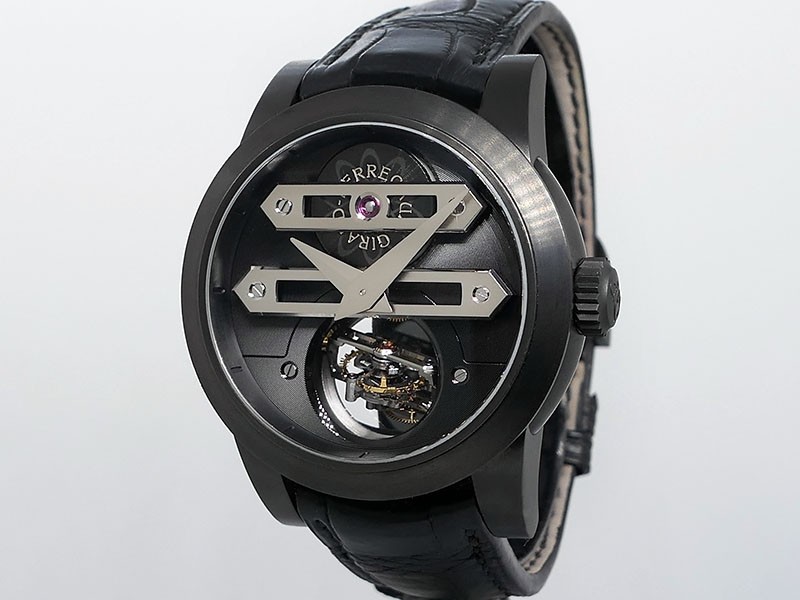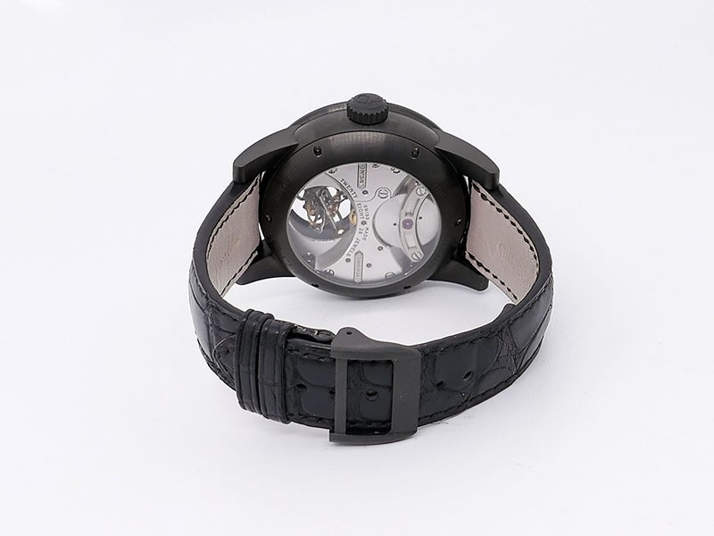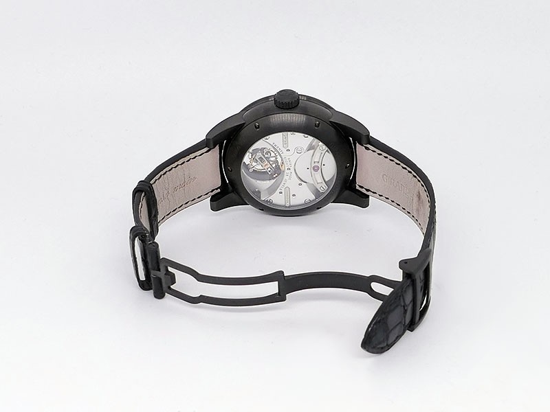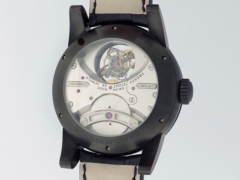 Swiss made Bi-Axial Tourbillon, crafted black ADLC Titanium round shaped case, reserve up to ± 72 hours. Displays a Black textured dial, Open tourbillon small second display. Black Crocodile leather strap with Titanium and DLC Deployment buckle...| Brand | Girard Perregaux |