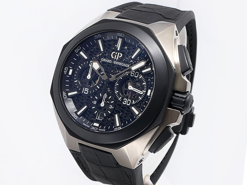 Swiss made Sea Hawk Traveler Chronograph Titanium/Ceramic round shaped case, measuring 44mm diameter. Fixed black Ceramic bezel.reserve to ± 46h .Black Partially Transparent dial/ date, Chronograph. Black leather strap with push button release...| Brand | Girard Perregaux |