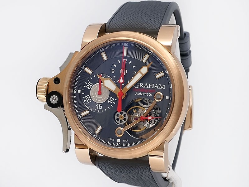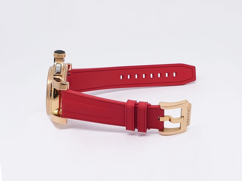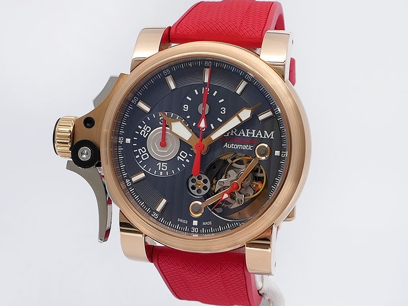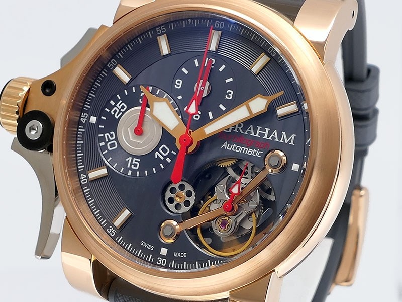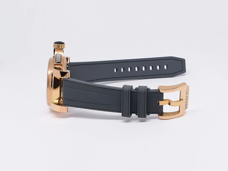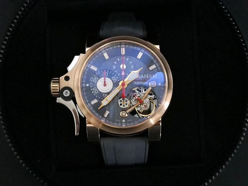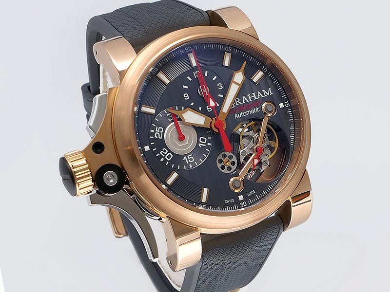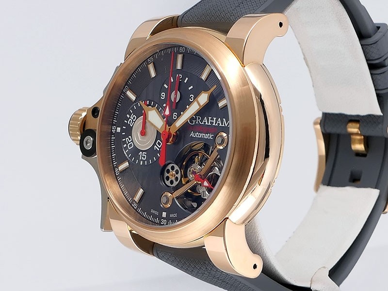 Swiss made Tourbillograph “TRIGGER’ Havana 18k Rose Gold round shaped case, reserve to ± 48h, Black grey dial / "trigger" uses to mitigate lag in timing, start/stop the Chronograph, tourbillon escapement carriage, Grey/Red Rubber,black leather...| Brand | Graham |