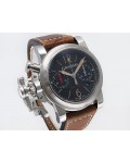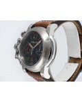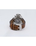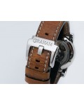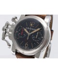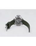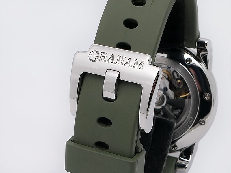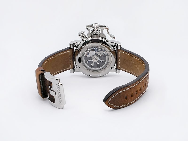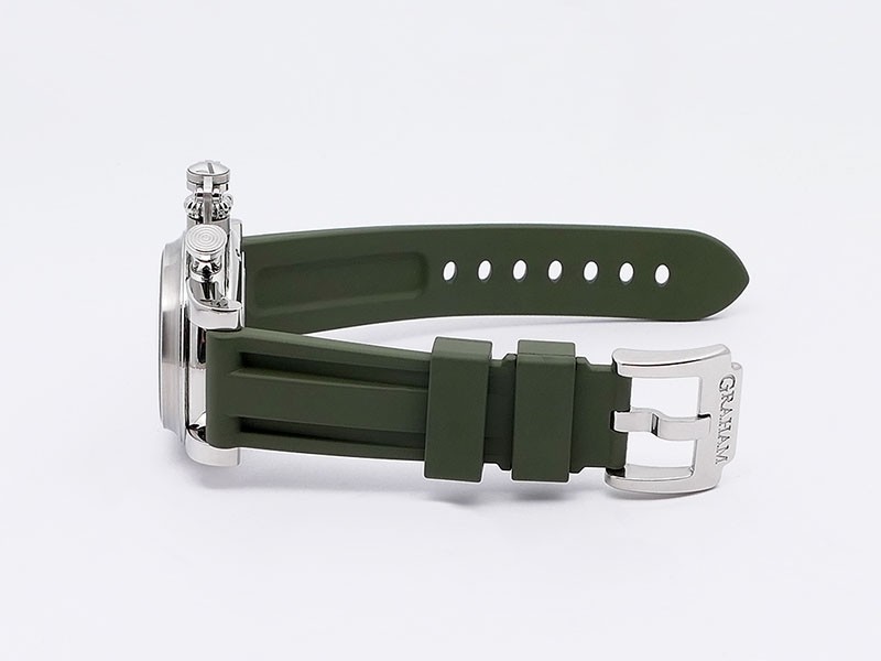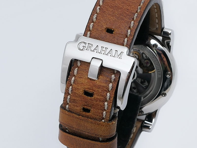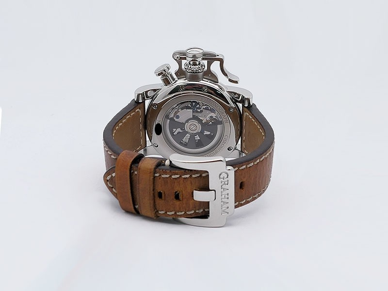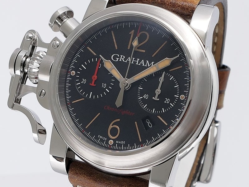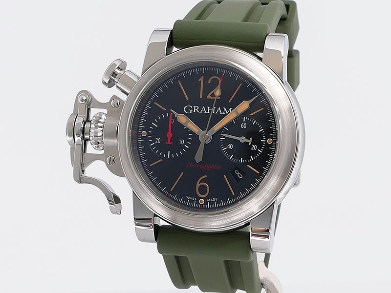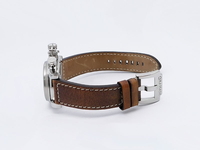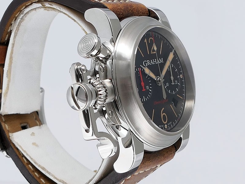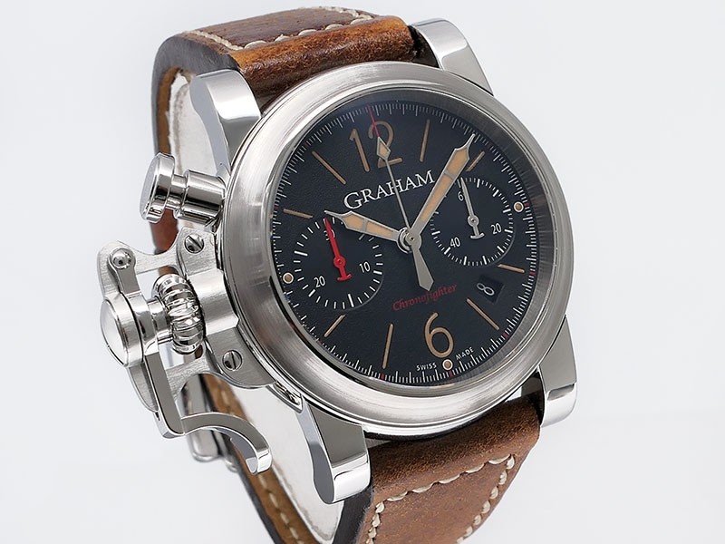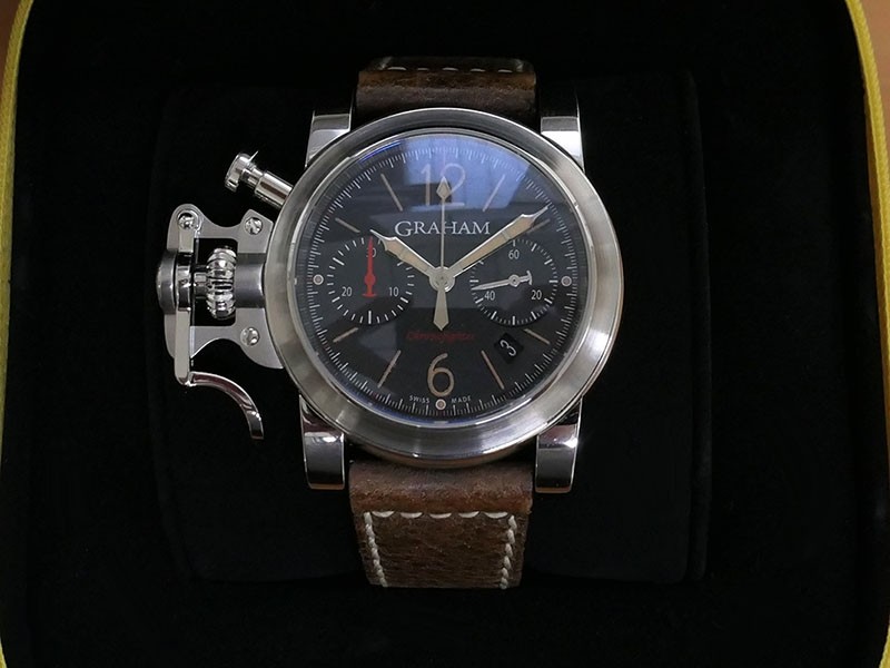 Swiss made Chronograph Fortress Steel round shaped case, reserve to ± 48h. Black dial/Chronograph, Date, trigger Start & stop lever/ integrated reset pusher/ crown guard. Bomber jacket Brown Leather + military green Rubber straps/Tang buckle.| Brand | Graham |