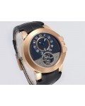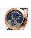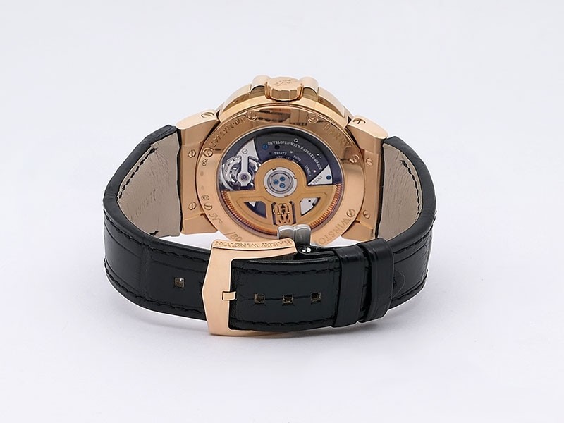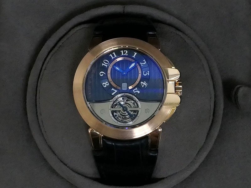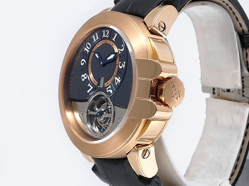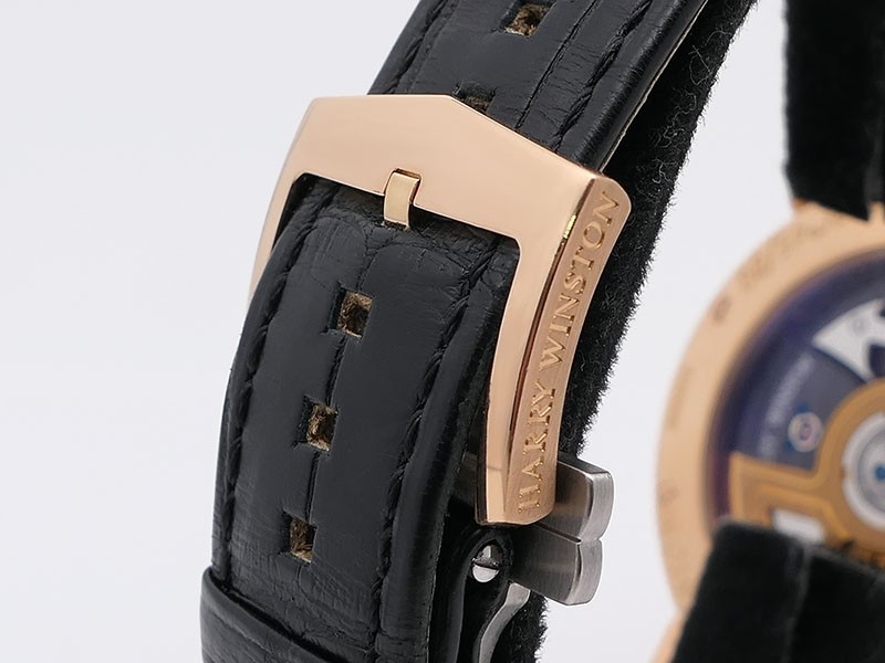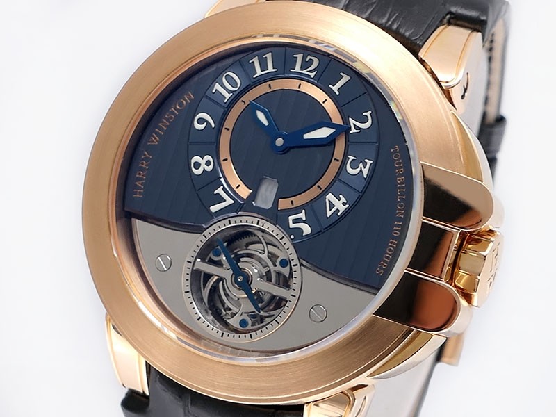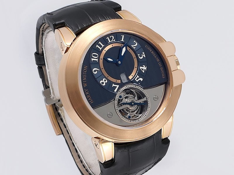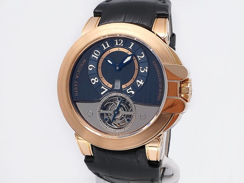 Swiss made Ocean Tourbillon Z3 18k Rose Gold round shaped case ,reserve to 110h. Blue/grey eccentric time dial, Low Power warning/one minute tourbillon carriage. Black leather/Rubber straps/ RG Harry Winston Deployment buckle.| Brand | Harry Winston |