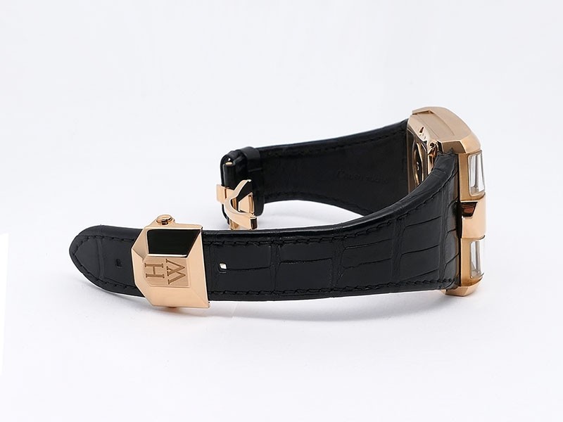 Swiss made Tourbillon 18k Rose Gold rectangular shaped case power reserve to ± 120 h. Skeletonized dial, one-minute tourbillion, power reserve, Black leather strap/ HW 18k Rose Gold Deployment Buckle. #1 of 25 LE pieces.| Brand | Harry Winston |