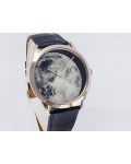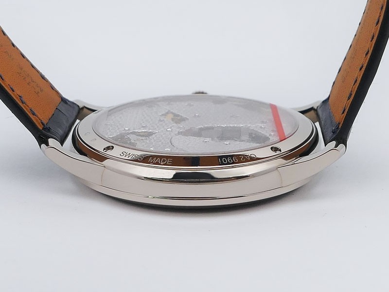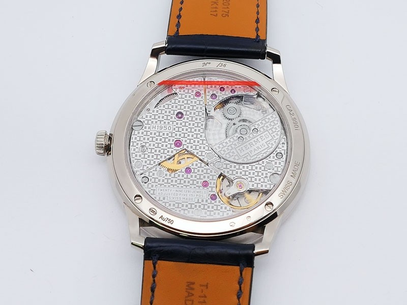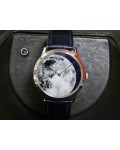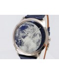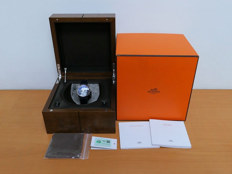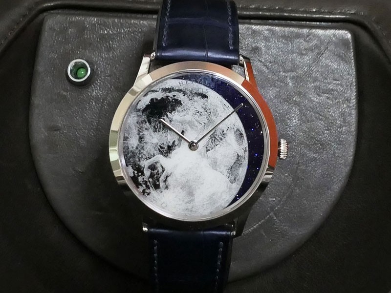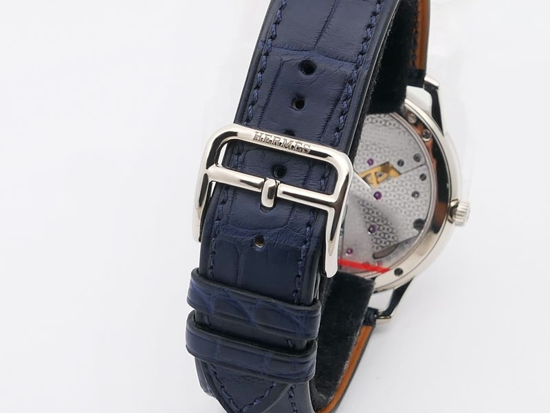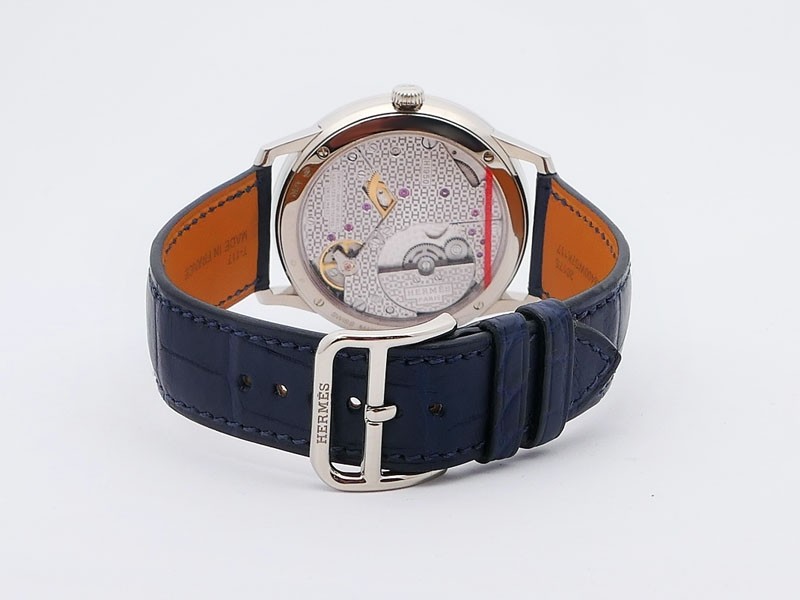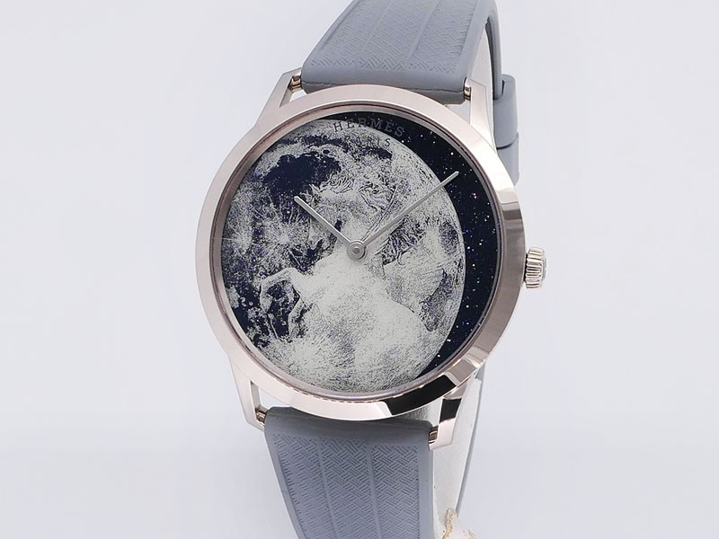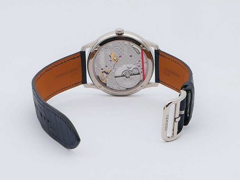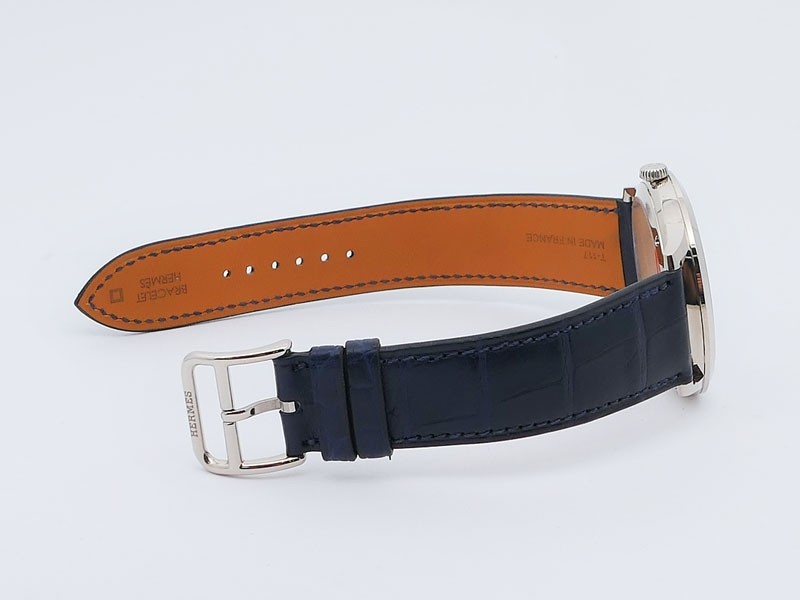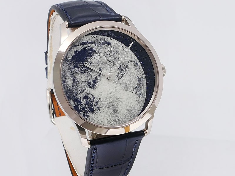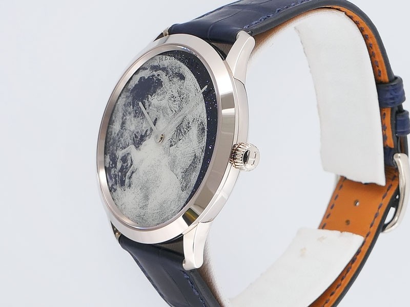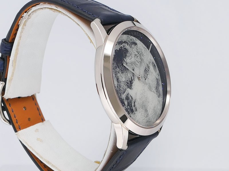 Swiss made Slim d'Hermes Clair De Lune 18k White Gold case, microrotor, reserve to ± 42h, Artistic hand-painted Navy Blue aventurine dial, starry night backdrop/Blue &White (shadow& light) moonlit Pegasus motif. Blue Crocodile leather/Grey Rubber...| Brand | Hermes |