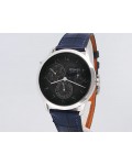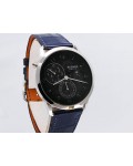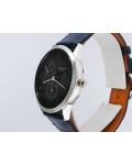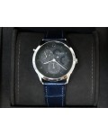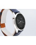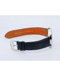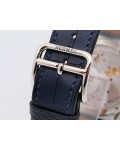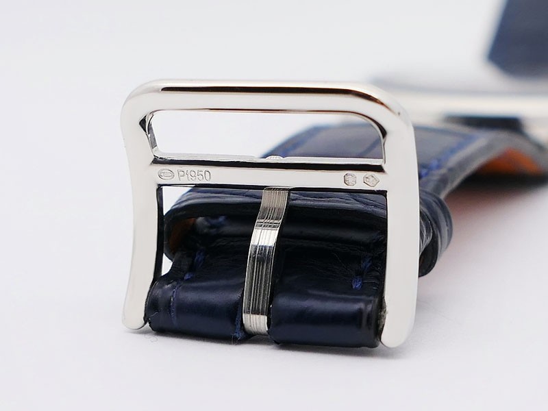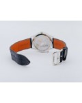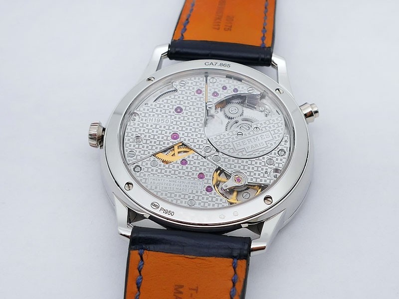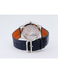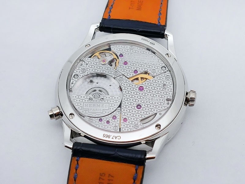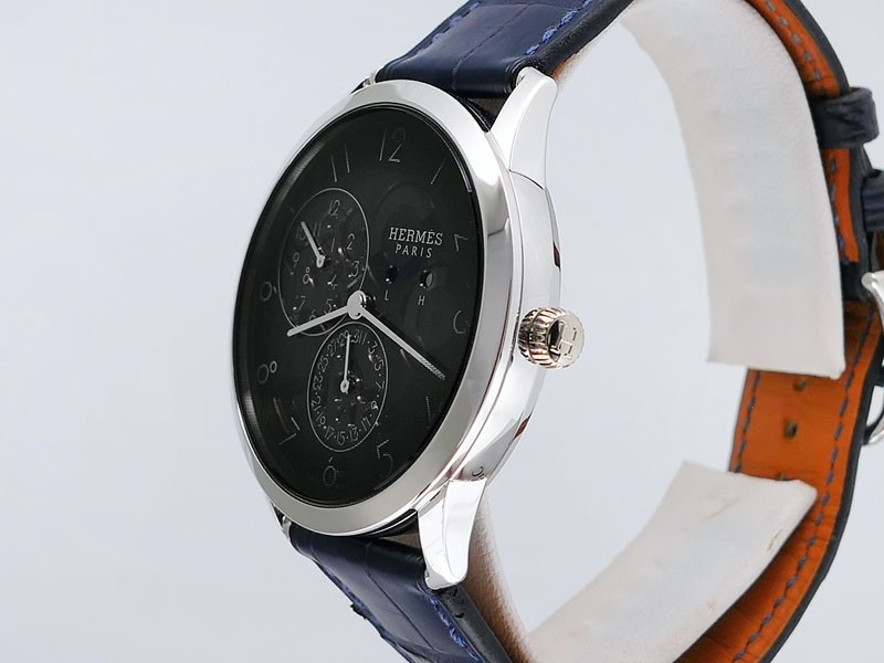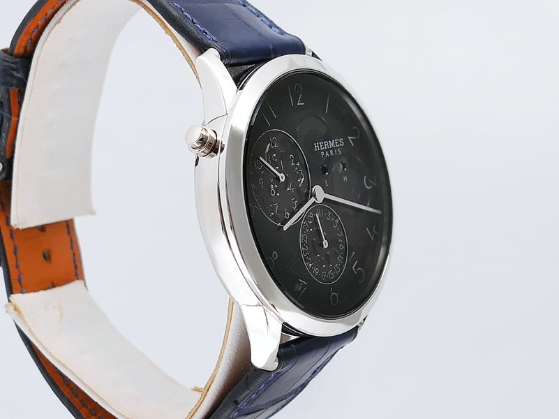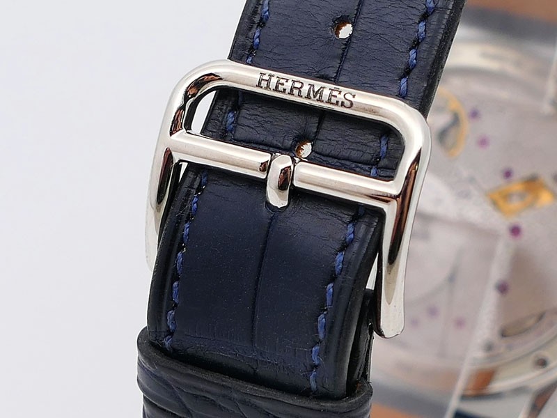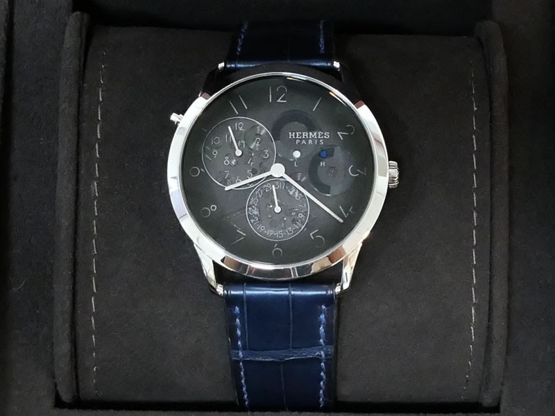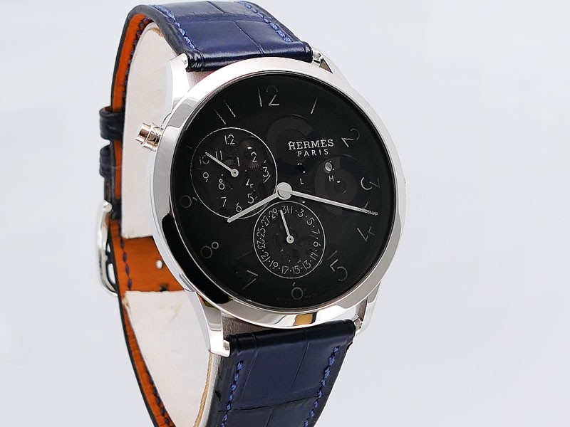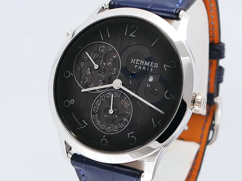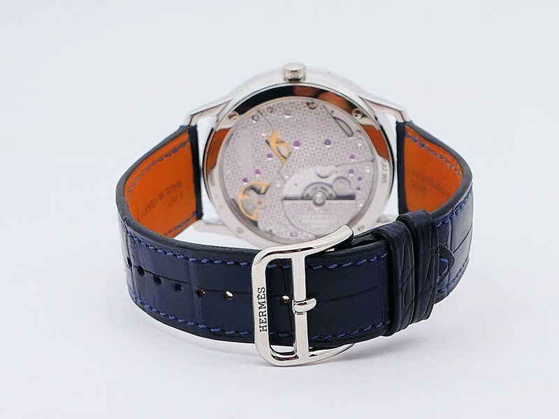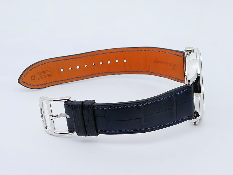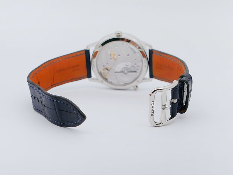 Swiss made Slim d'Hermes GMT ultra-thin Platinum round shaped slightly curved case, reserve to ± 42h. Translucent Black Smoked dial/ GMT, day/night indicator, date. Blue Alligator leather strap with Platinum Tang Buckle.| Brand | Hermes |