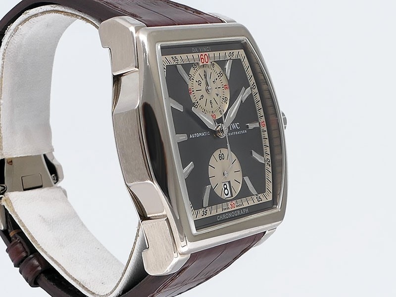 Swiss made Da Vince Chronograph with Flyback function 18k White Gold tonneau-shaped case, reserve to 68h. Ardoise dial / fly-back chronograph. Date, Brown leather strap/Crocodile pattern, "IWC" Deployment Buckle.| Brand | IWC |